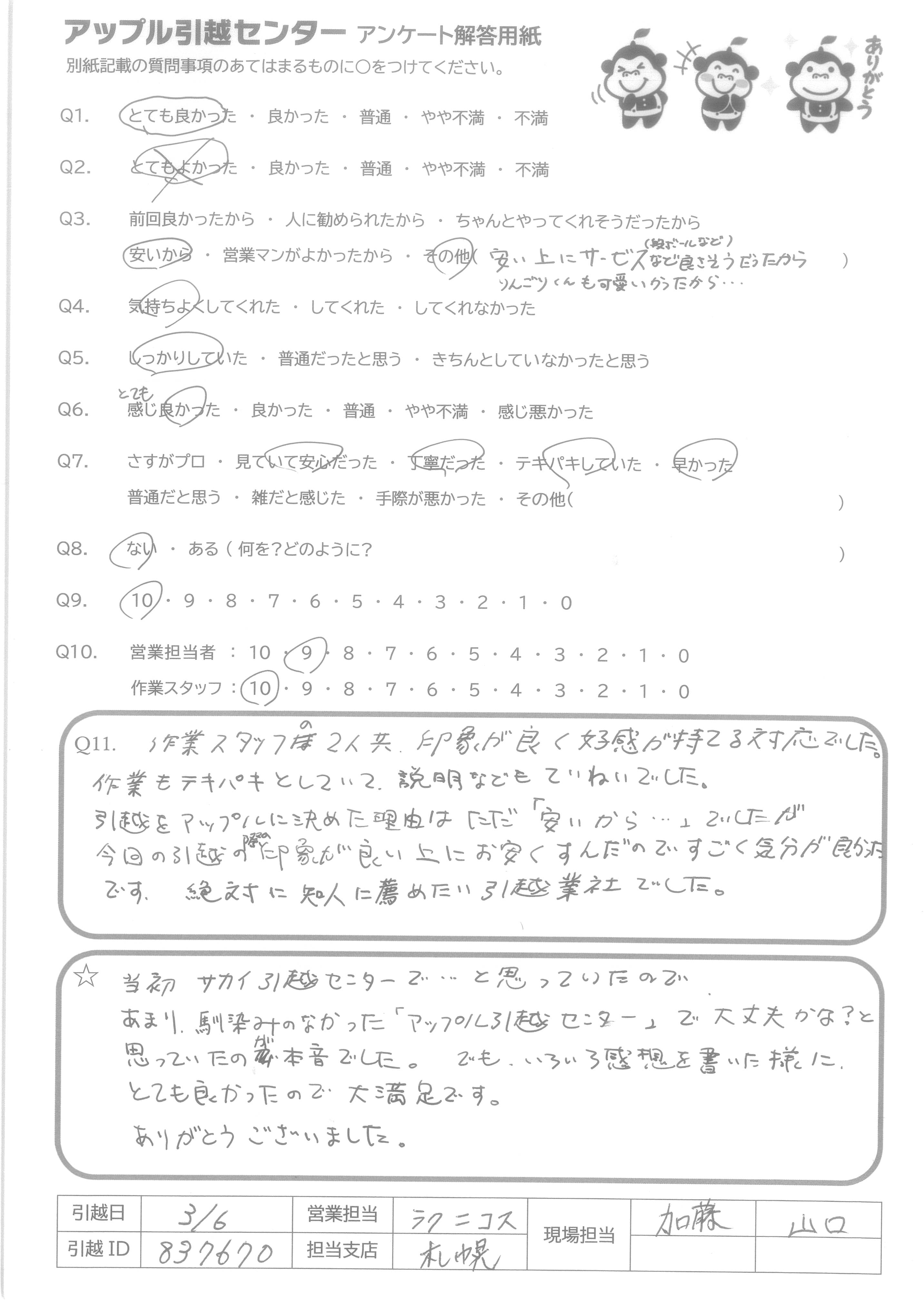 A.予約~引越当日まで、いつも親切に対応していただき、ありがとうございました。 あまり引越をしたことがなく、わからないことばかりでしたが、説明(料金・荷物の引取、ダンボール等について)を詳しくして頂き、安心して引越を行うことが出来ました。 当日の現場担当の方は、とても明るくあいさつをして頂き、またテキパキと荷物を運んでおり、とても素敵でした!!(これからも頑張って下さい)りんごり君のぬいぐるみ、お待ちしています!