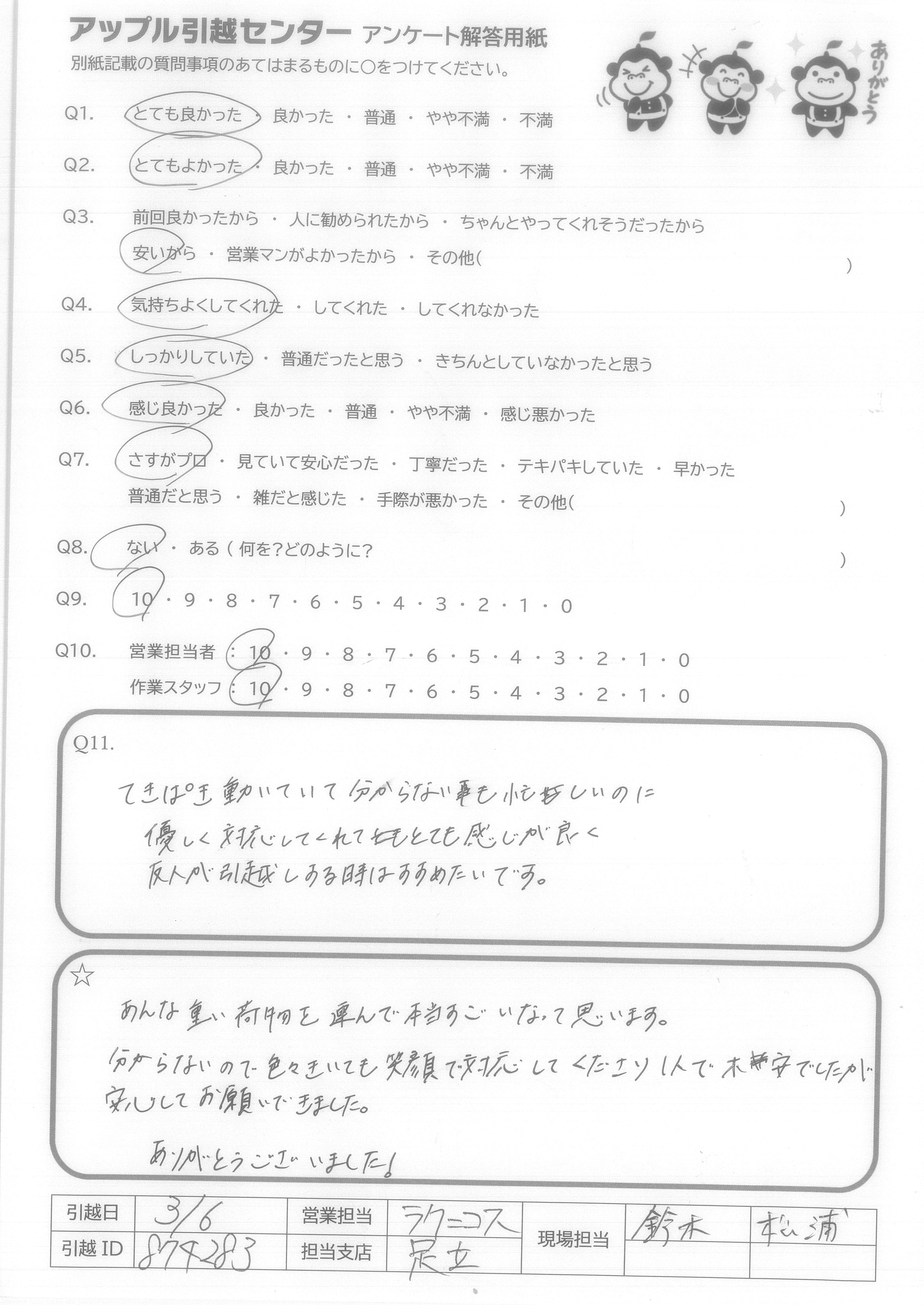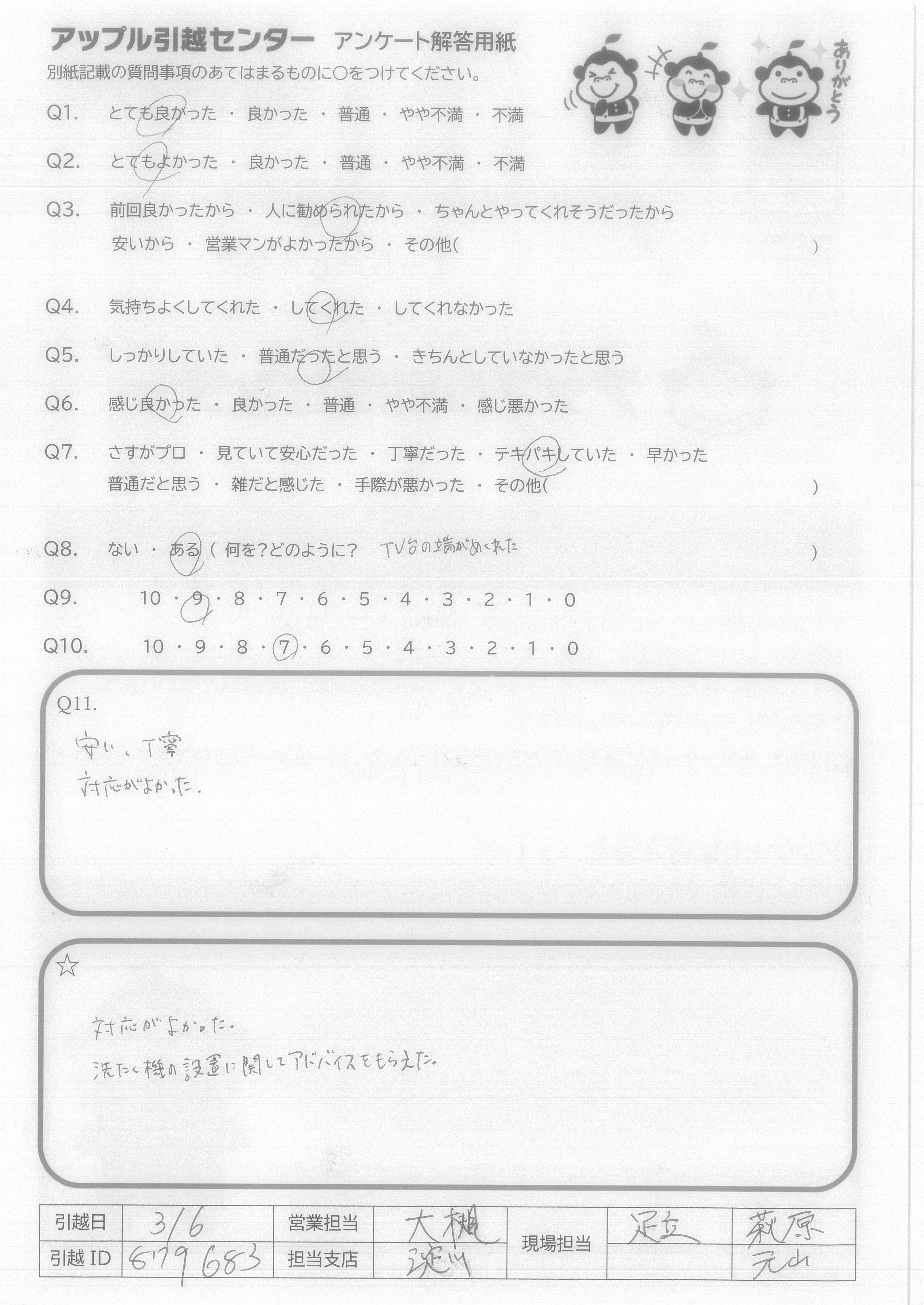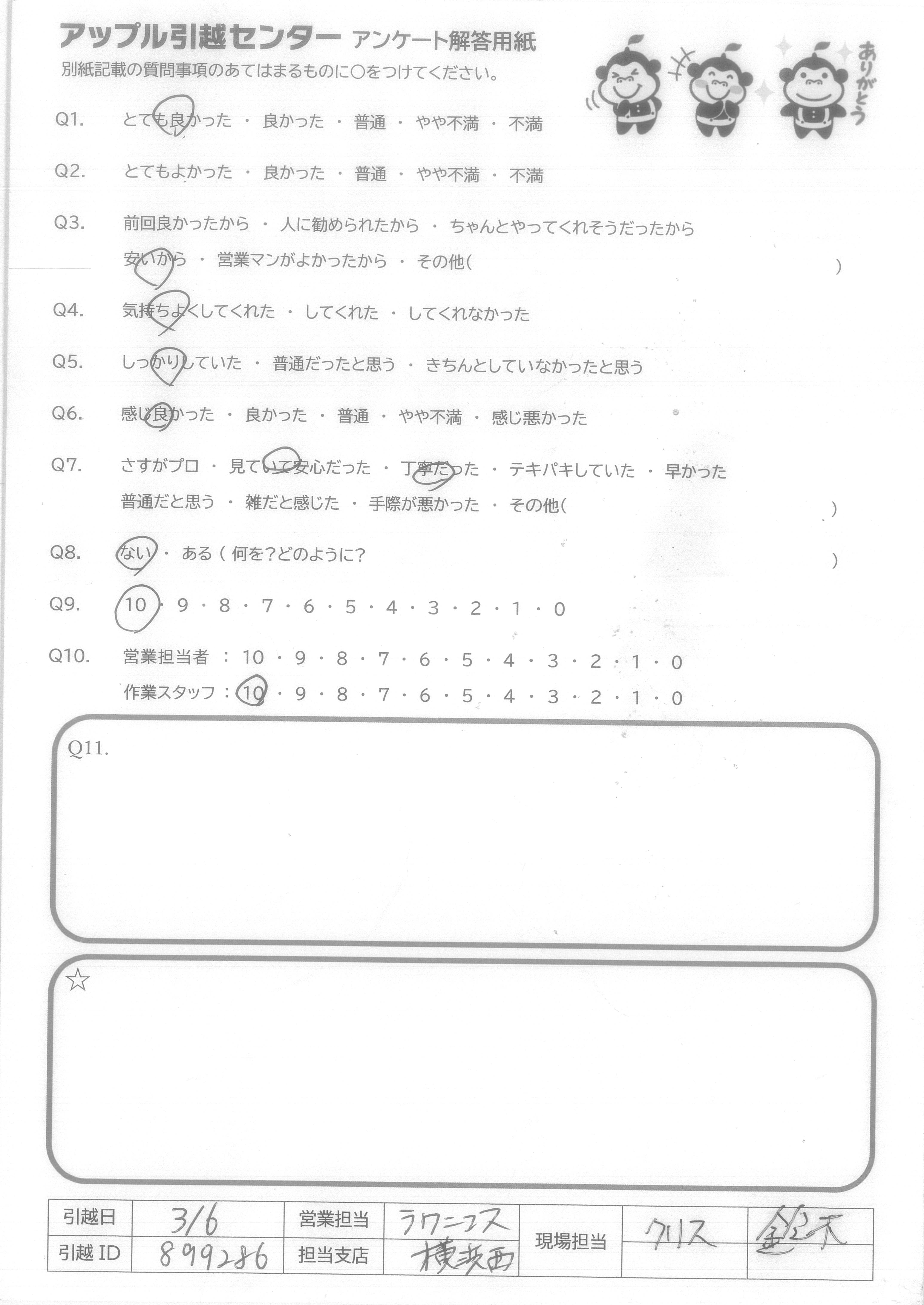 A.前回の方より感じの良い方達だったので、気持ちよくお願いすることができました。また引越しする際は利用すると思います。ありがとうございました。
