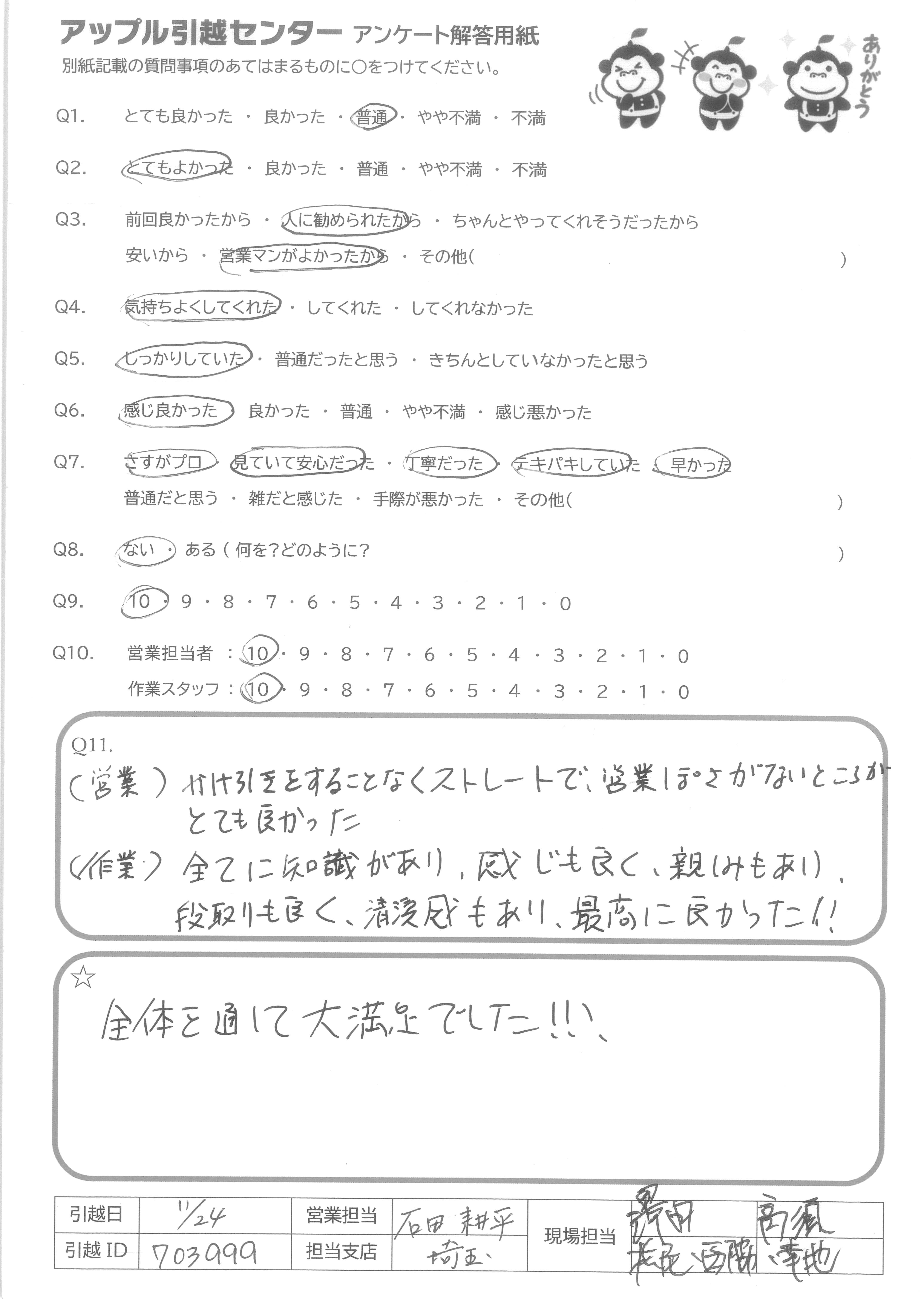 A.引っ越しは荷造りでかなり疲れるものですが、アップルに出会えたことで大満足でした。ありがとうございました。