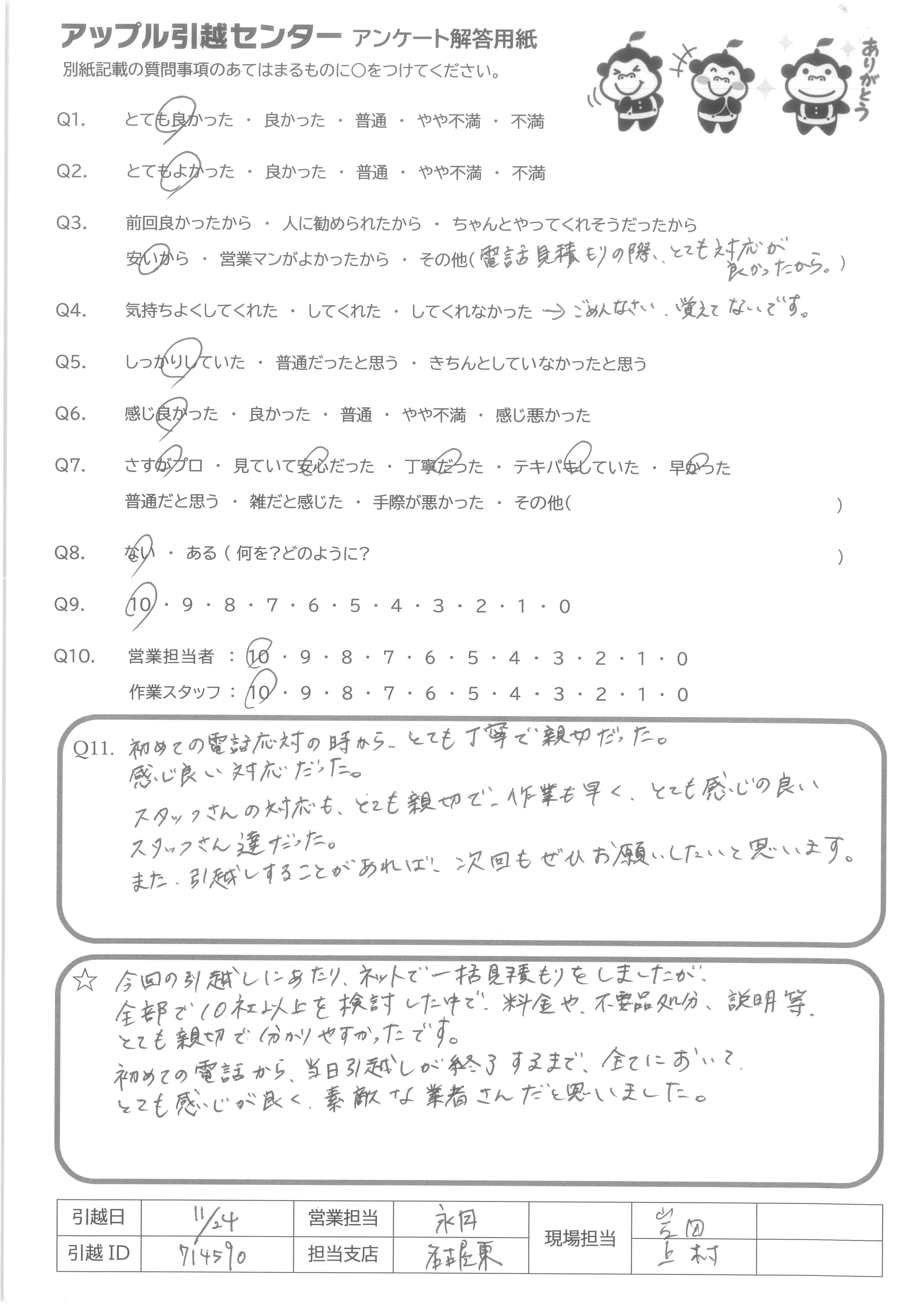 A.今回初めてアップル引っ越しセンターさんを利用させていただきました。最初の電話対応も後日質問があり電話した時も、とても分かりやすく説明していただき、引っ越し当日まで安心出来ました。作業スタッフの方お二人は、丁寧にテキパキと作業され、そして何よりとても感じが良かったです。今回担当していただいた皆さん、ありがとうございました。