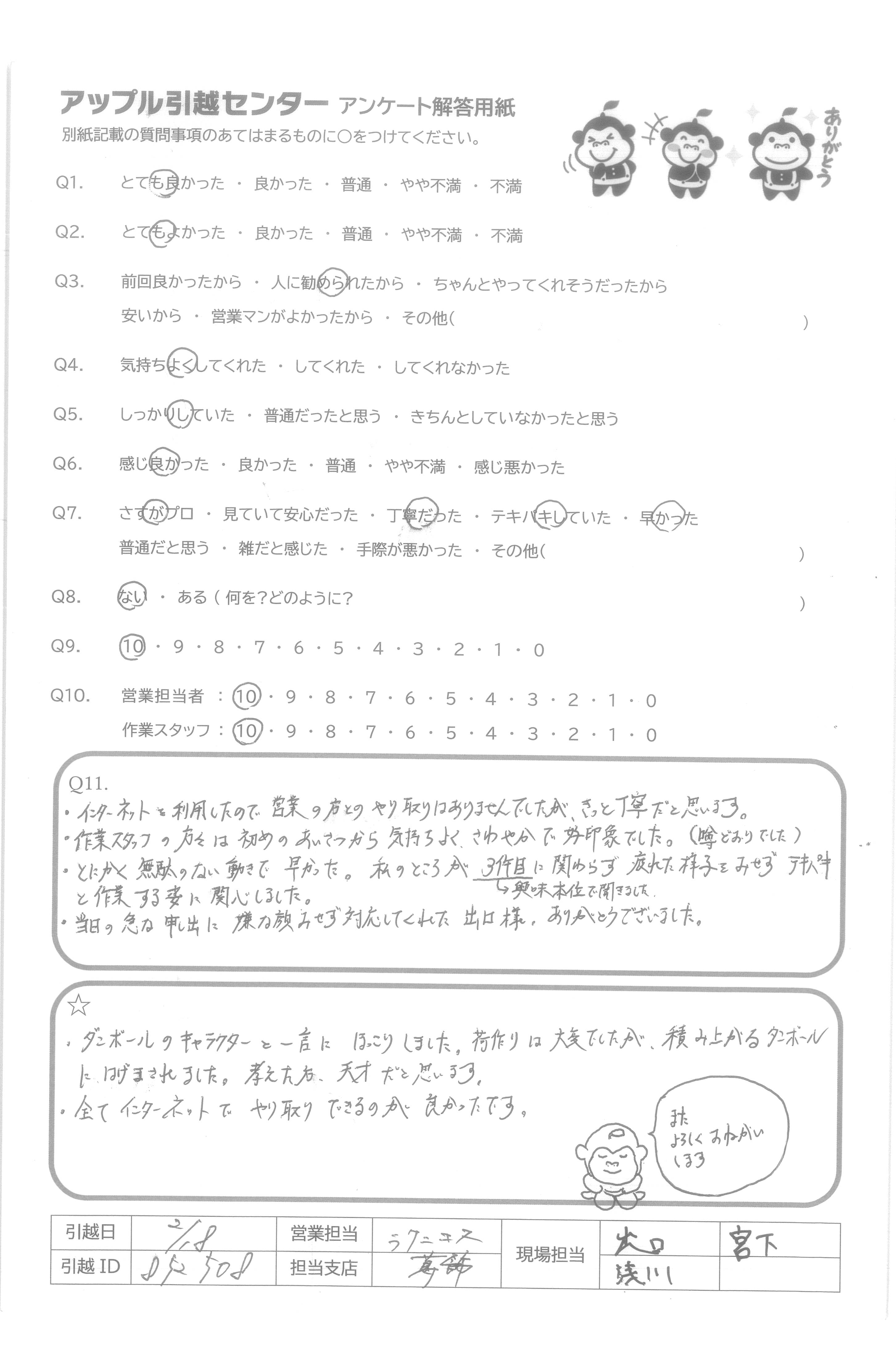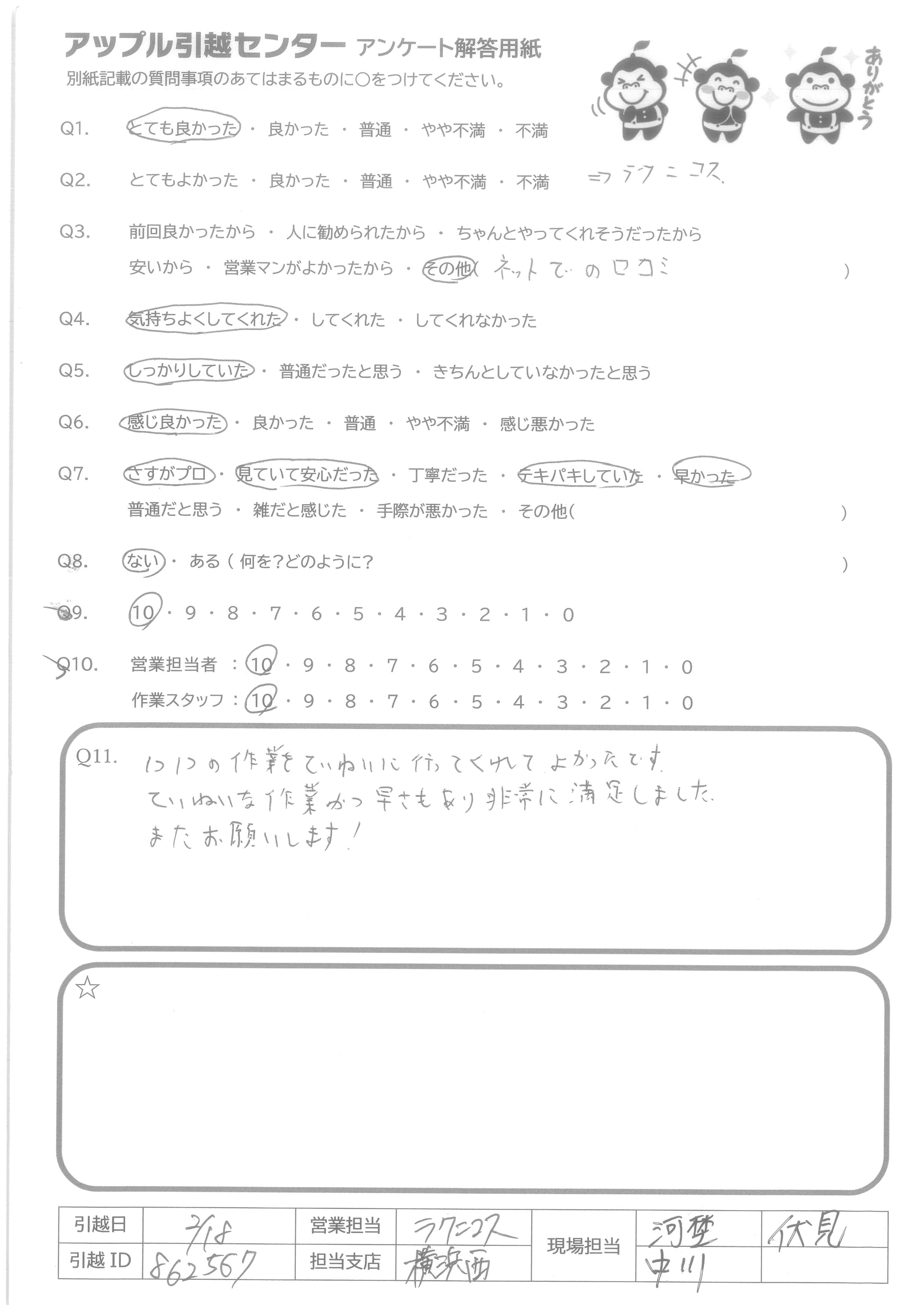 A.・インターネットを利用したので、営業の方とのやり取りはありませんでしたが、きっと丁寧だと思います。 ・作業スタッフの方々は初めのあいさつから気持ちよくさわやかで、好印象でした。(噂どおりでした) ・とにかく無駄のない動きで早かった。私のところが3軒目に関わらず疲れた様子をみせずテキパキと作業する姿に関心しました。 ・当日の急な申し出に嫌な顔みせず対応してくれた出口様、ありがとうございました。