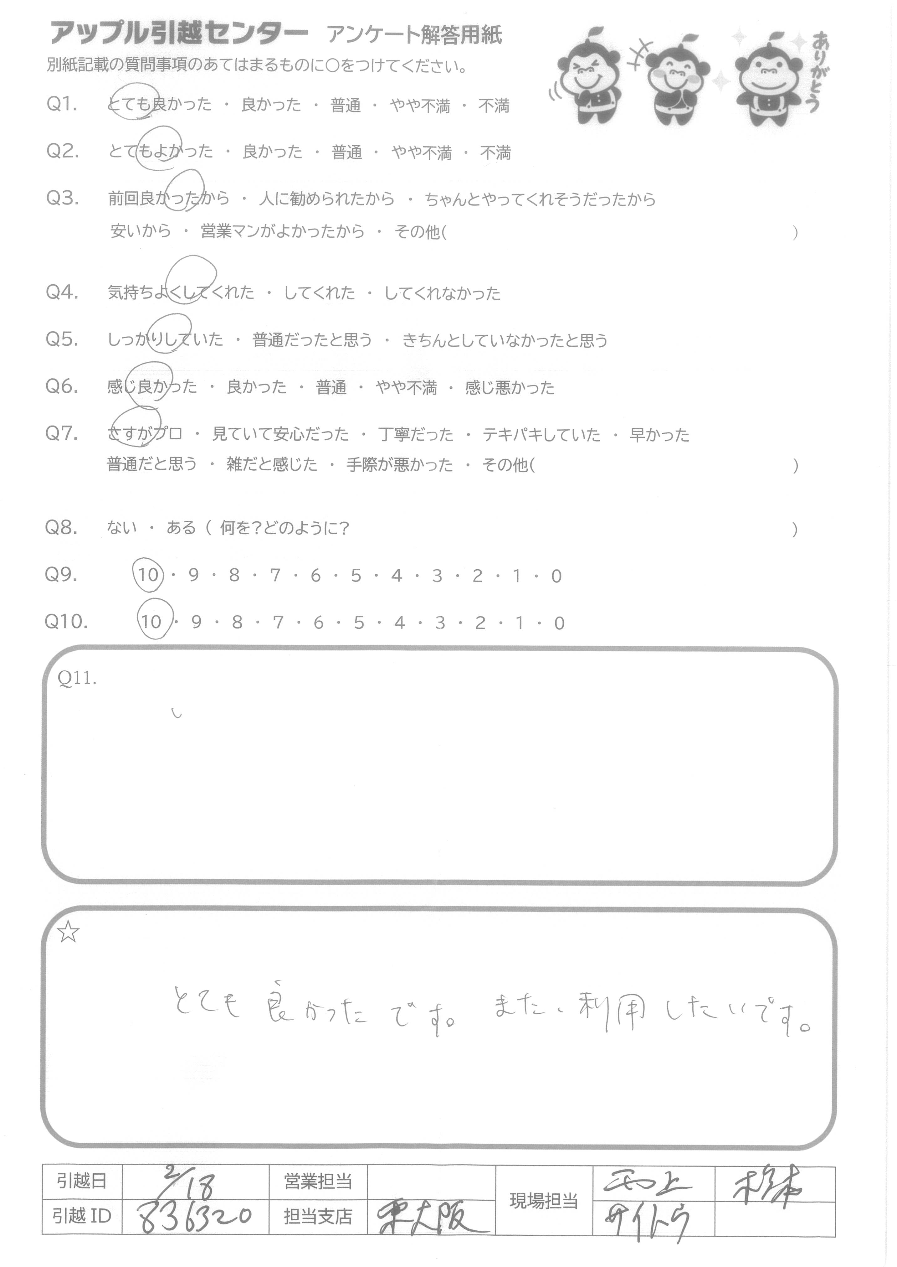 A.当日担当の方がとても丁寧に対応してくださり、安心して引越しをお願いすることができました。ありがとうございました。