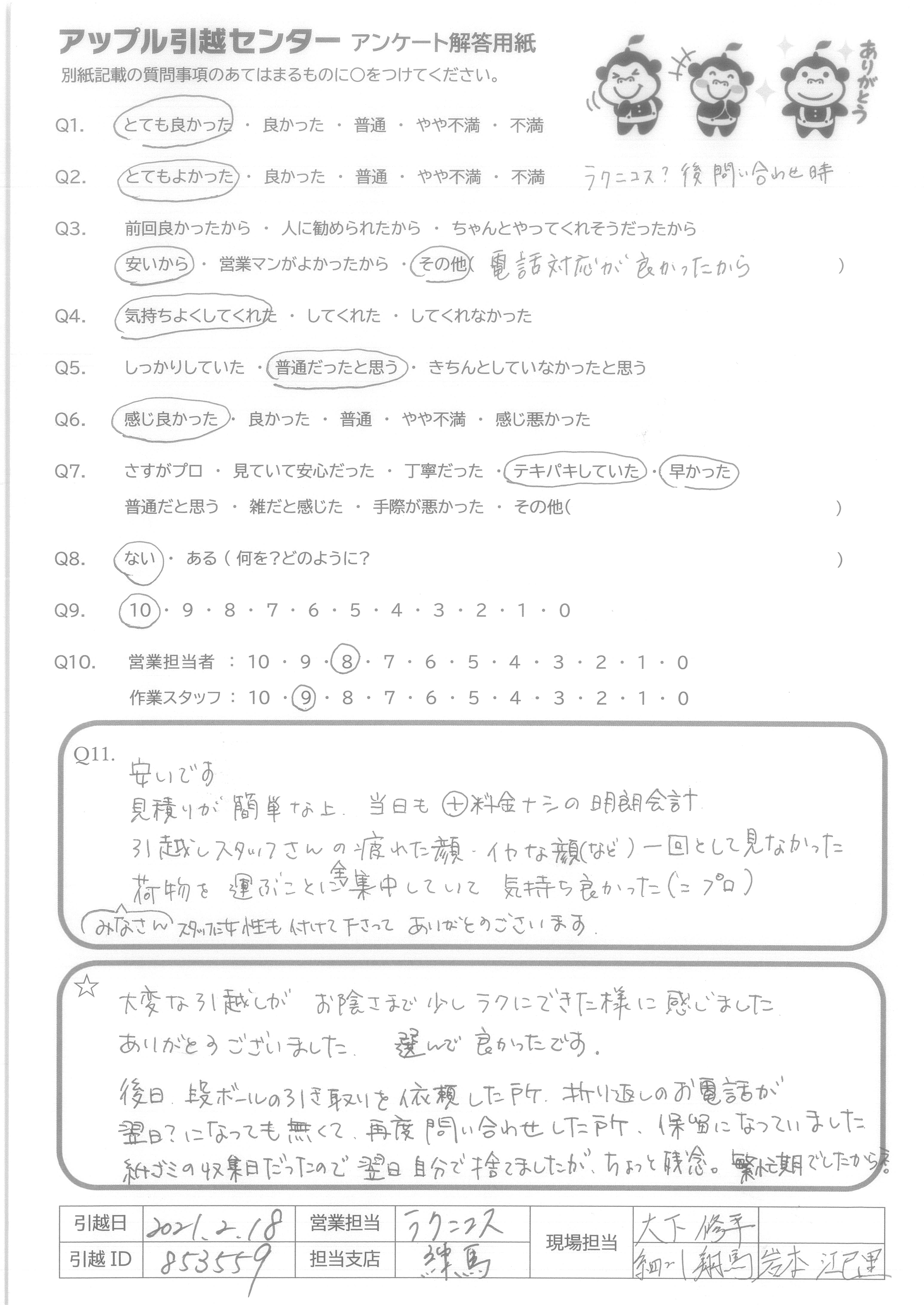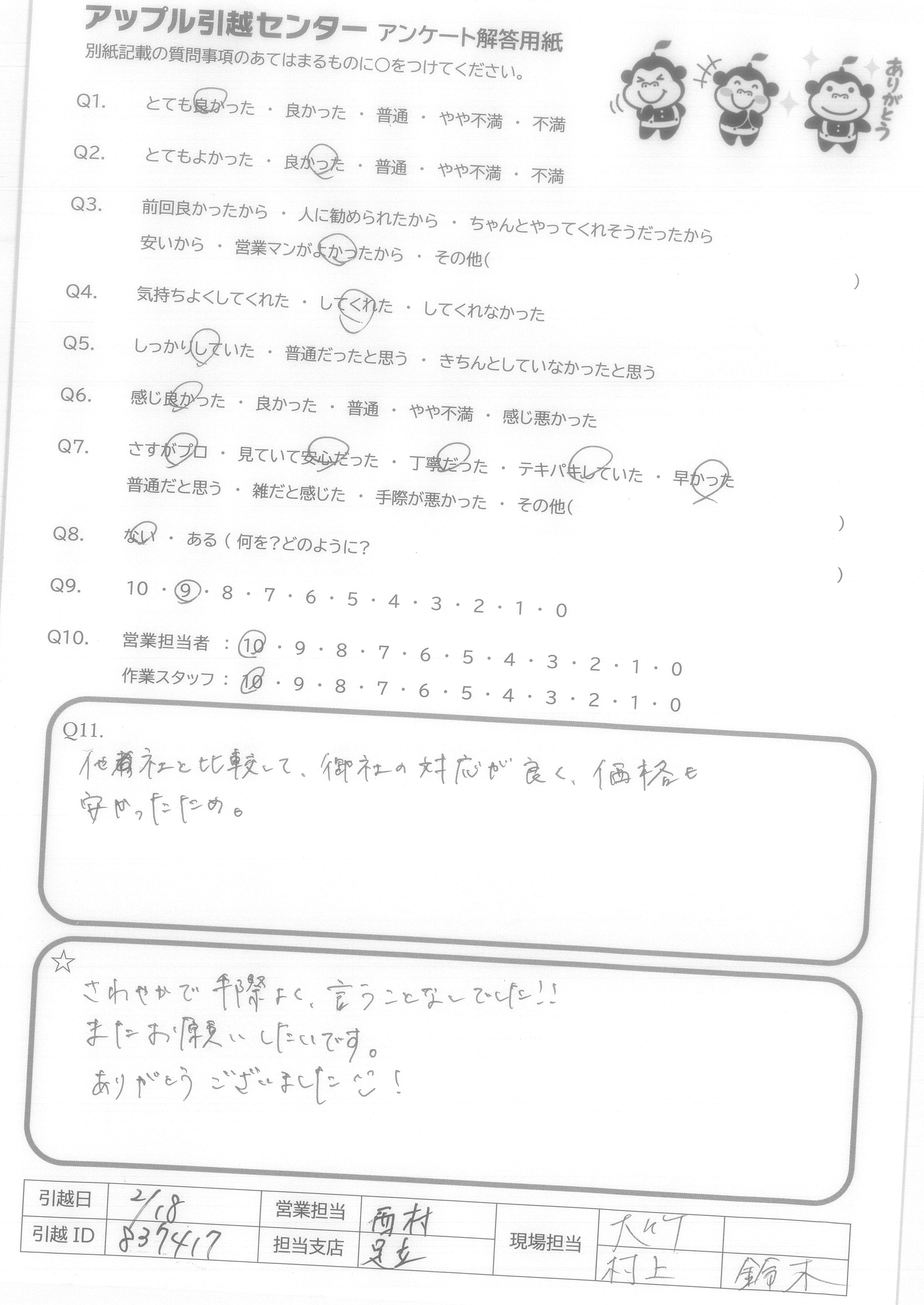A.アップルさんは今までに2回使わせて貰ってますが、やはり安いのと安心して任せられるなと思いました。細かい心遣いもしてくれて助かりました。また、引っ越しをすることがあったらアップルさんに頼みたいなと思います。