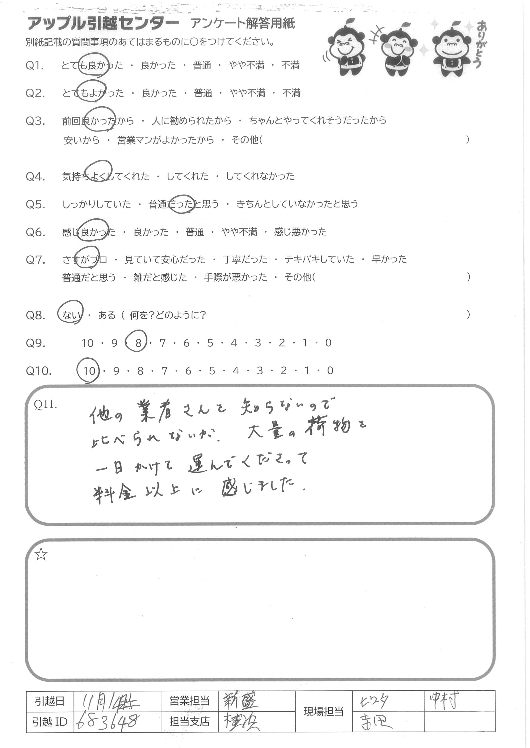 A.他の業者さんを知らないので比べられないが、大量の荷物を一日かけて運んでくださって料金以上に感じました。