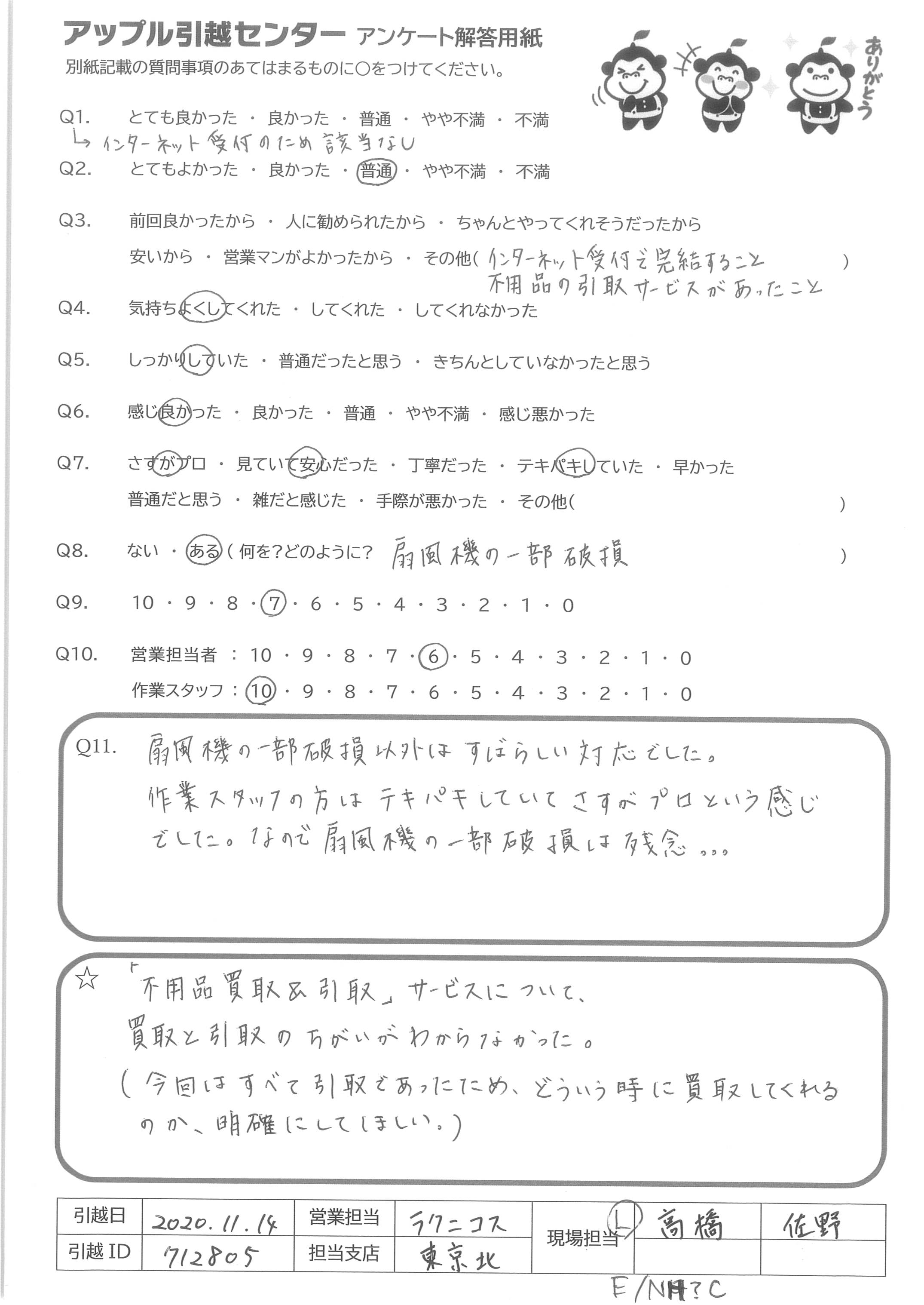 A.扇風機の一部破損以外はすばらしい対応でした。 作業スタッフの方はテキパキしていてさすがプロという感じでした。 なので扇風機の一部破損は残念。。。