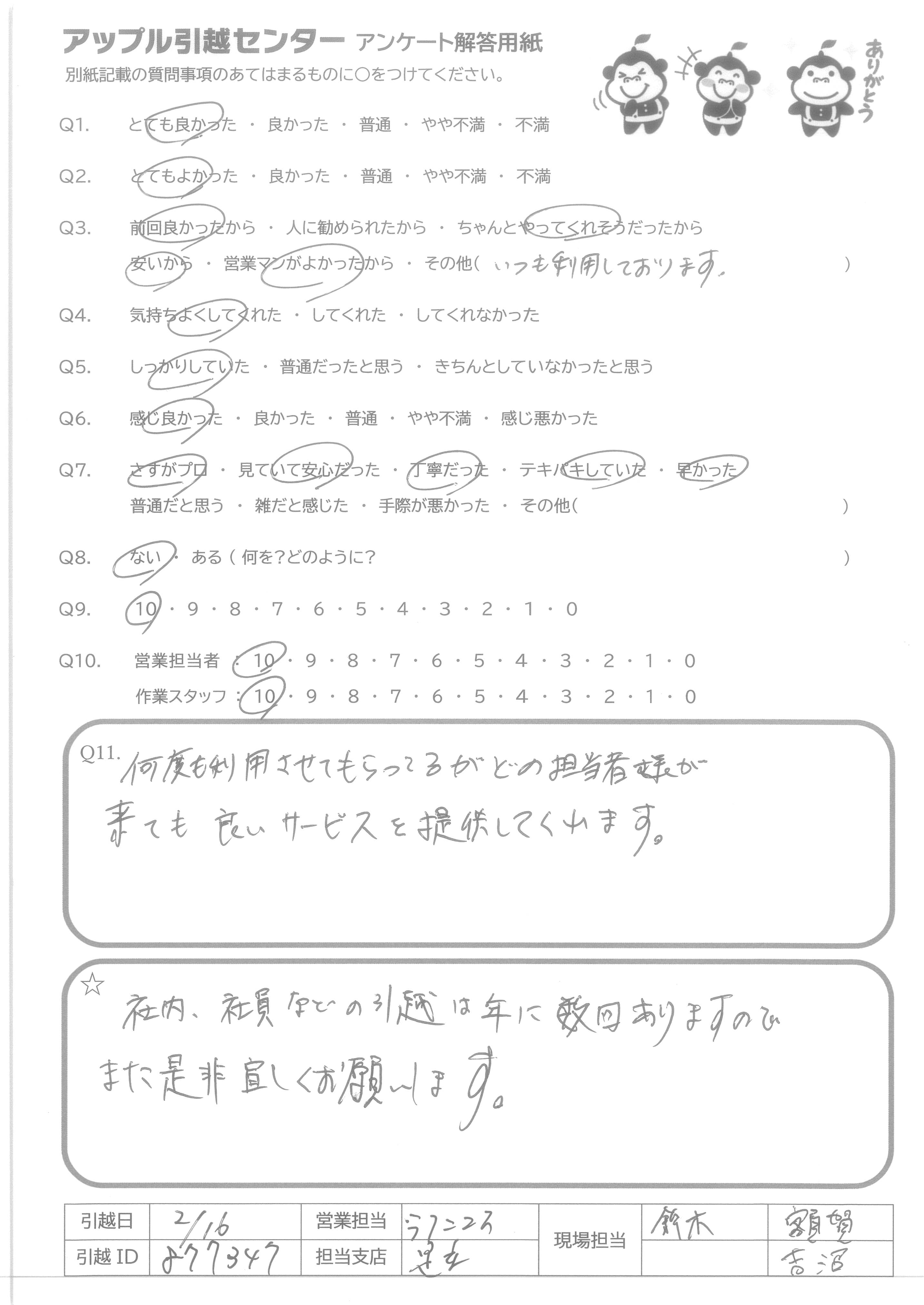 A.二回目の利用でしたが今回も料金と作業スピードなど満足なものでした。 また引っ越しの際はお頼みしたいと思っています。お猿ちゃんのキャラクターも可愛くて惹かれたポイントでした(笑) お忙しい中ありがとうございました。