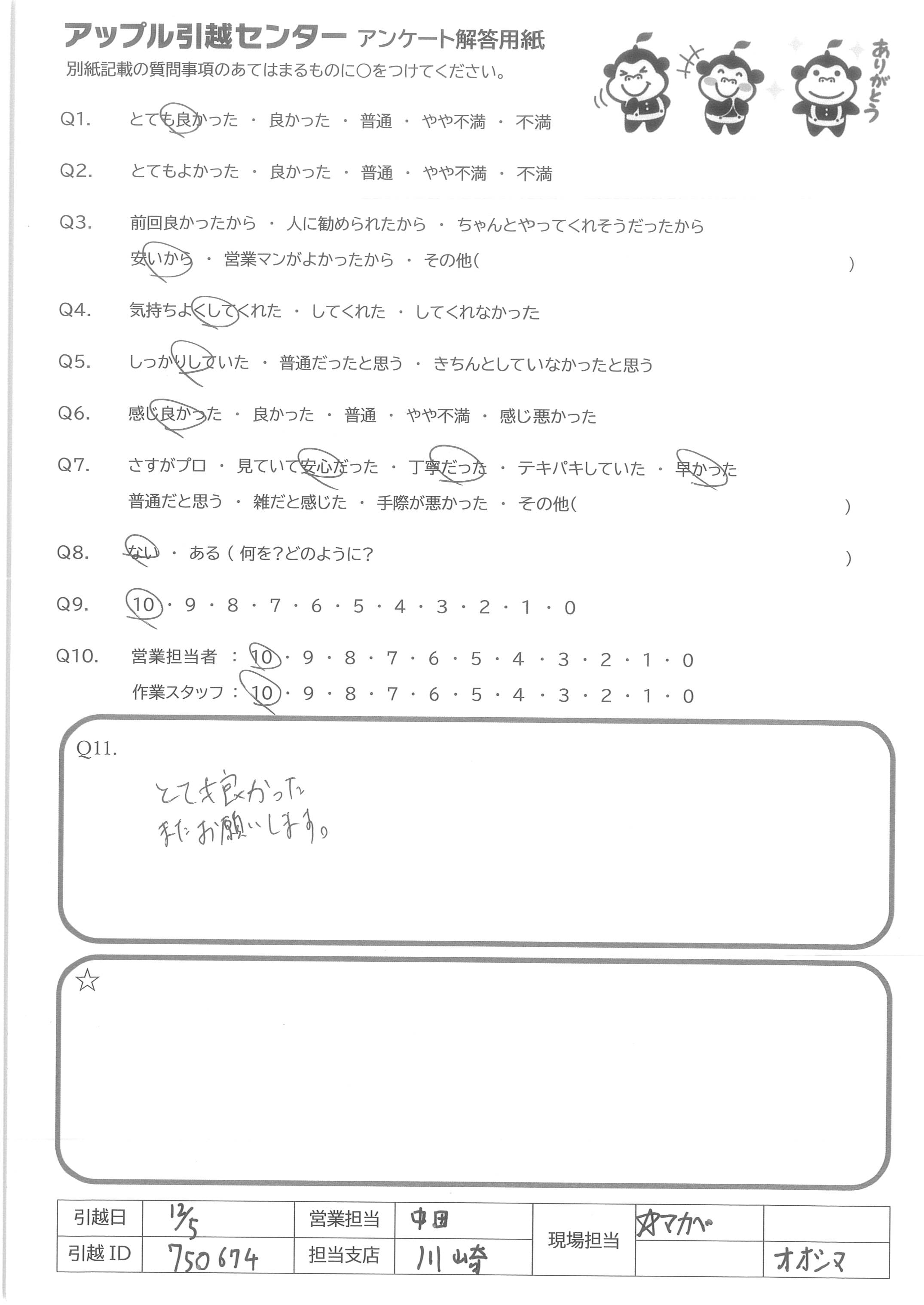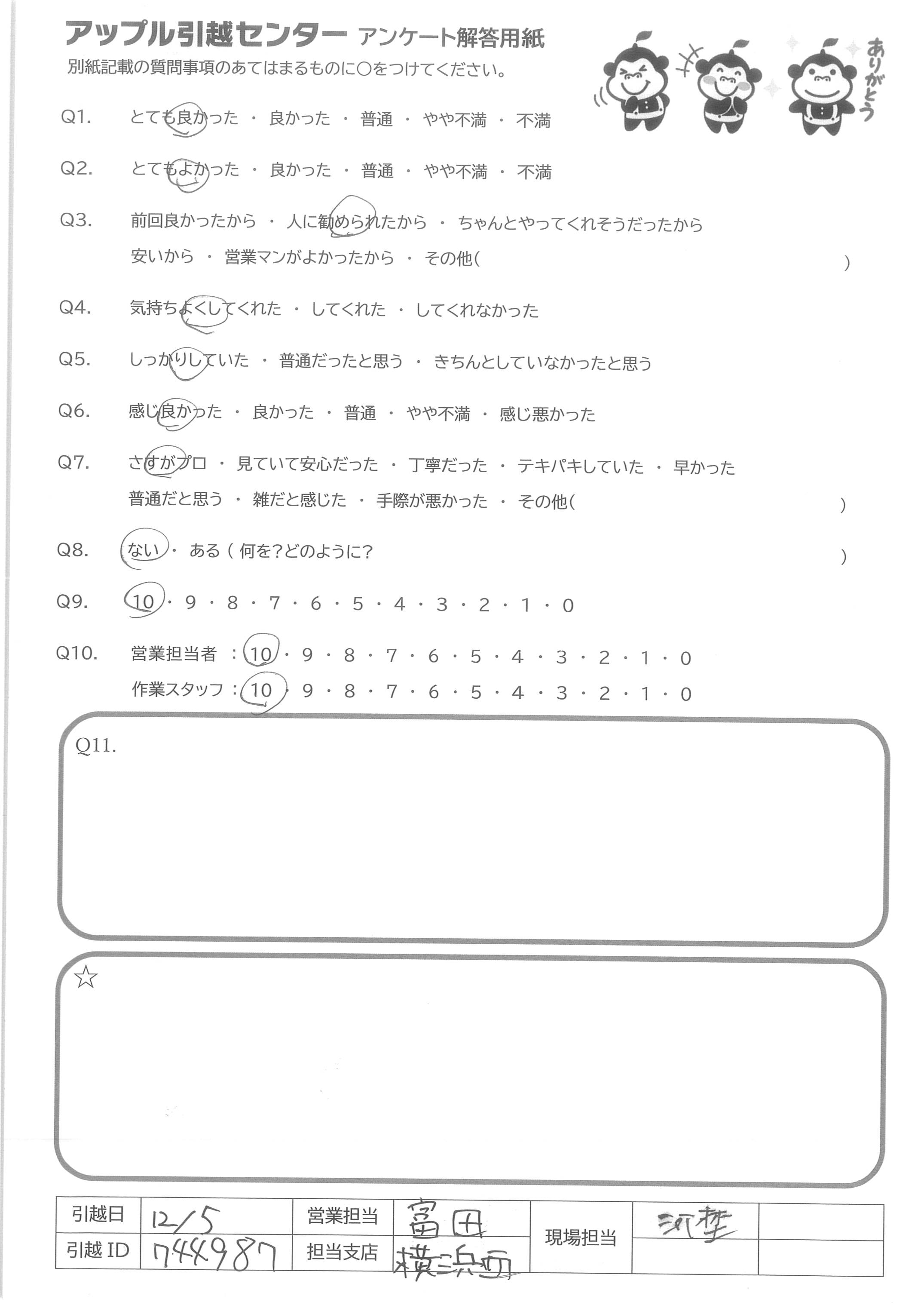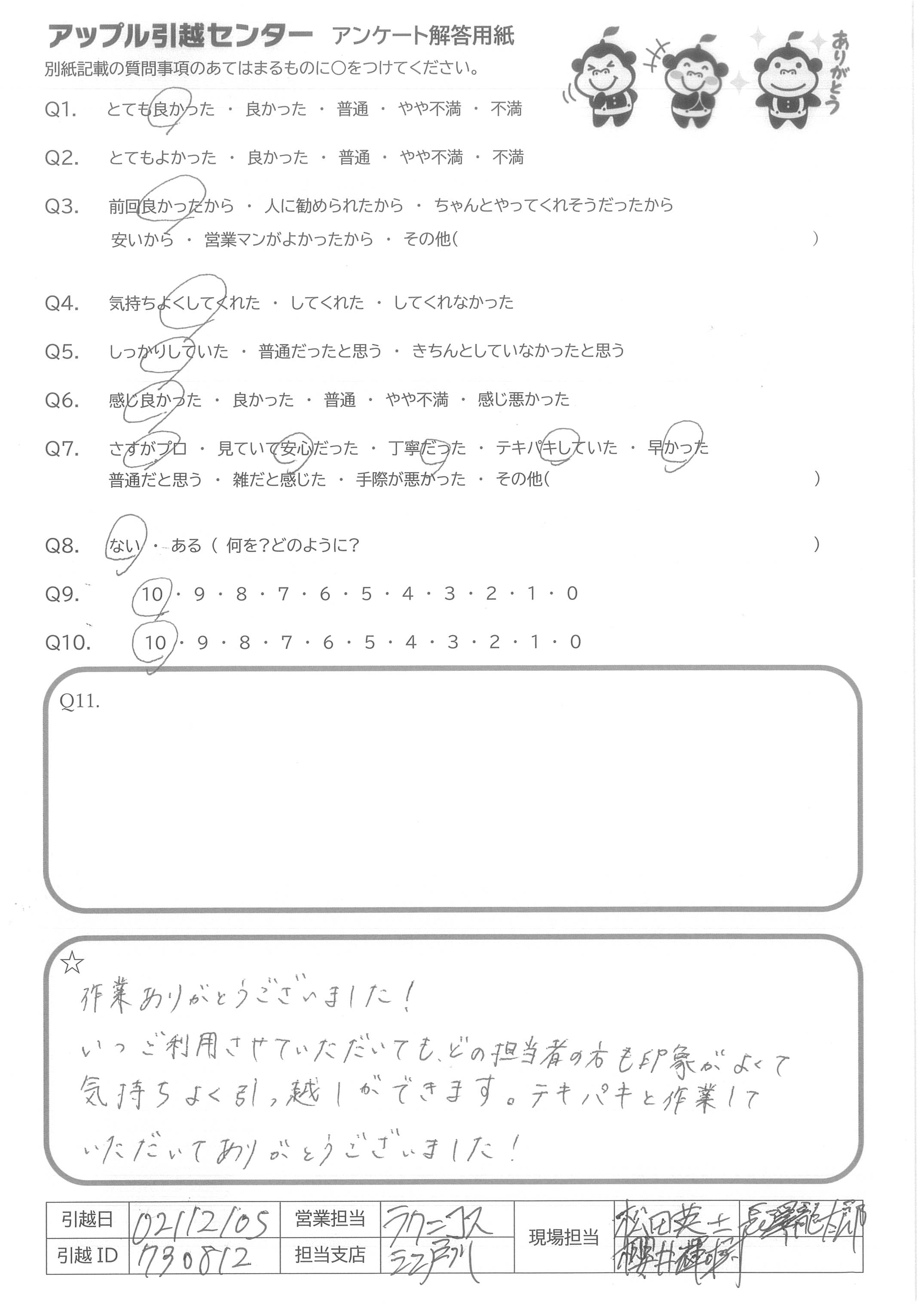 A.作業ありがとうございました! いつご利用させていただいても、どの担当者の方も印象がよくて気持ちよく引っ越しができます。テキパキと作業していただいてありがとうございました!