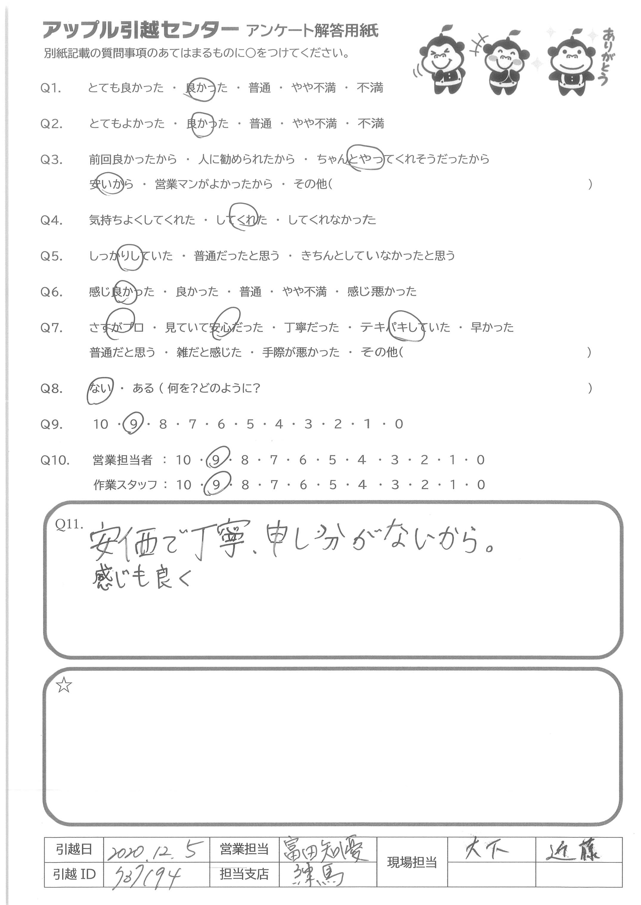 引越し日:2020年12月05日 エリア:福岡県福岡市東区