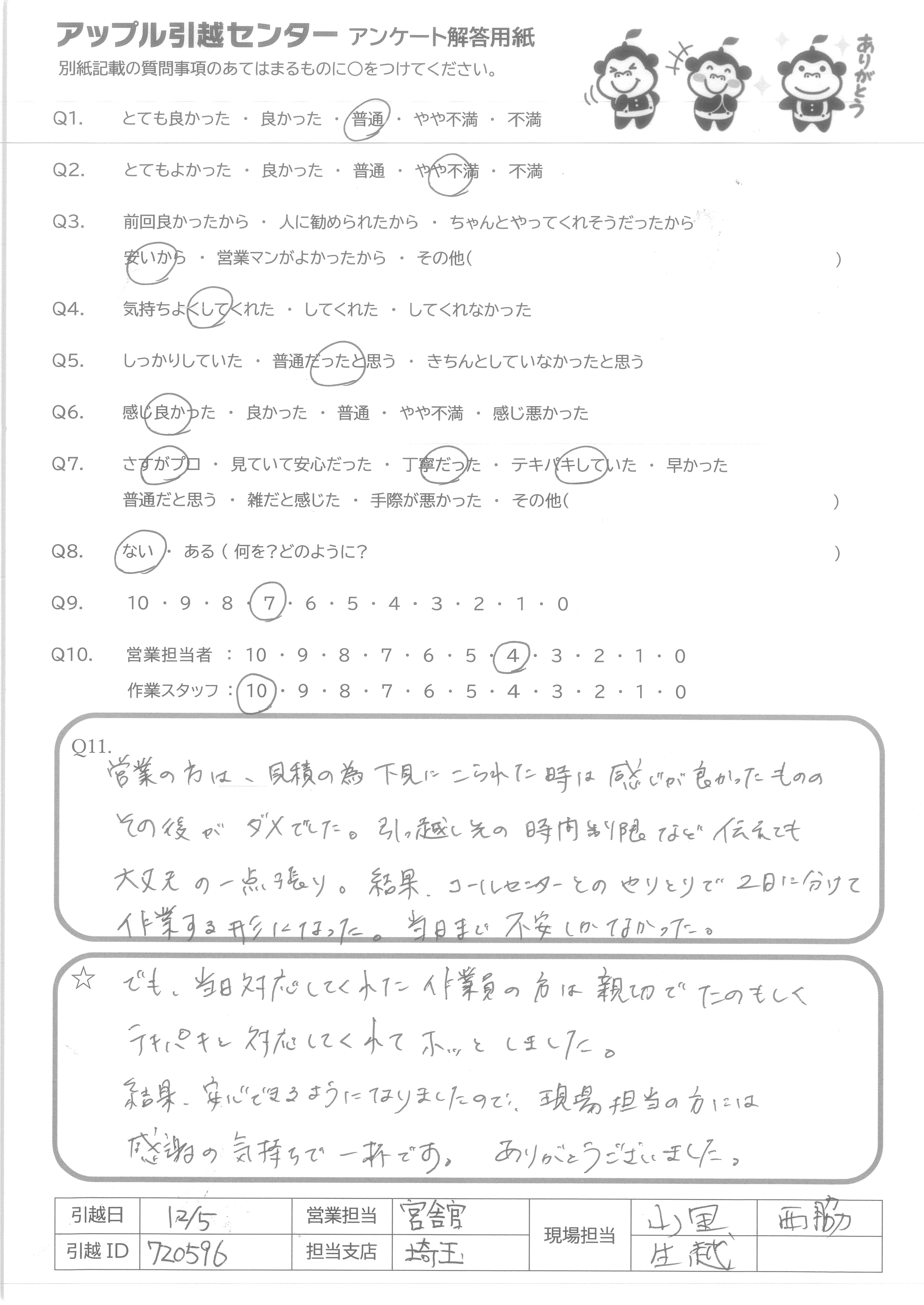 A.特に不満無かったです 素早く丁寧な対応でした 感じも良かったです 次回引越しがあればまたお願いしようと思う程度です