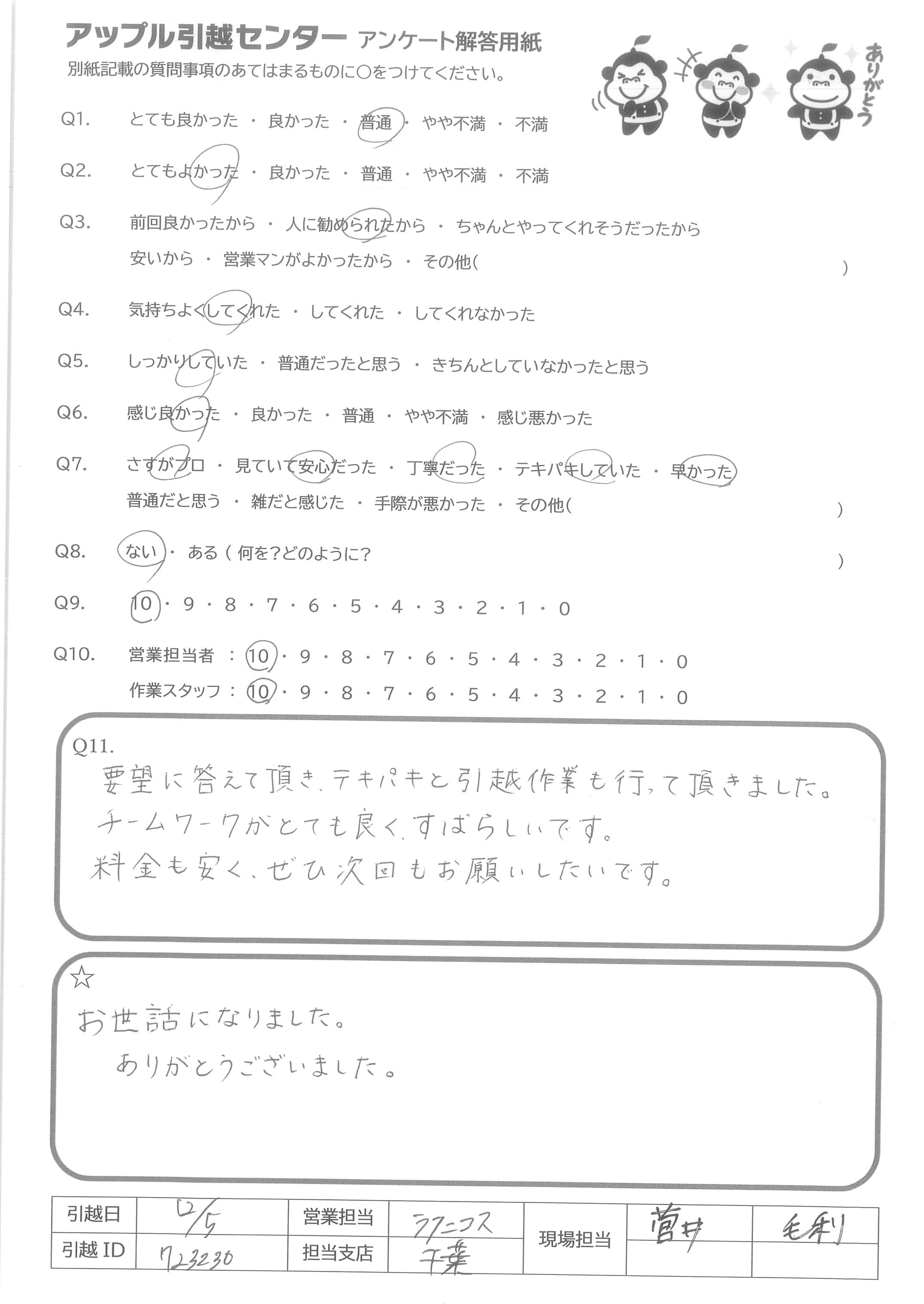 引越し日:2020年12月05日 エリア:千葉県八千代市