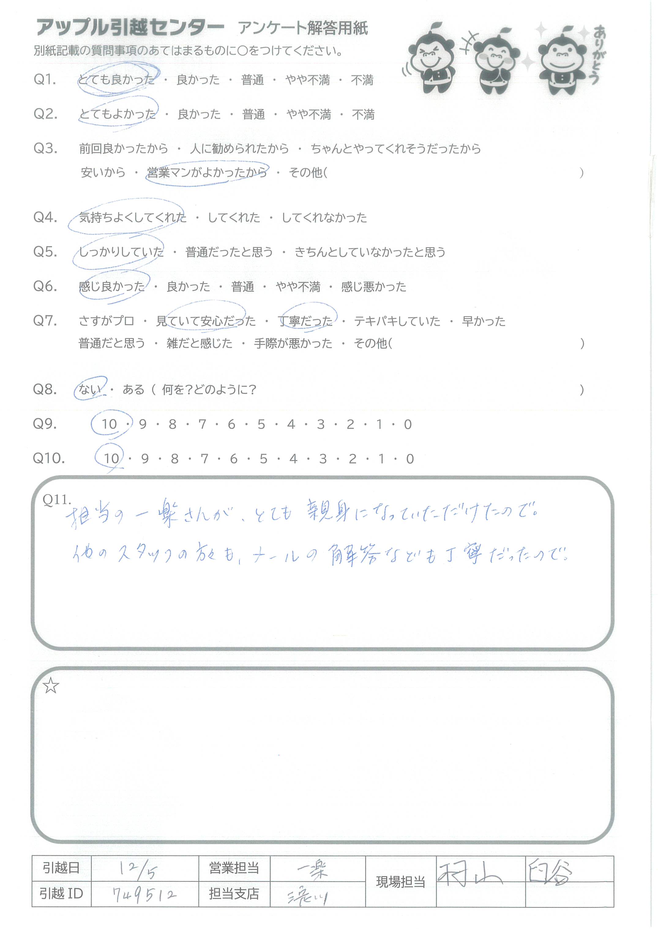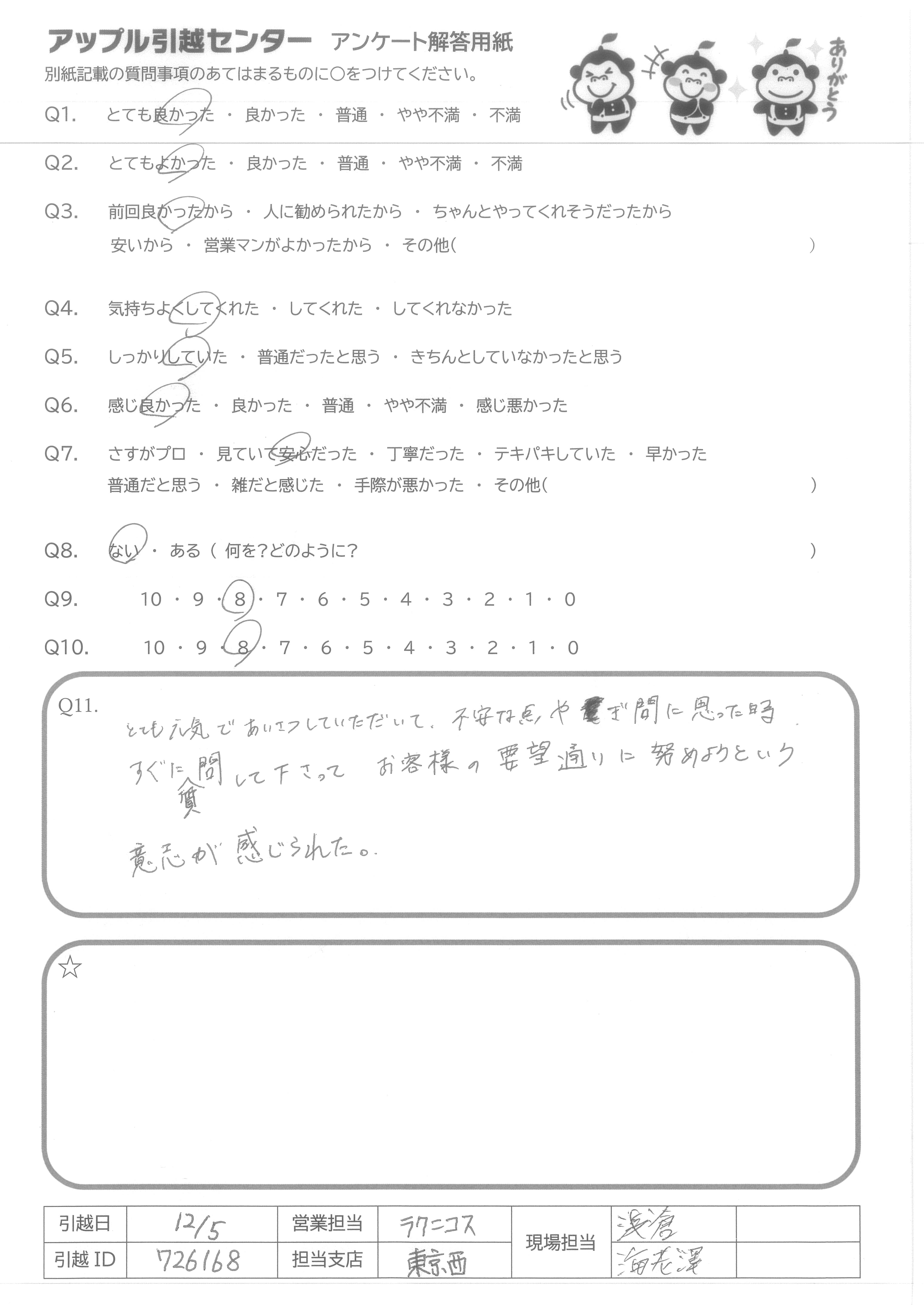 A.当日の第一印象が良く、 仕事も早かった。家具の配置を考えていただいたり、 小さなことでも伝えてくれたから。(センタきゅきのホースが長がく少し出っ張ることなど) 一番良いと思ったことは、些細な気遣い(最後の荷物を持って出発したときに私が後から降りることを考えて、エレベーターを上げてくれていたこと!!
