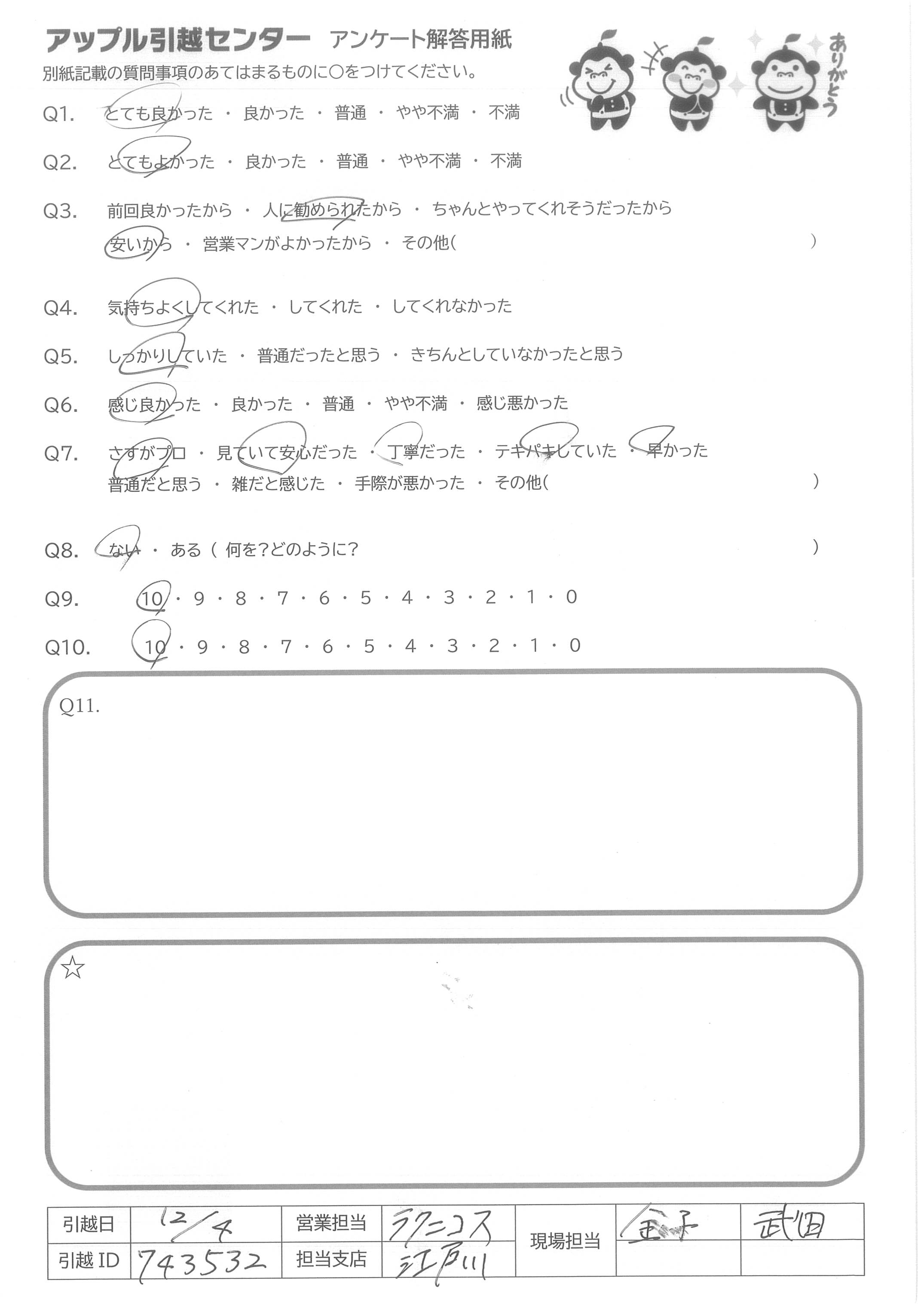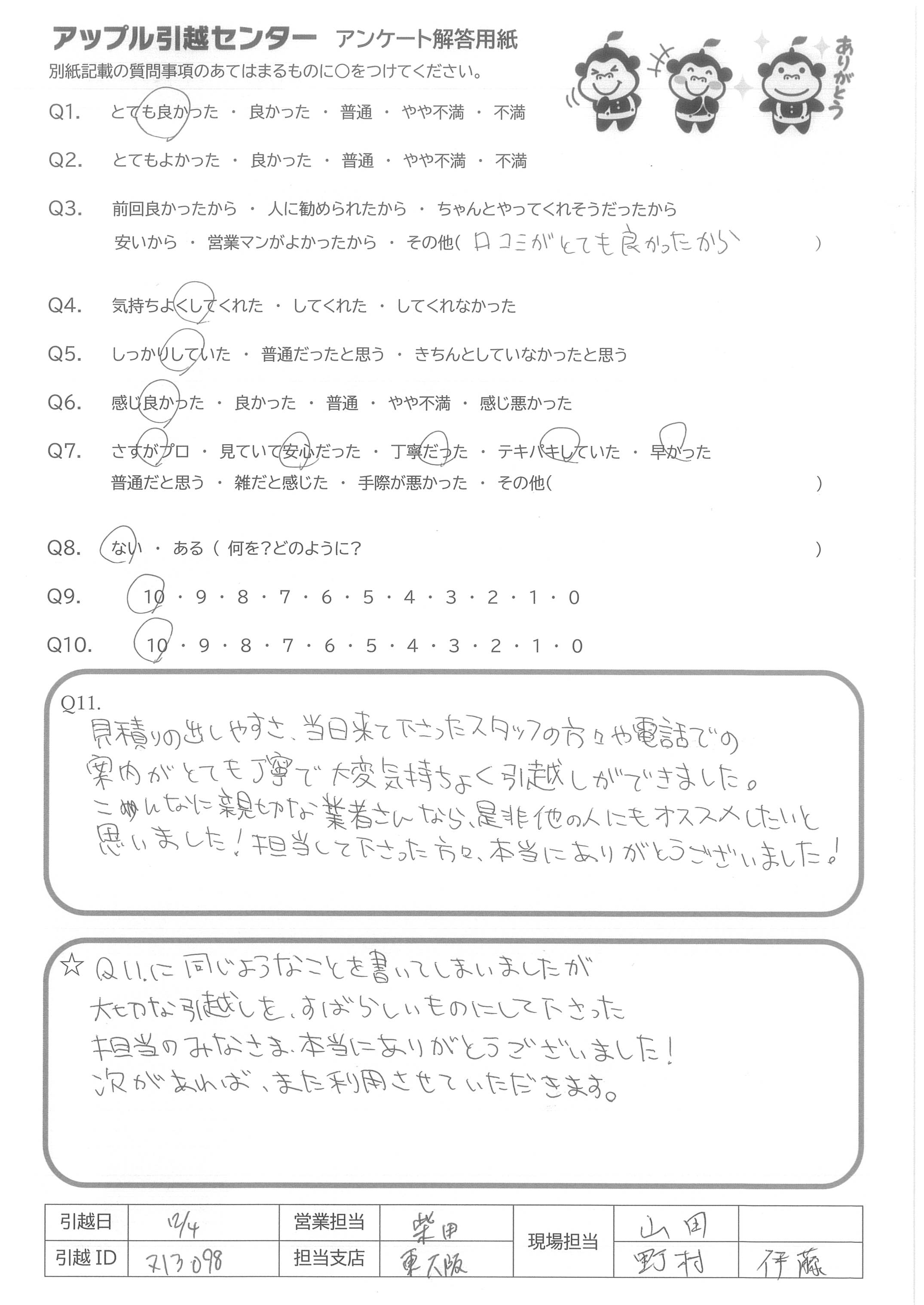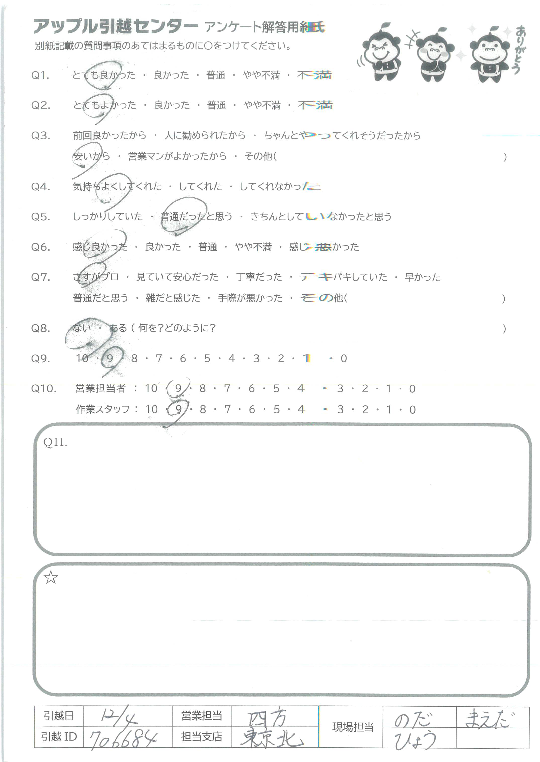 A.Q11に同じようなことを書いてしまいましたが大切な引越しをすばらしいものにして下さった担当のみなさま、本当にありがとうございました!次があれば、また利用させていただきます。