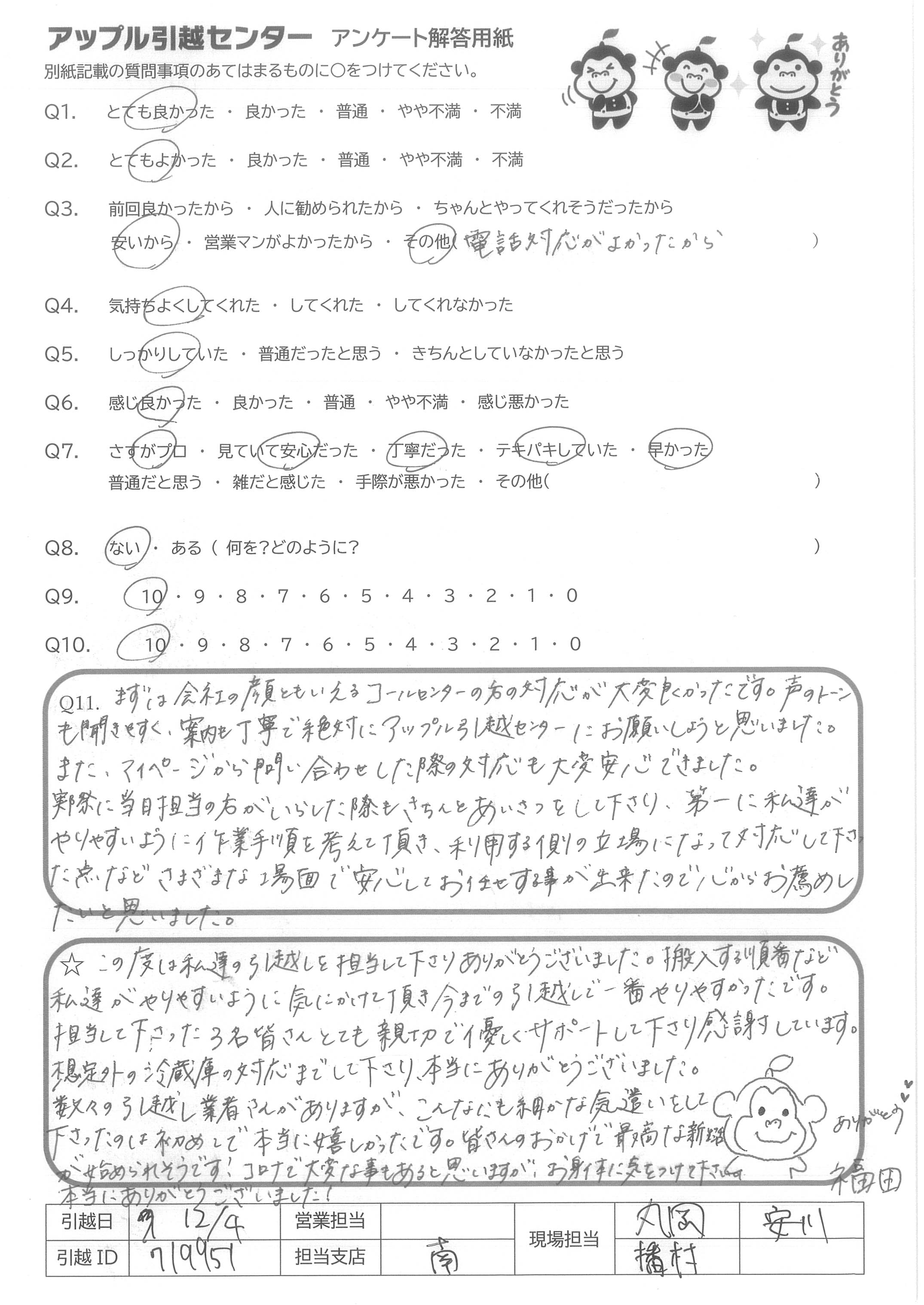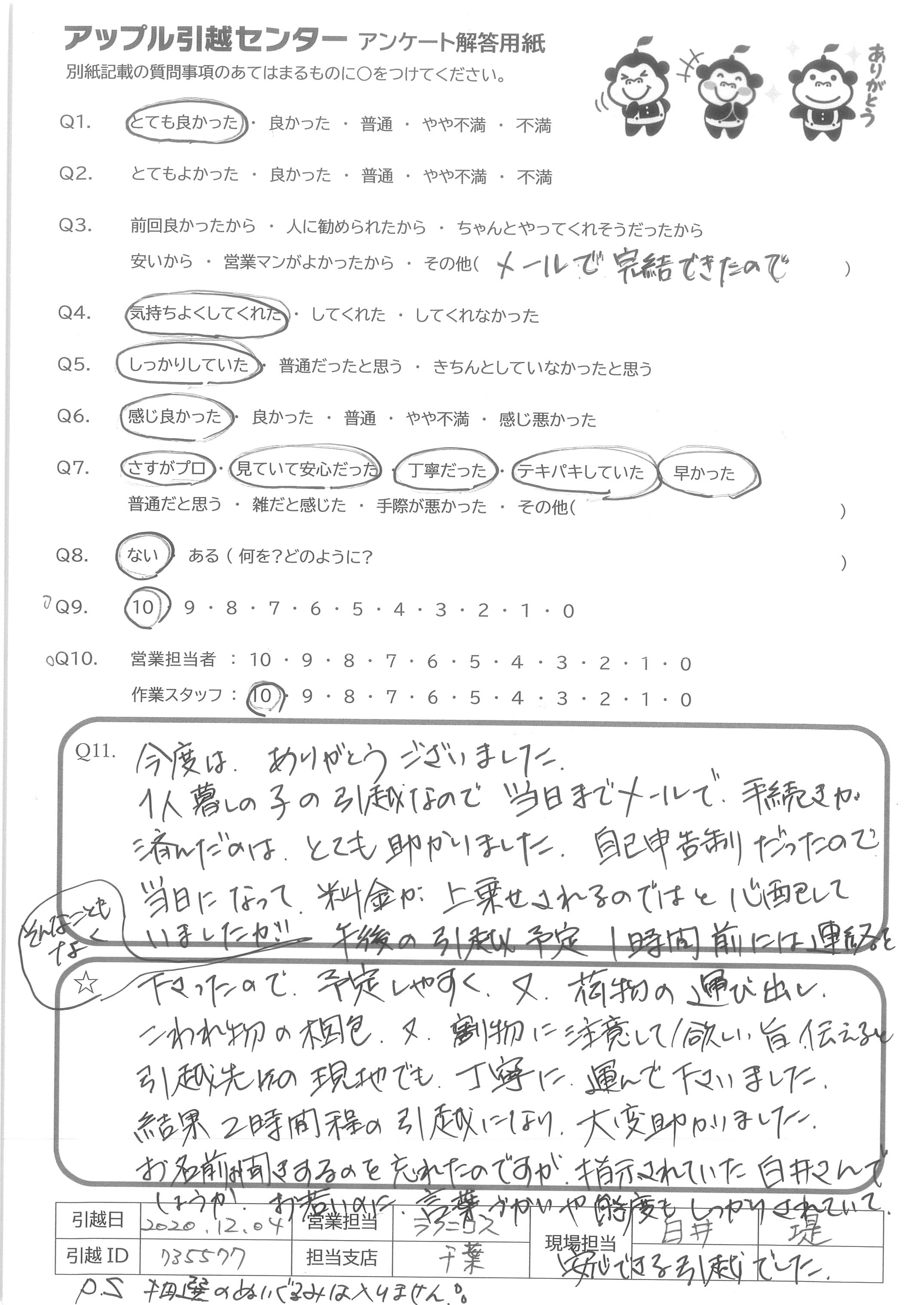 A.この度はありがとうございました。 1人暮しの子の引越なので当日までメールで、手続きが済んだのはとても助かりました。自己申告制だったので当日になって料金が上乗せされるのではと心配していましたがそんなこともなく午後の引越予定1時間前には連絡を下さったので、予定しやすく、又、荷物の運び出し、こわれ物の梱包、又、割物に注意して欲しい旨、伝えると引越先の現地でも、丁寧に運んで下さいました。結果2時間程の引越になり、大変助かりました。 お名前お聞きするのを忘れたのですが、指示されていた白井さんでしょうか、お若いのに言葉づかいや態度もしっかりされていて、安心できる引越でした。 PS 抽選のぬいぐるみは入りません