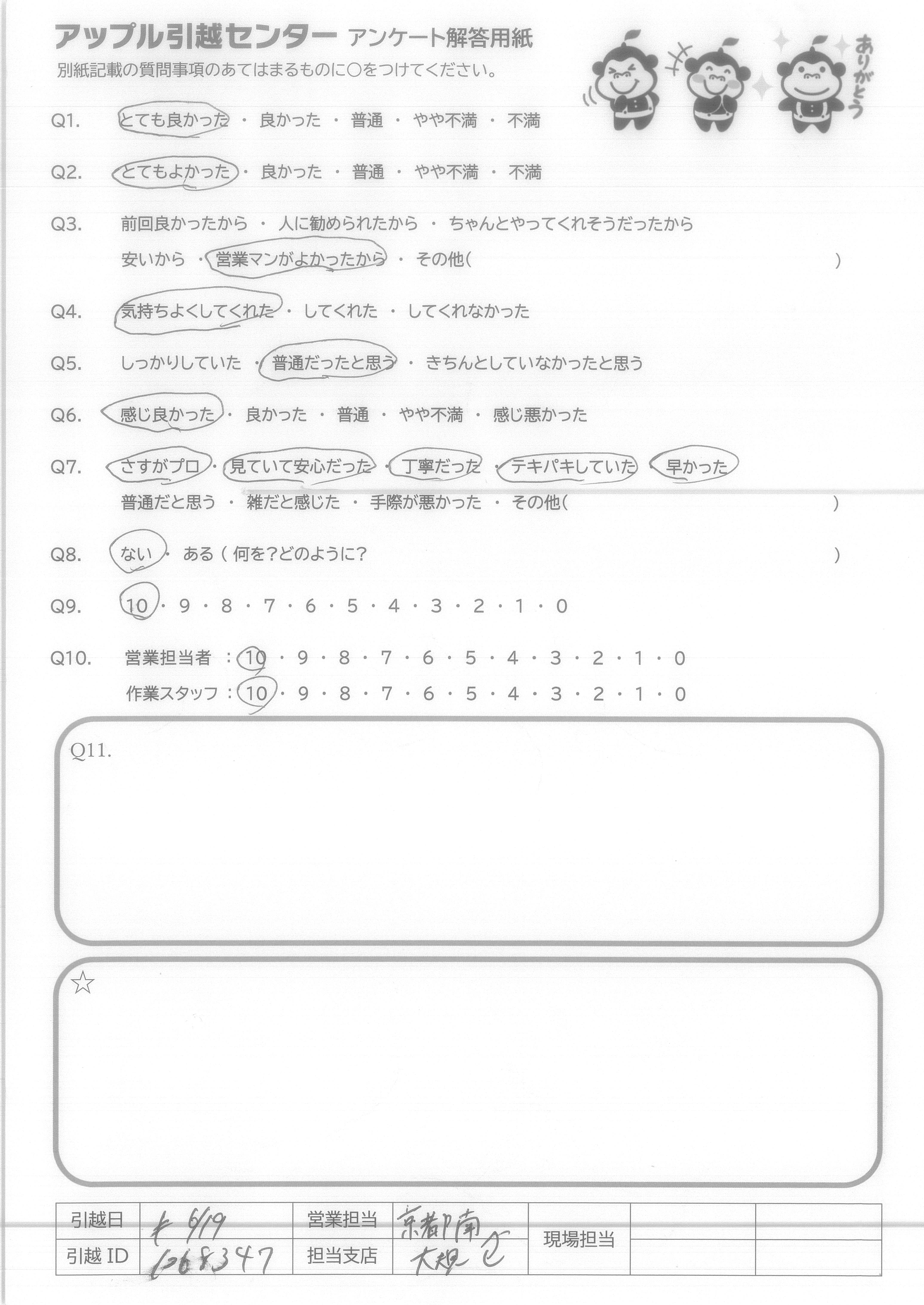A.すごくテキパキしていて、丁寧で感じがよかったです。 引っ越し業者はたくさんあるので迷いましたが、友達におすすめしてもらったアップルさんにおまかせしてよかったです!!また引っ越すときにはアップルさんにお願いします。 雨の中で荷物を運ぶのは大変だったと思いますが、ありがとうございました。