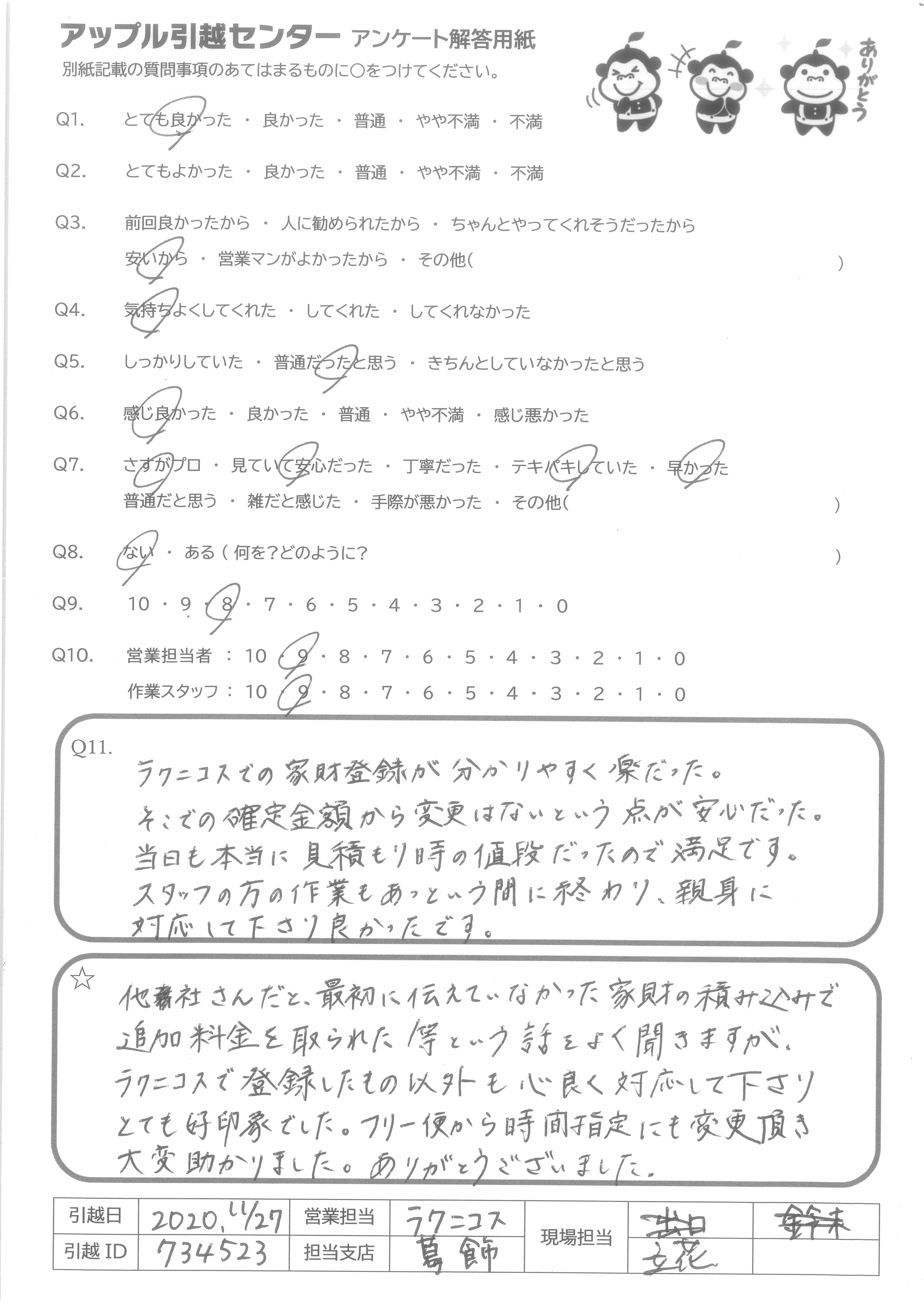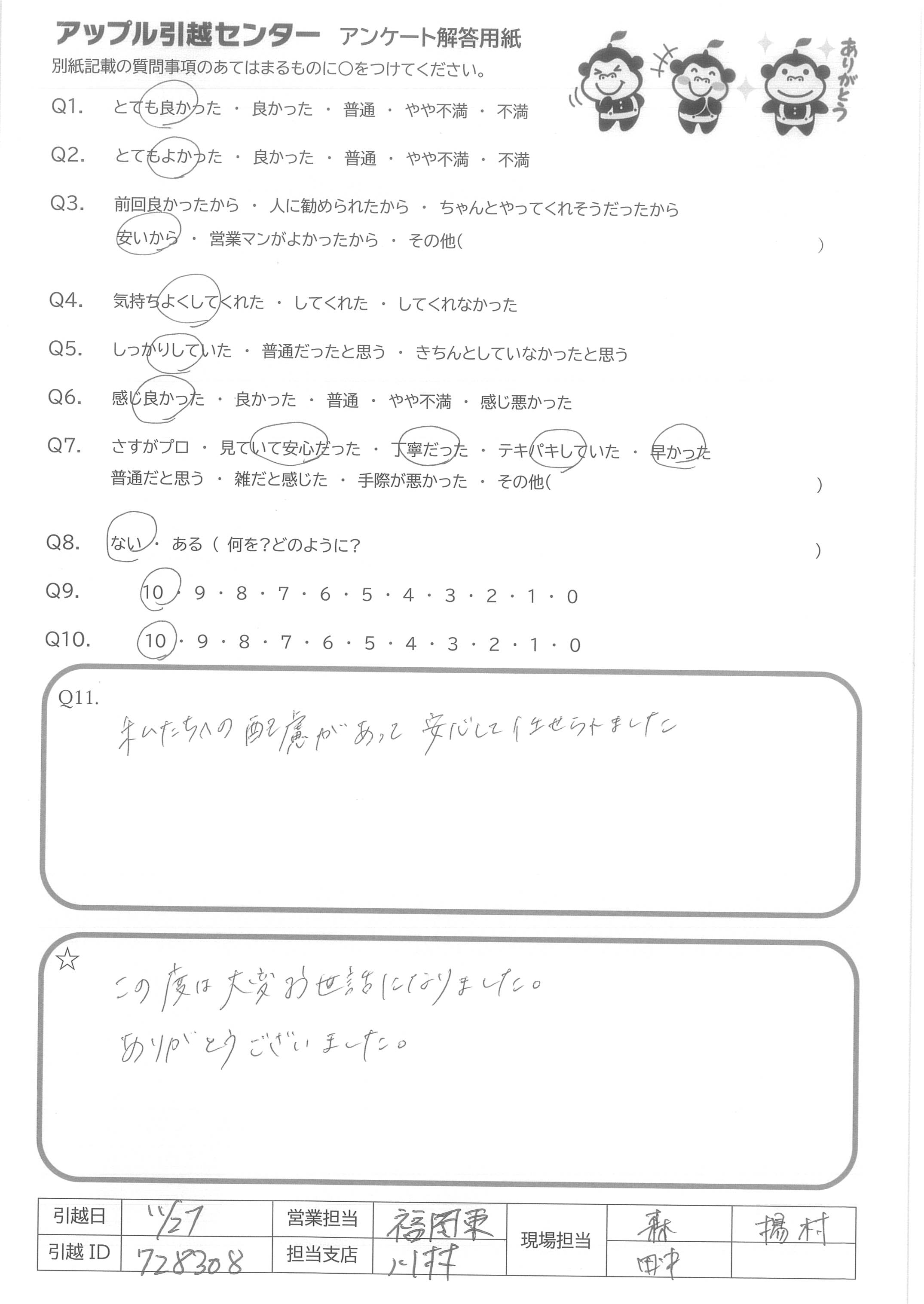 A.今回はご協力頂きありがとうございました。 (このお値段で良いのかな・・・?)と思うくらい、最初から最後まで手厚くご対応してくださり、本当に感謝しています。 また引っ越しの機会がありましたら、ぜひアップル引越センター様にお願いしたいです。宜しくお願い致します。色々とお心遣いくださり、本当にありがとうございました。