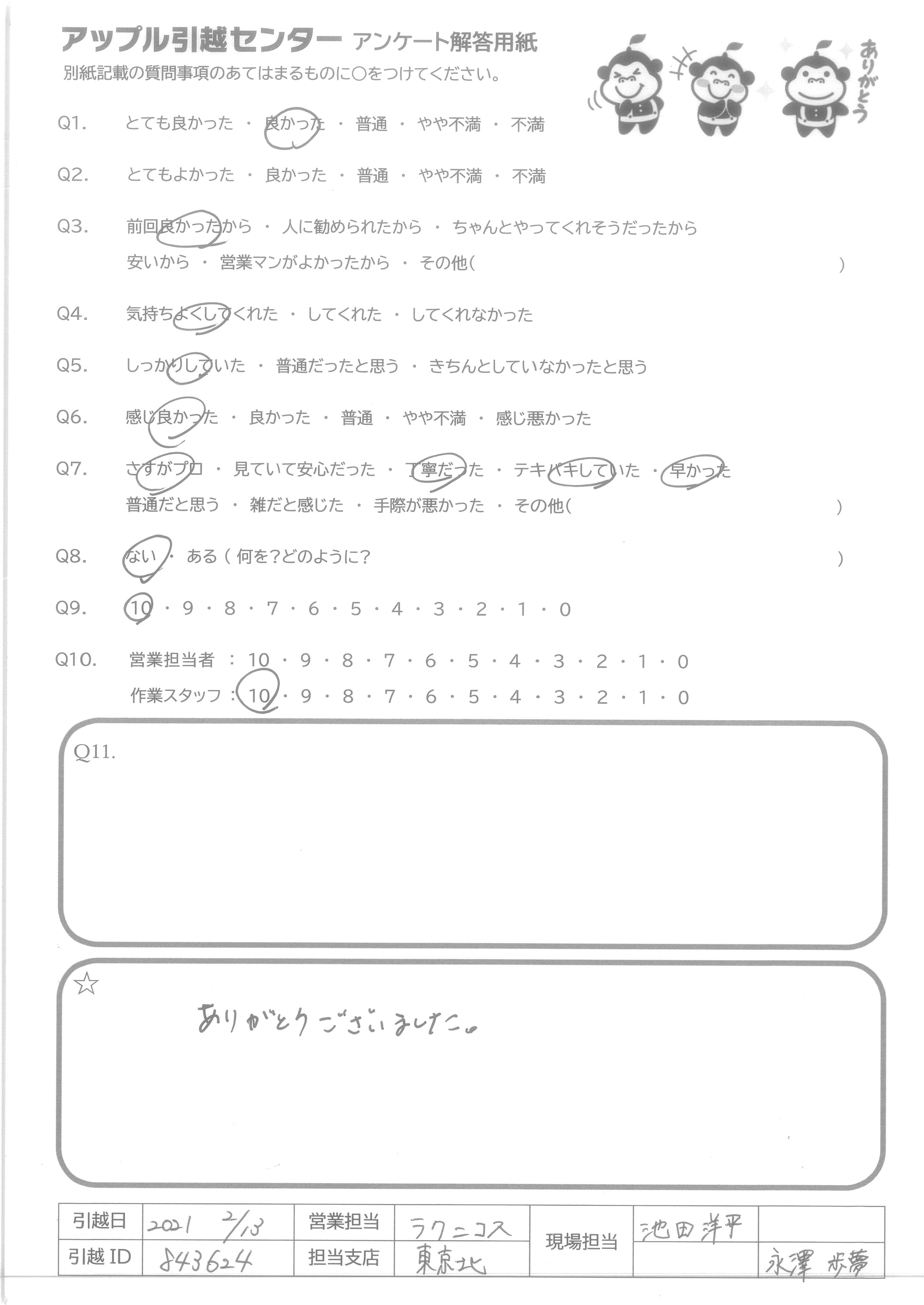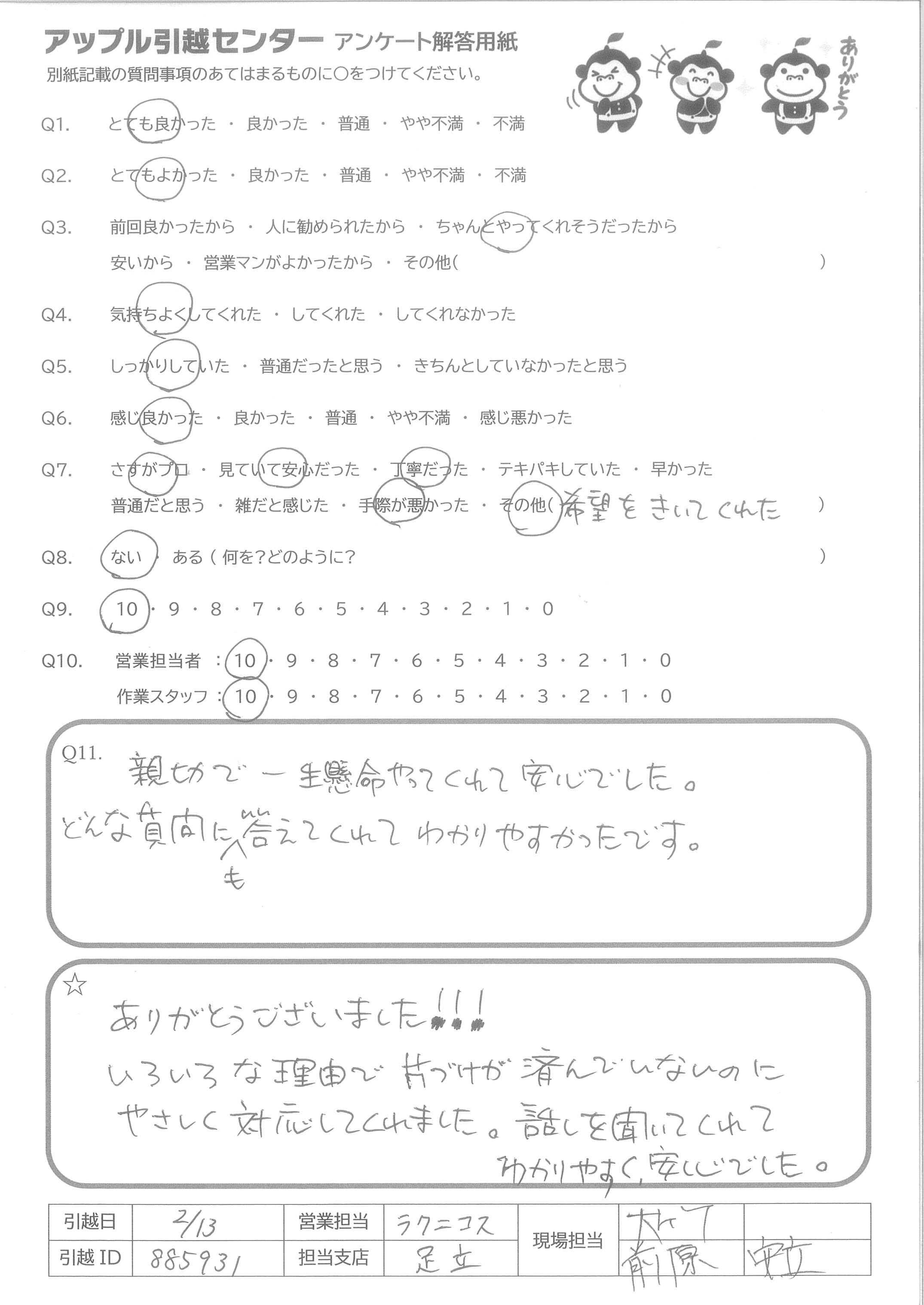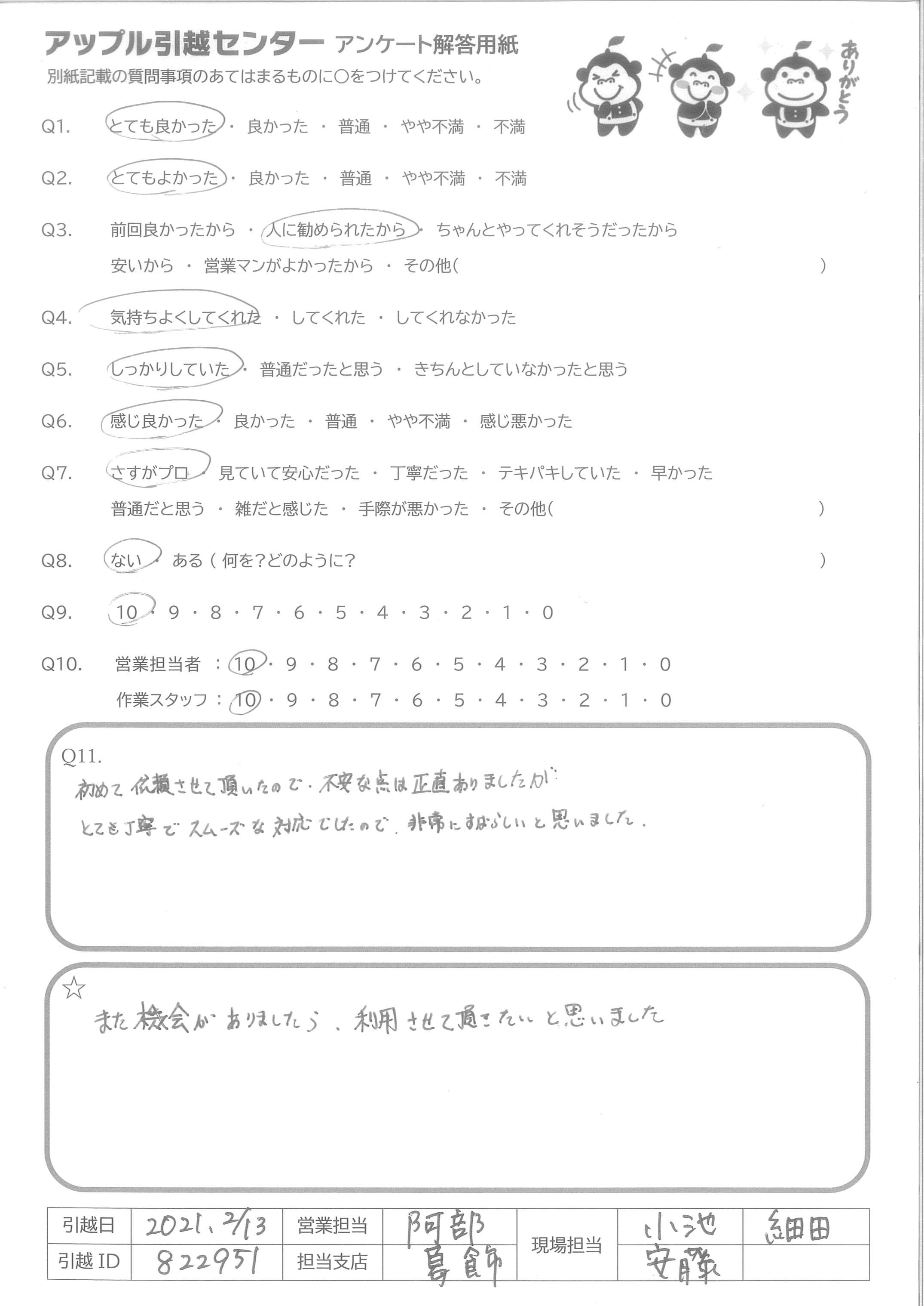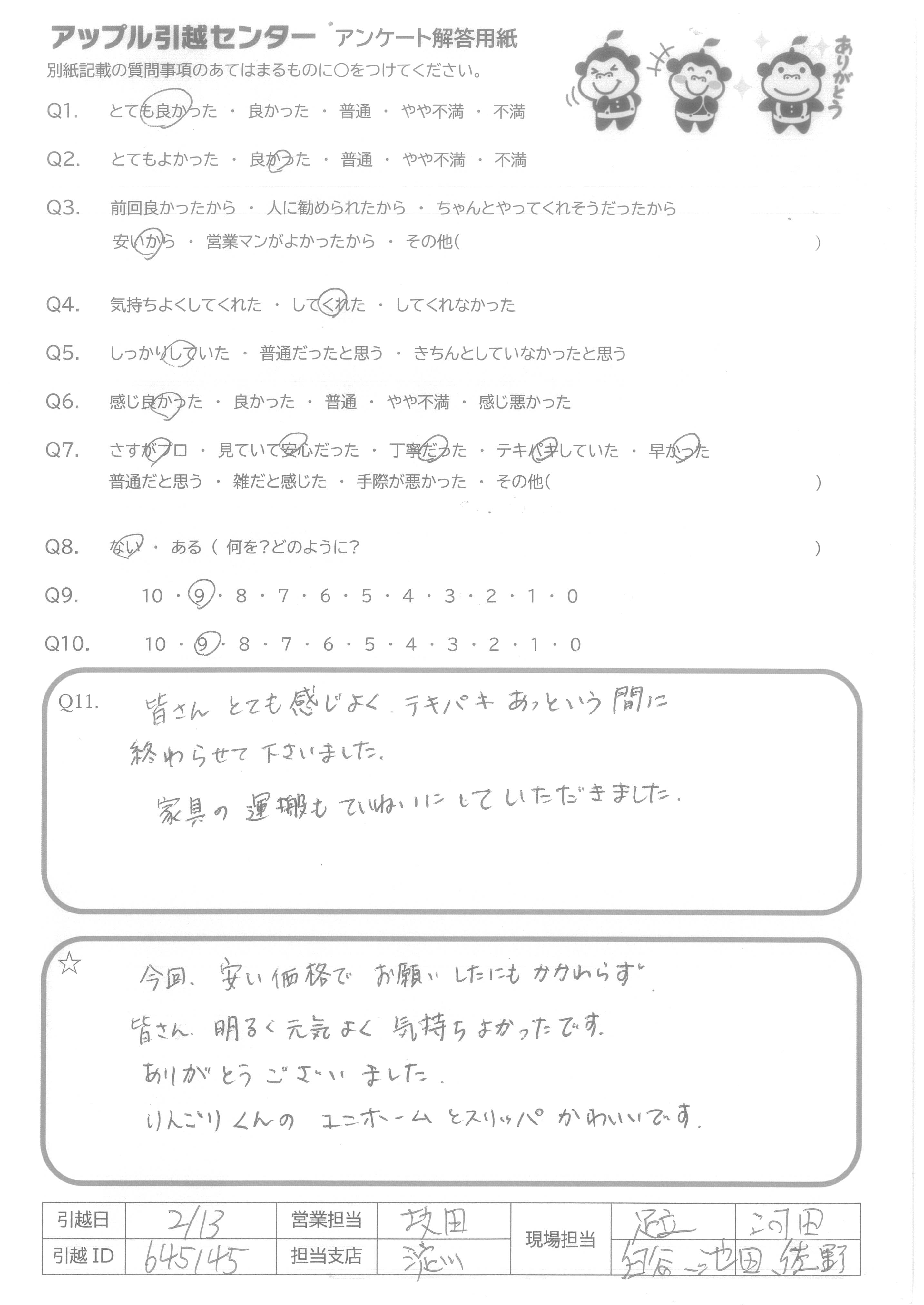 A.本日はありがとうございました。 作業開始から終わりまで、とても丁寧に対応してくださり感謝しています。価格も良心的だったので、また引越の機会があった時には、アップルさんにお願いしたいでうす。 その時はまたよろしくお願いします。
