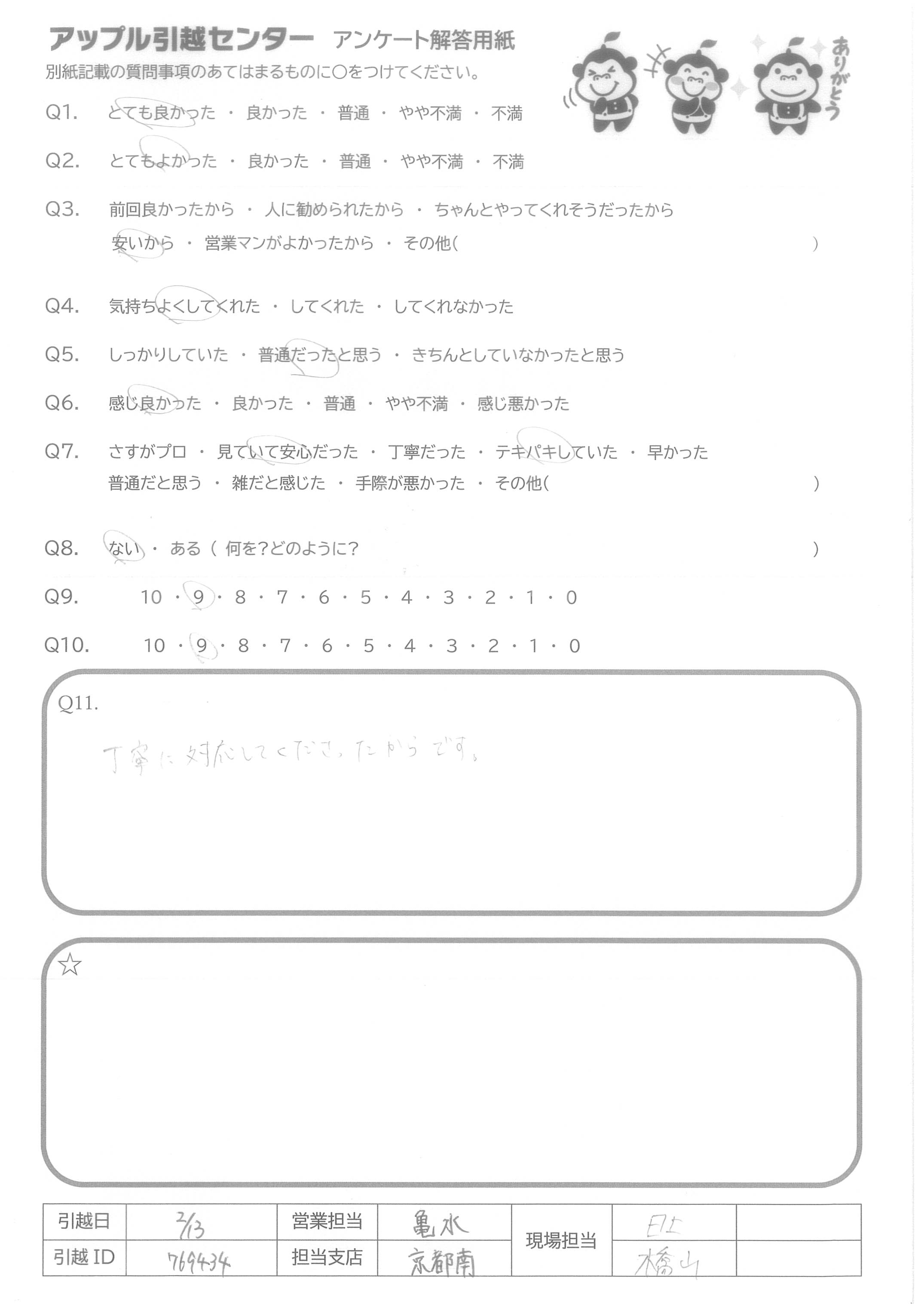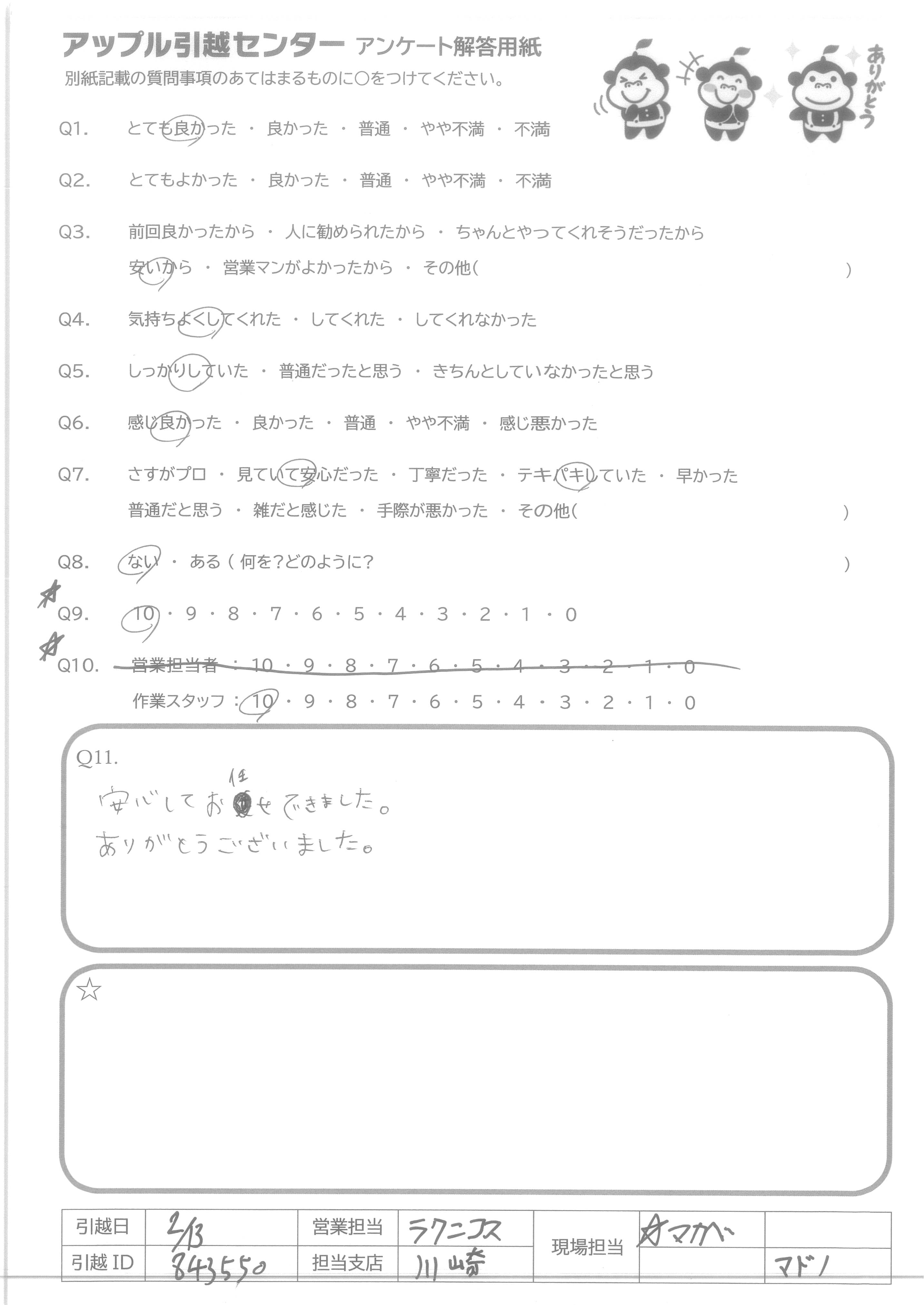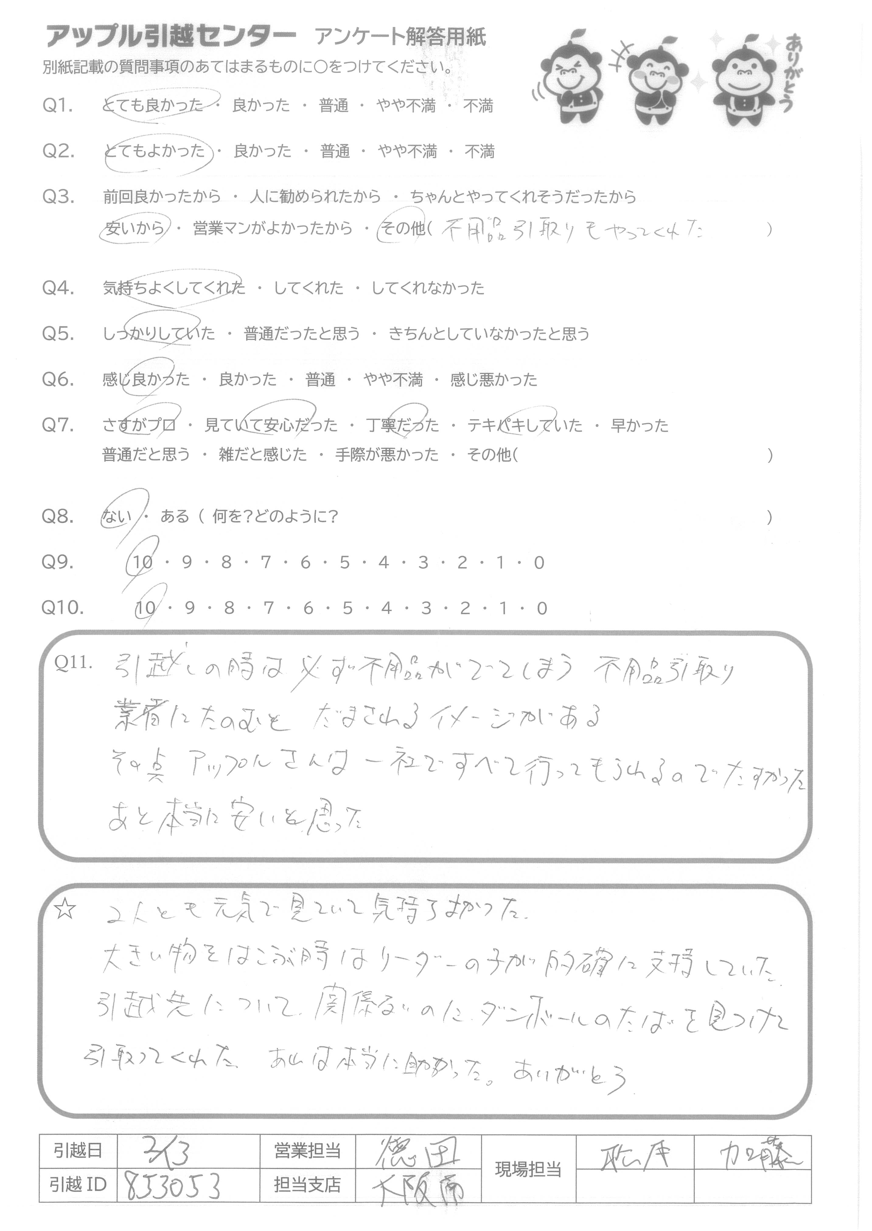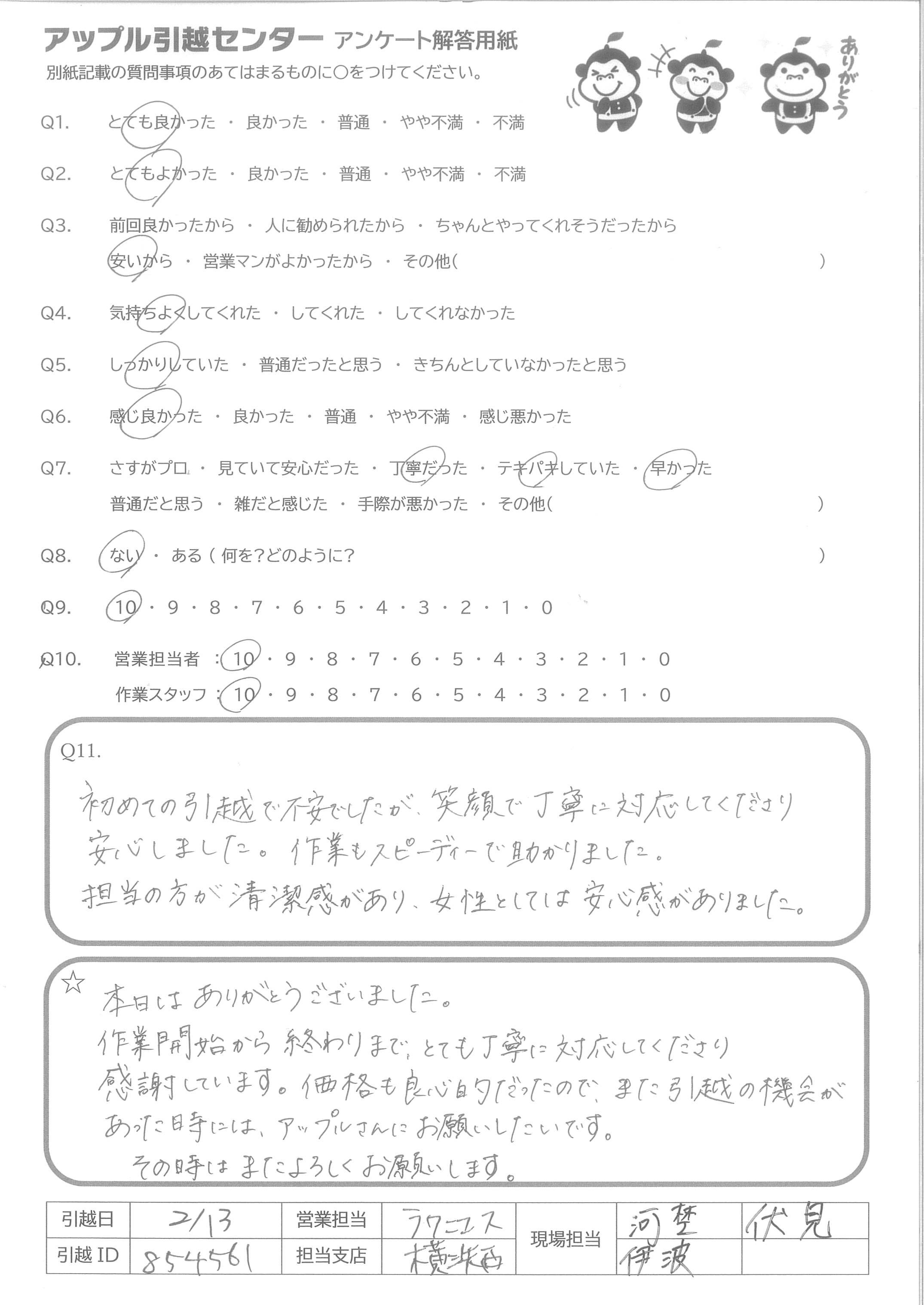 A.本日はありがとうございました。 作業開始から終わりまで、とても丁寧に対応してくださり感謝しています。価格も良心的だったので、また引越の機会があった時には、アップルさんにお願いしたいでうす。 その時はまたよろしくお願いします。