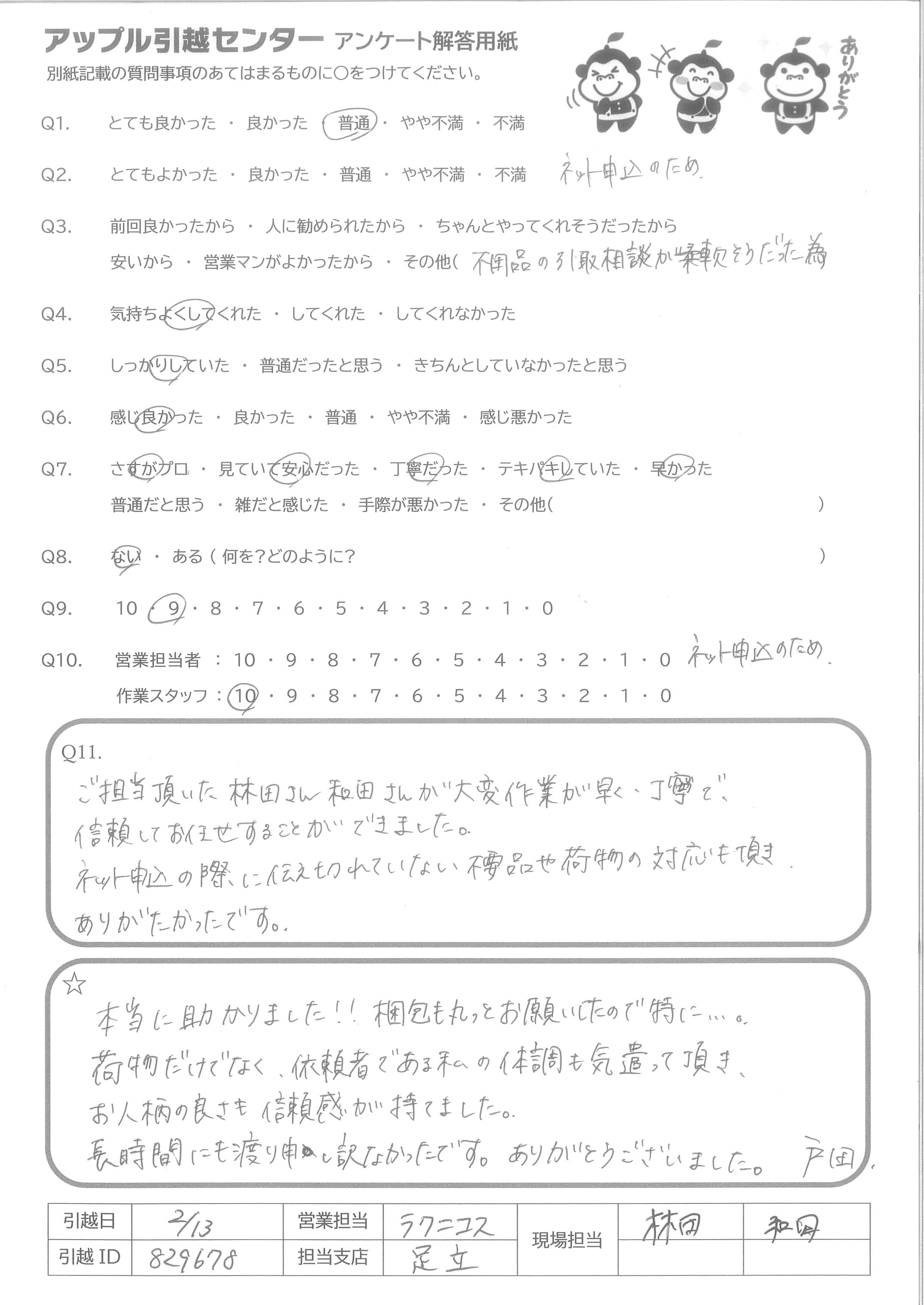 A.ご担当頂いた林田さん和田さんが大変作業が早く・丁寧で信頼してお任せすることができました。 ネット申込の際に伝えきれていない不要品や荷物の対応も頂き、ありがたかったです。