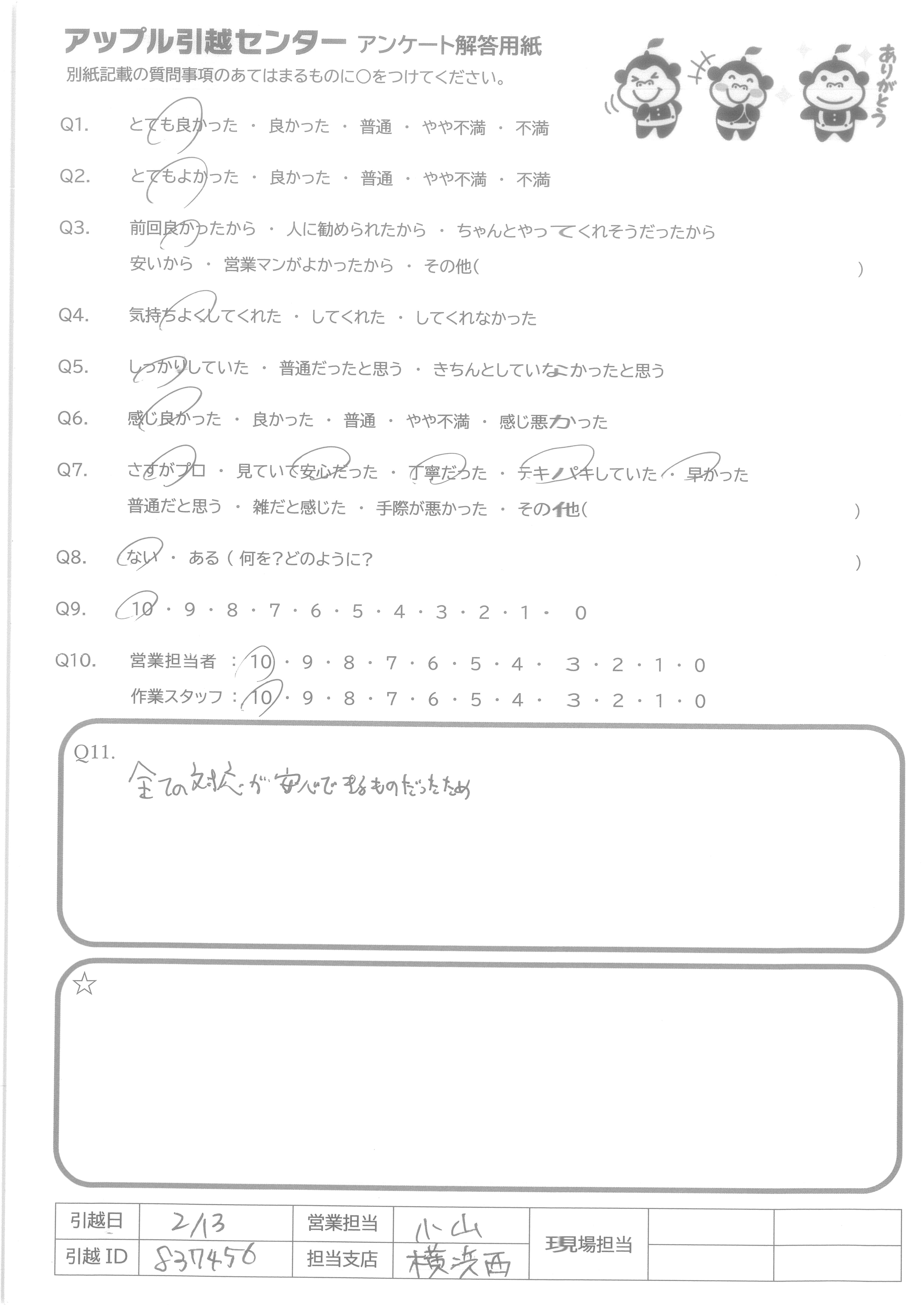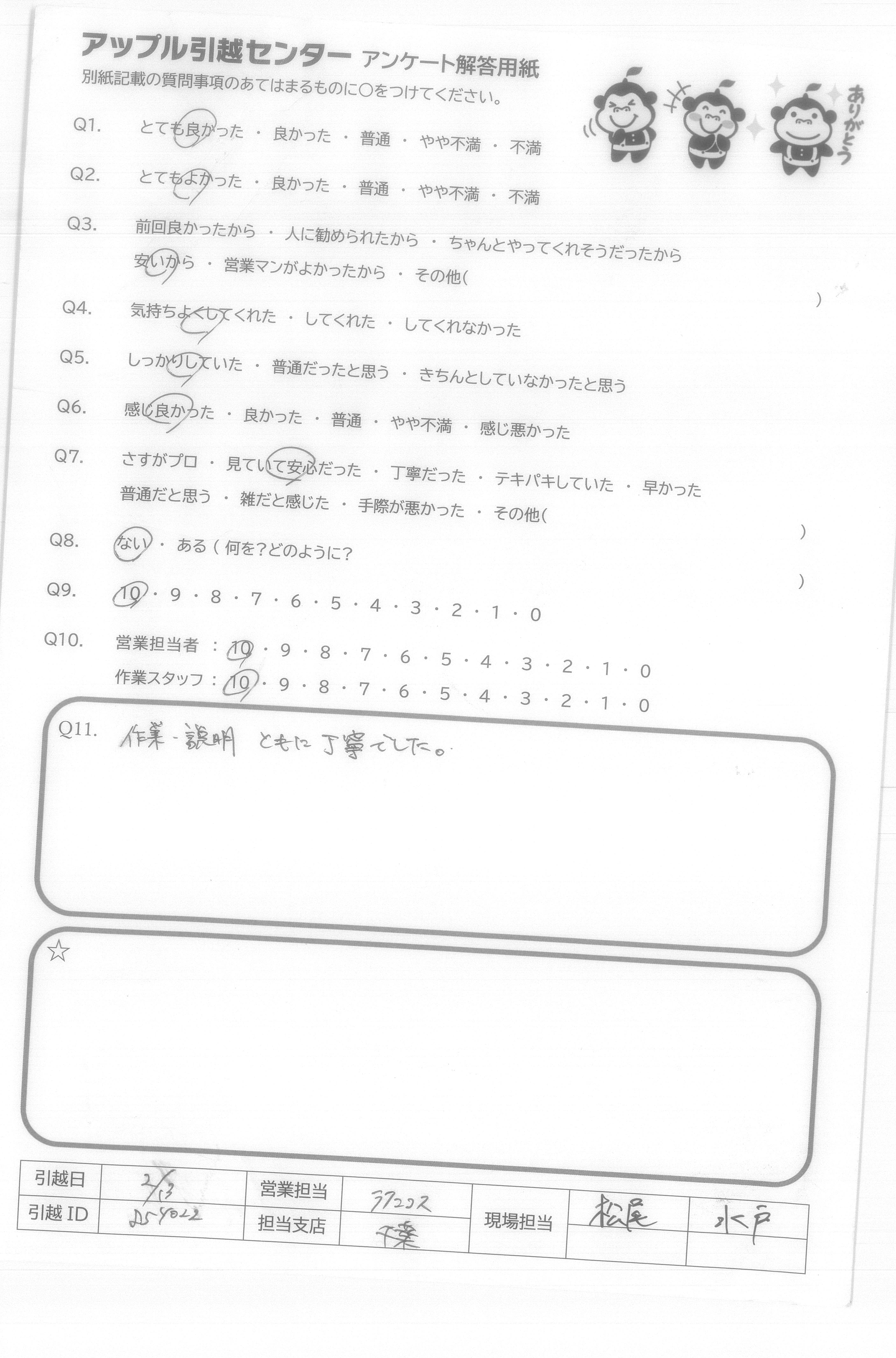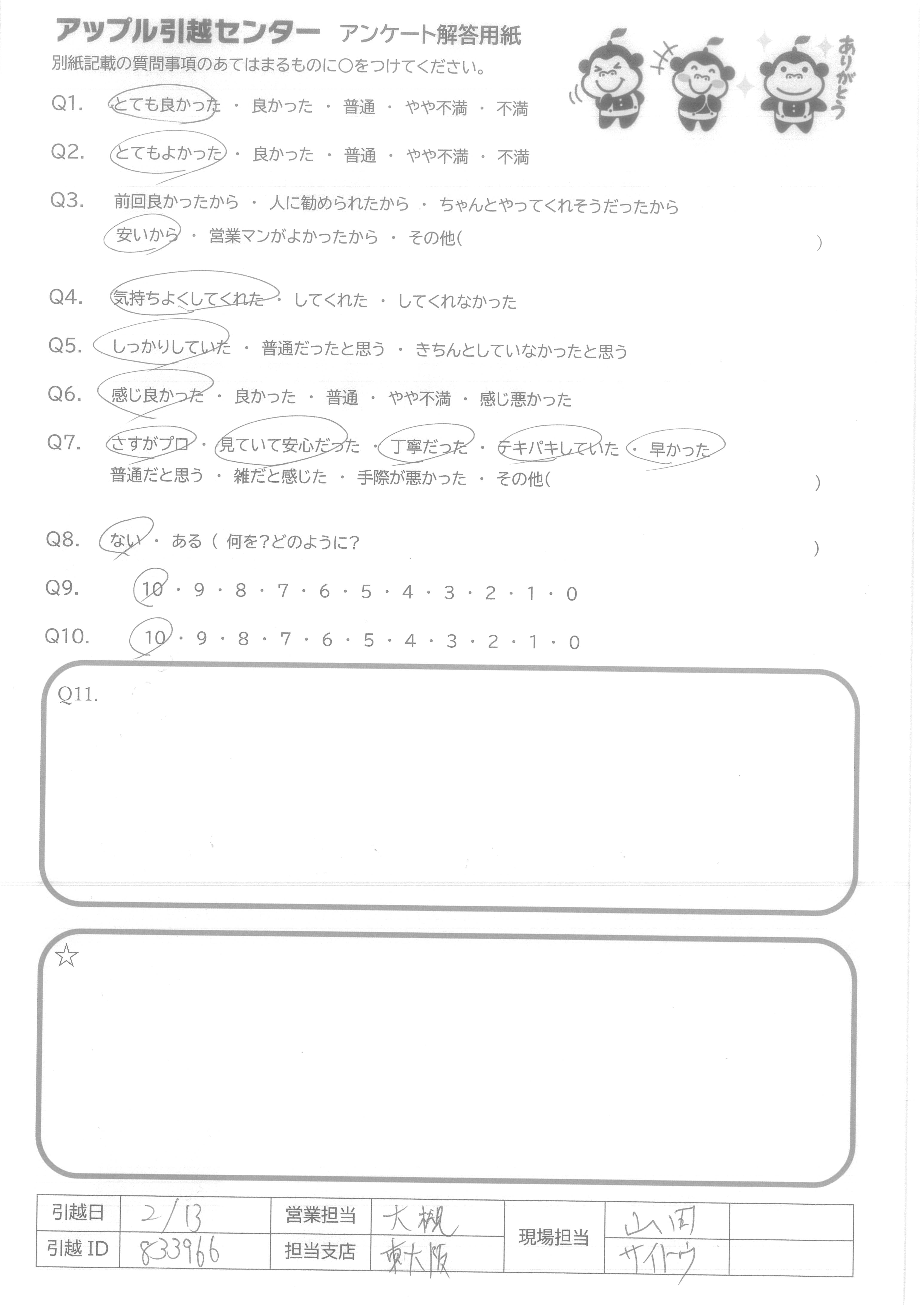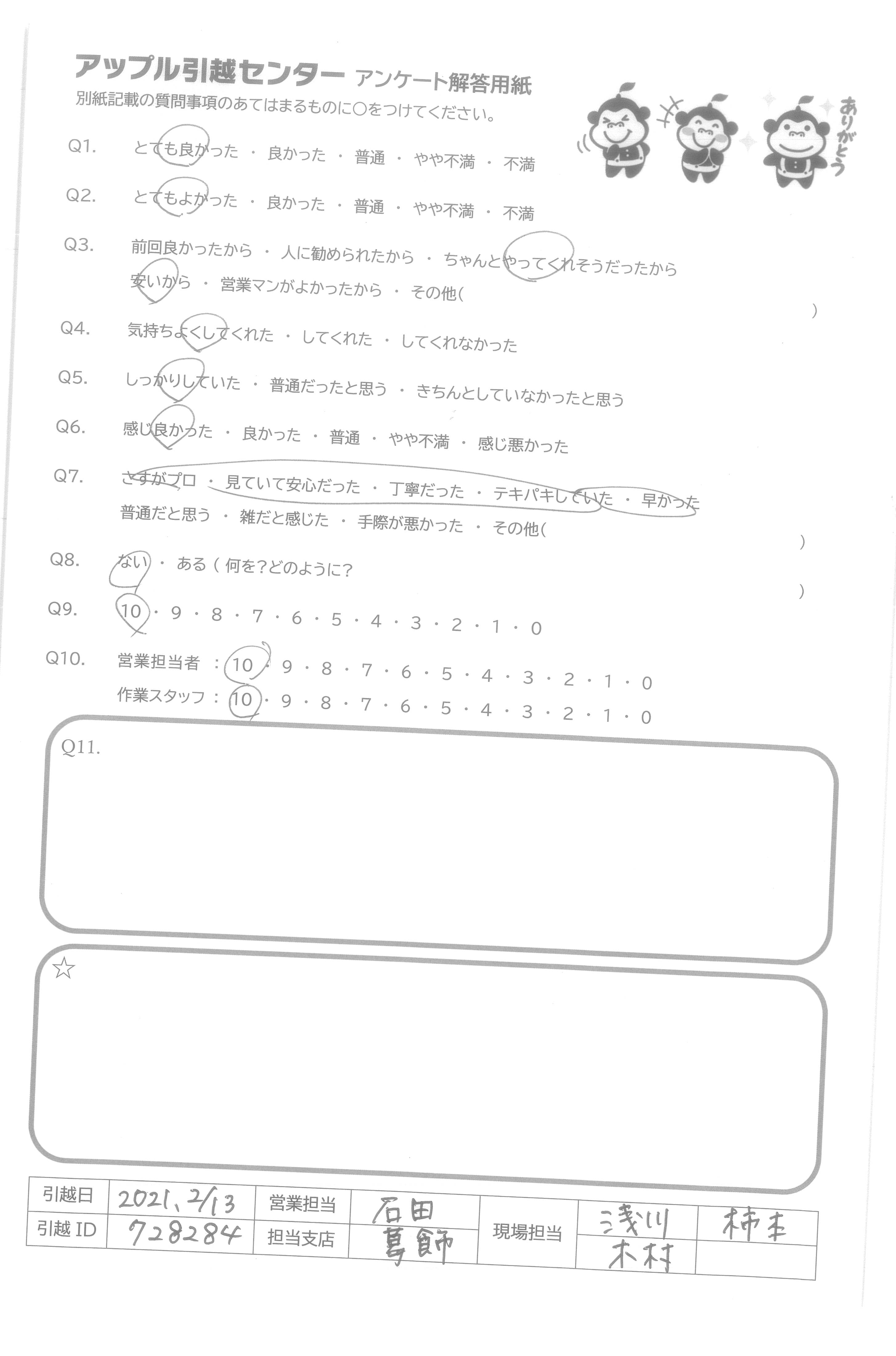 A.リーダーの人は100点満点、一番若そうな人も本当によくがんばっていた。すごく積極的に運んでいた。印象がとてもよかった。 一番年長の方は荷卸担当で、傷をつけず、そのため早いスピードで引っ越しが終わったのだと推測でき、とても手際がよかったのだと思う。 年長の方、マスクを外して仕事してた時がよく見かけられたため、それだけが残念だった。ご時世なので。 雰囲気は3名とてもよかった。 リーダーに関して、 どのような仕事をしても任せられる人だと思うので、この人がまた担当してくれるなら、アップルにまた頼みたいと思わせていただける方でした。 総合的にそのリーダーがまとめた3名のチームは素晴らしかったです。(ダンボールを届けに来られた方々も対応がよかったし(後ろにいた髪をそめた人の笑顔もよかった、電話応対の方も明るくよかった) 大変お疲れ様でした。