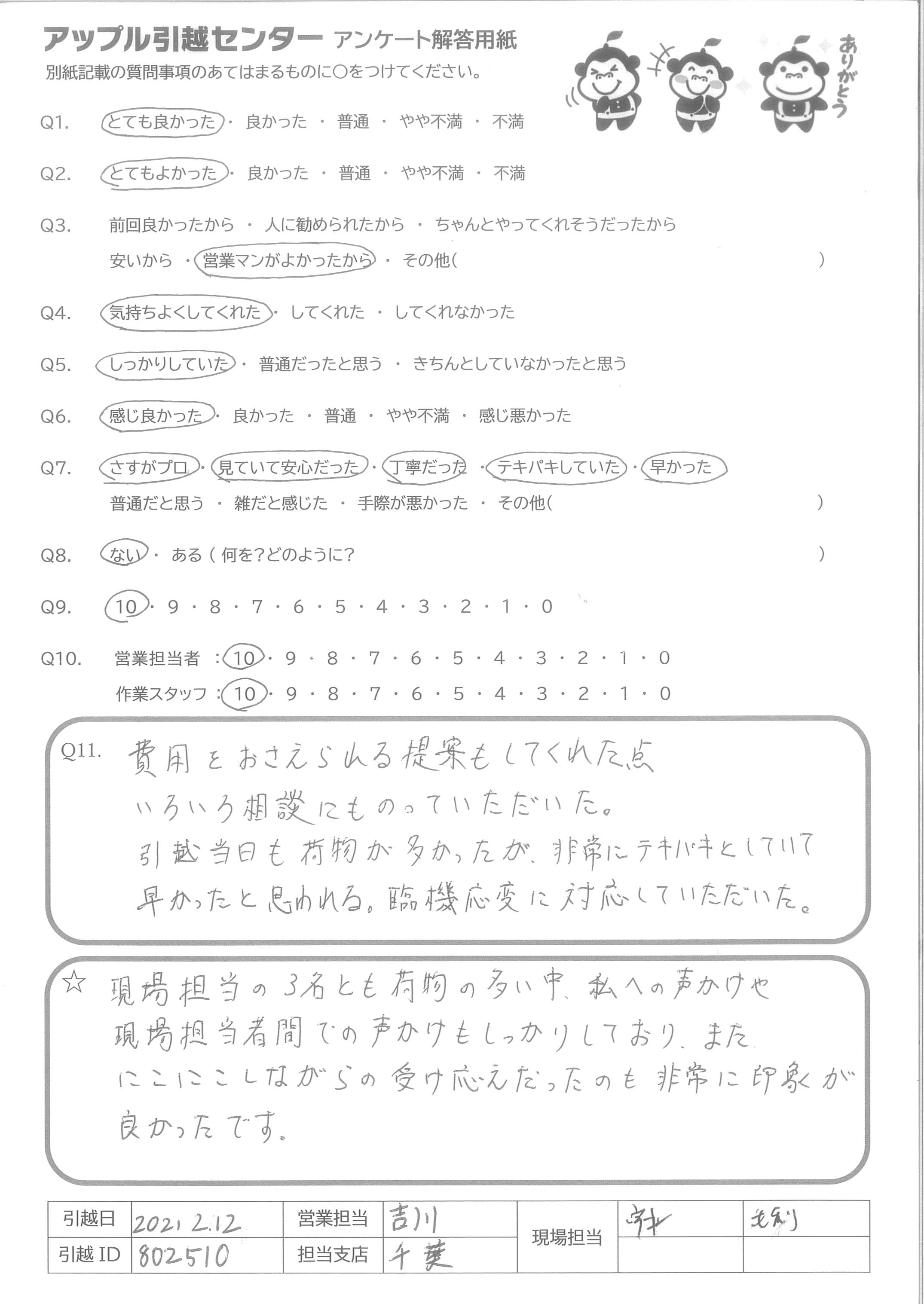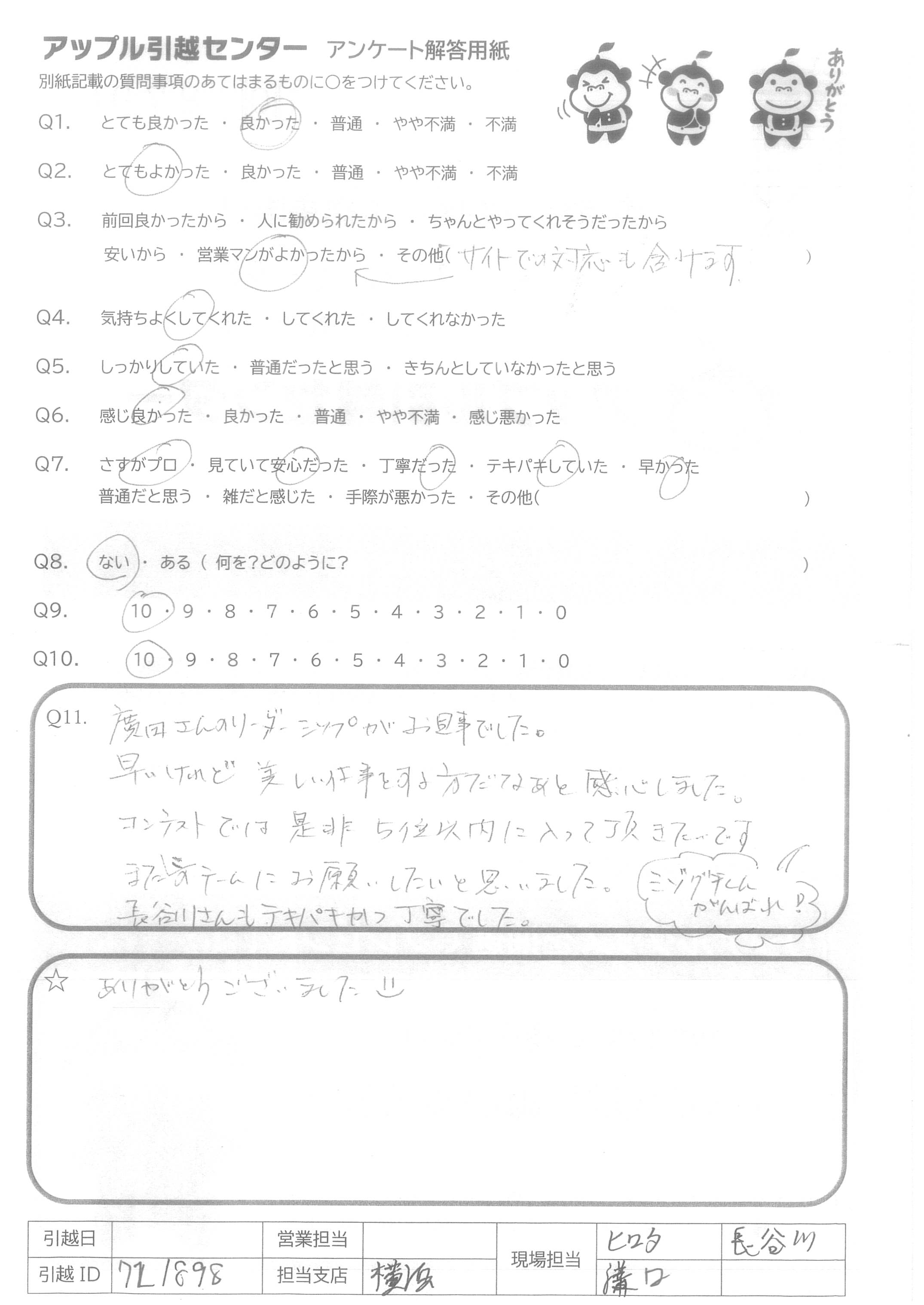A.仕事が早く、丁寧で、楽しく引っ越し作業をされており、私自身も楽しくできました。本当にありがとうございました。お身体無理せずお仕事頑張って下さい。