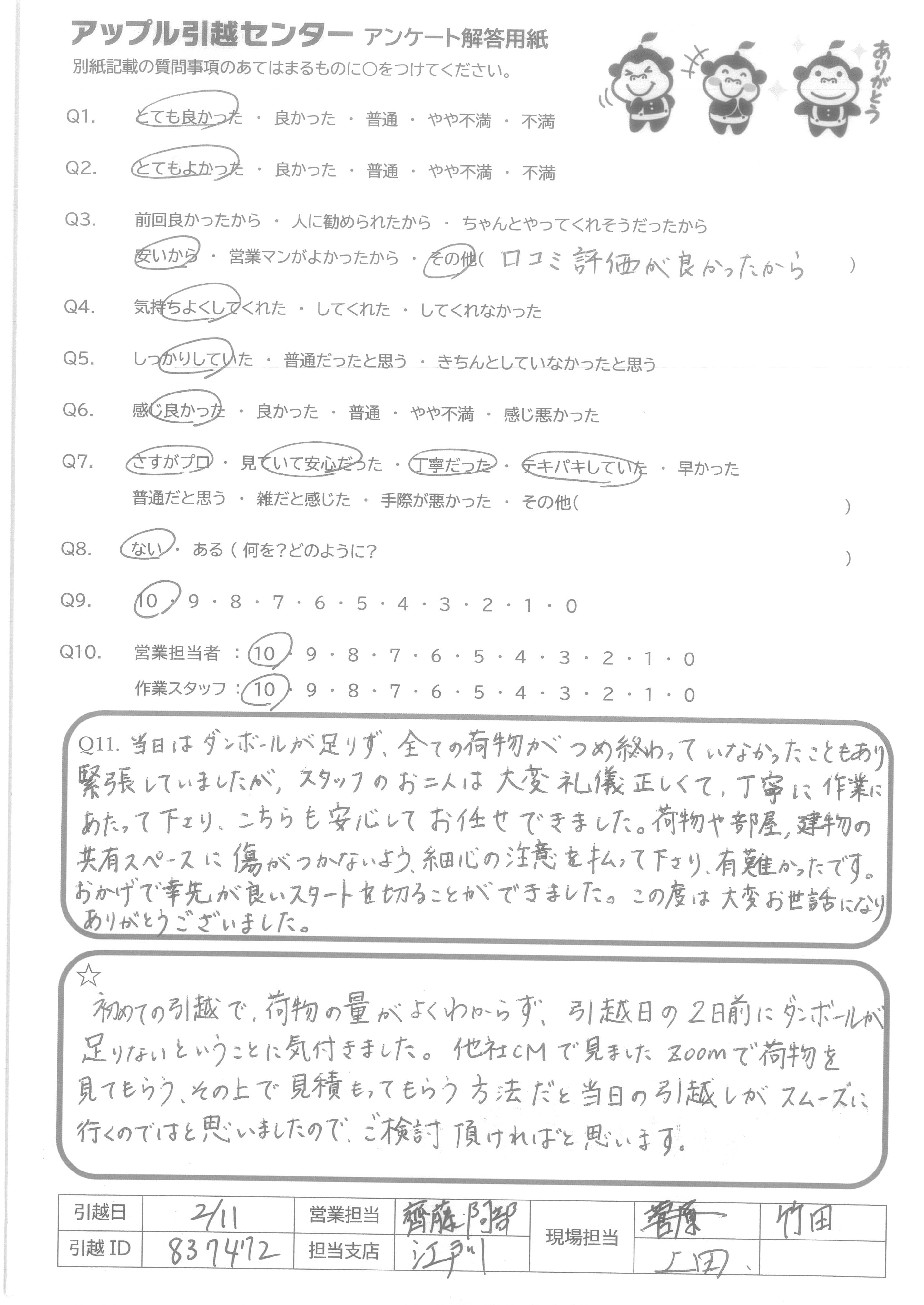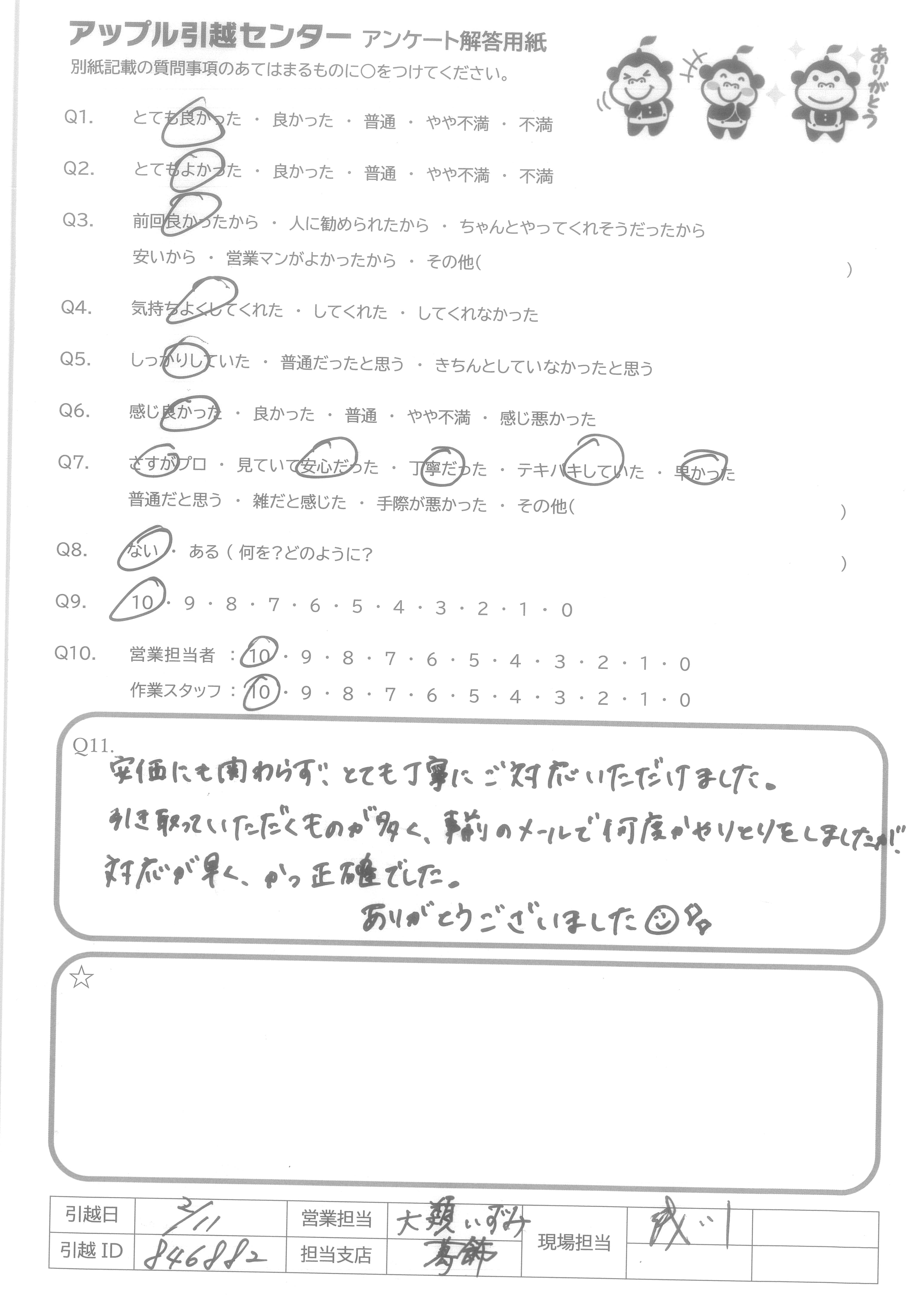 A.正直、引越業者さんはどこも同じだろうと思っていたが、アップルさんは本当に手際もよく、フラットに喋ってくれて、自分も楽しかったです。