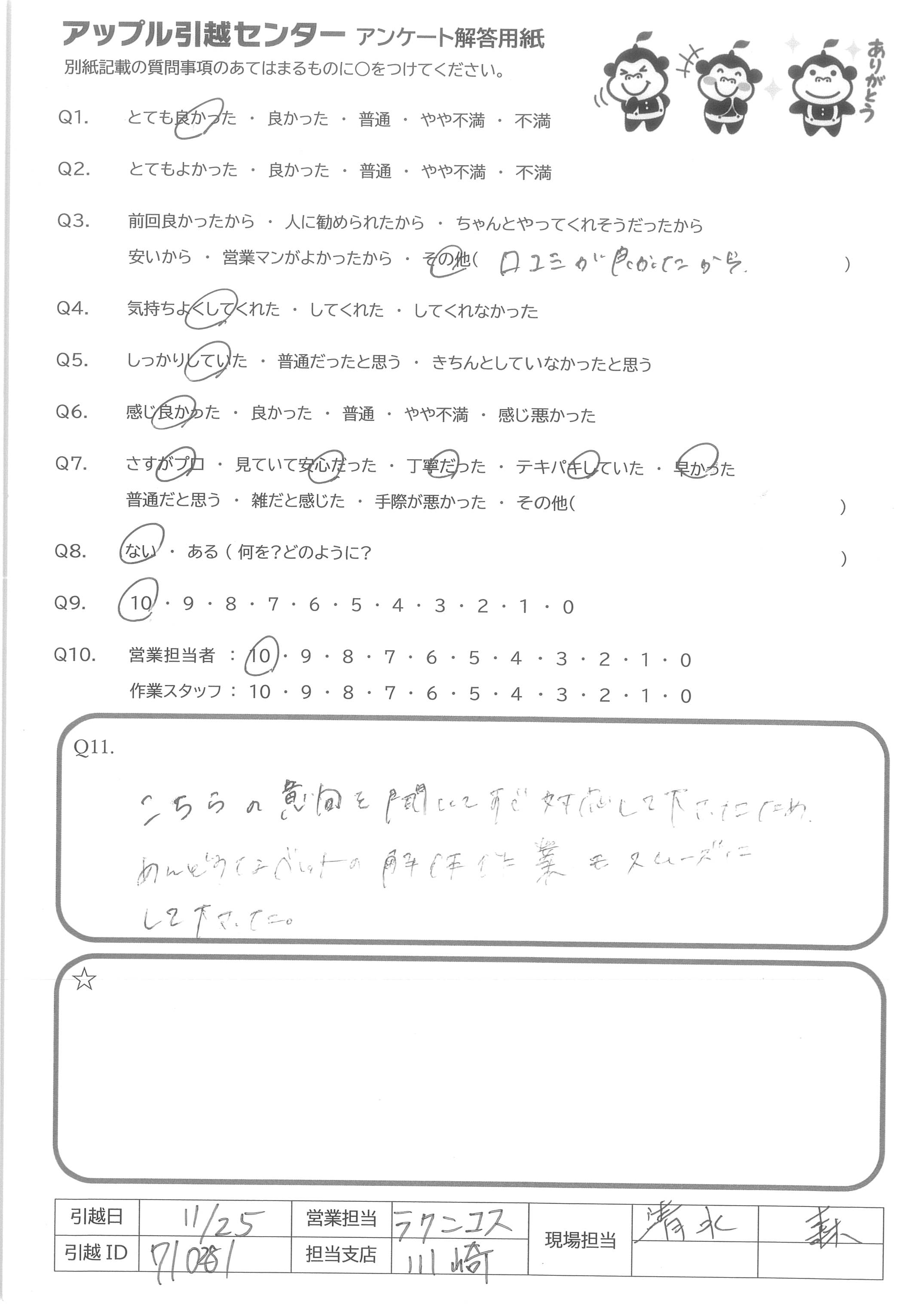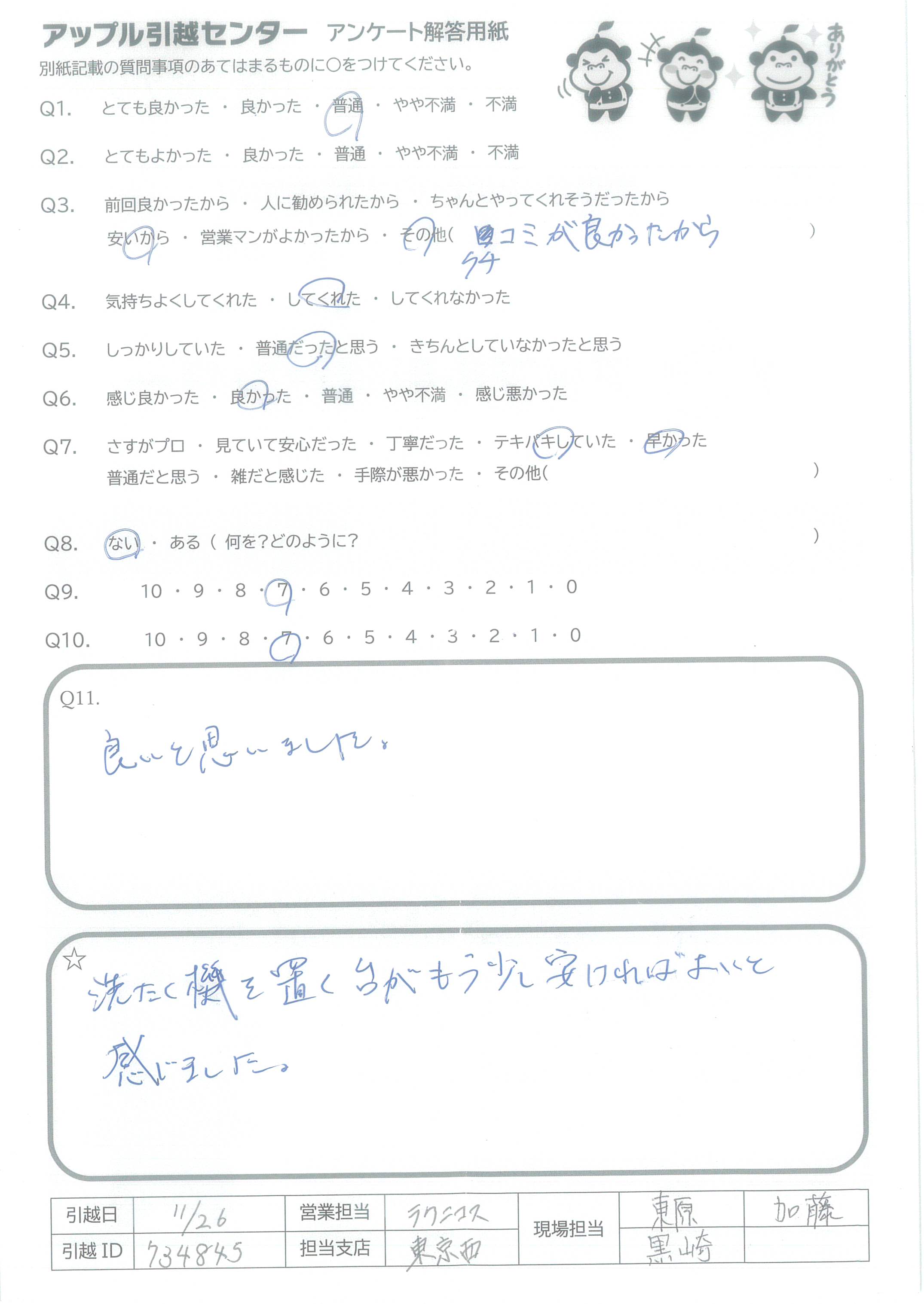 A.Q9.最初から最後までとても親切に対応して下さり面倒臭い引越しも気持ちよく終われました。 Q10.営業担当者さんは、一つ一つ丁寧に説明してくれ、とても親切に対応して下さいました。 現場スタッフさんは愛想が良く都度声かけ、確認して下さり安心してお任せすることができました。