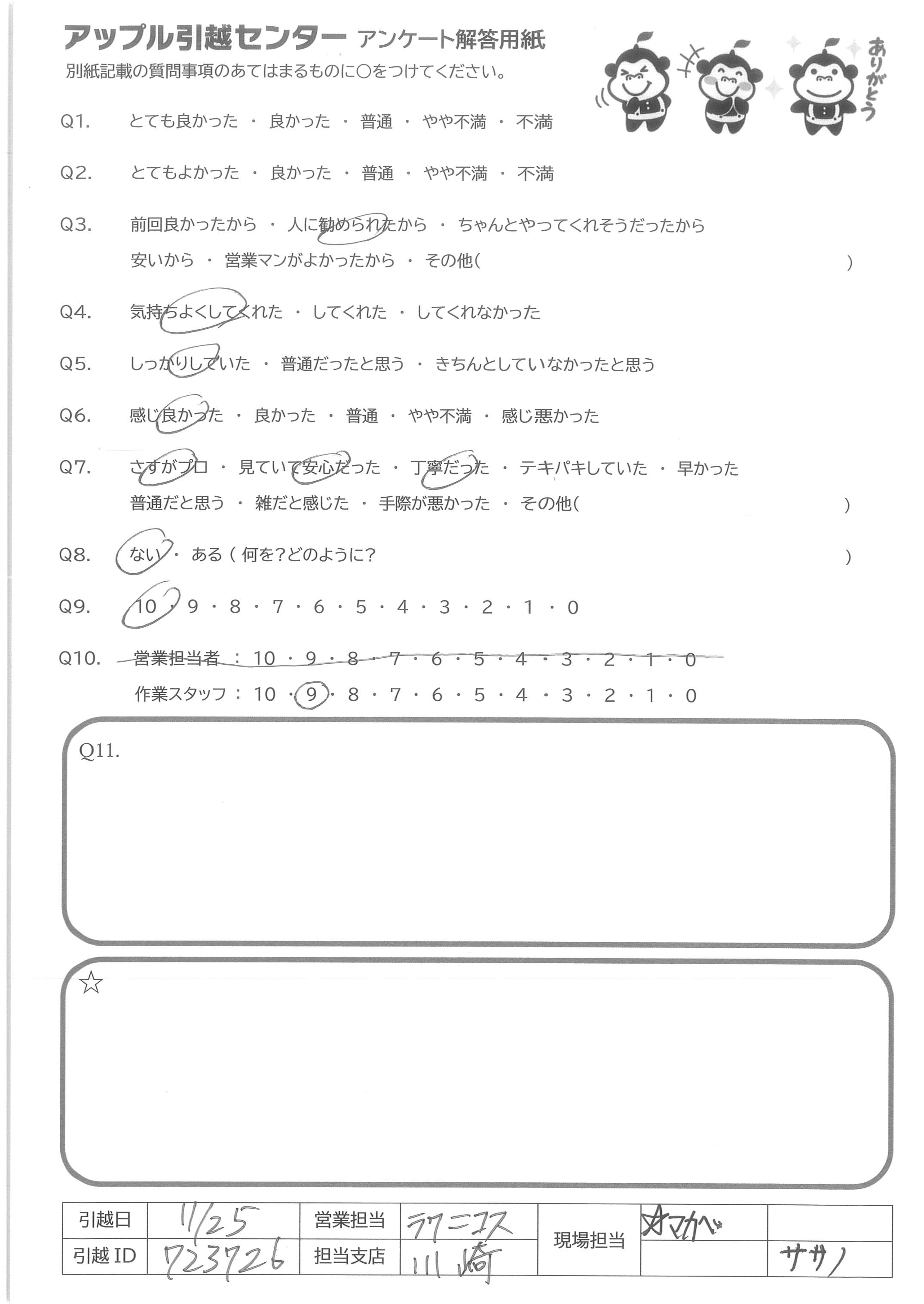 A.桑野様、池上様、松尾様 アンケート用紙の送付が遅くなり申し訳ありません。 引越しの際にご丁寧に対応いただきありがとうございました。 またの機会がありましたらよろしくお願い致します。