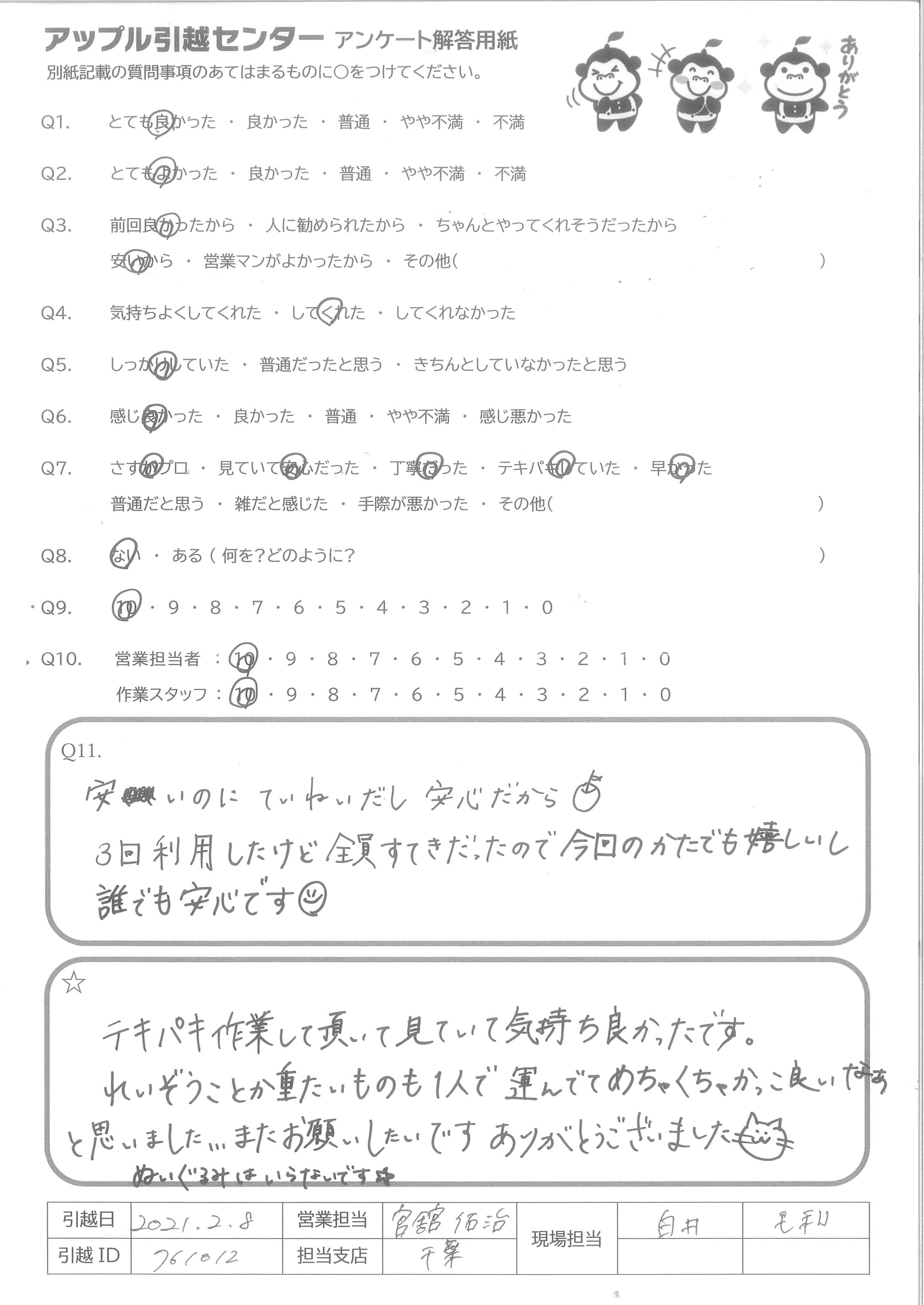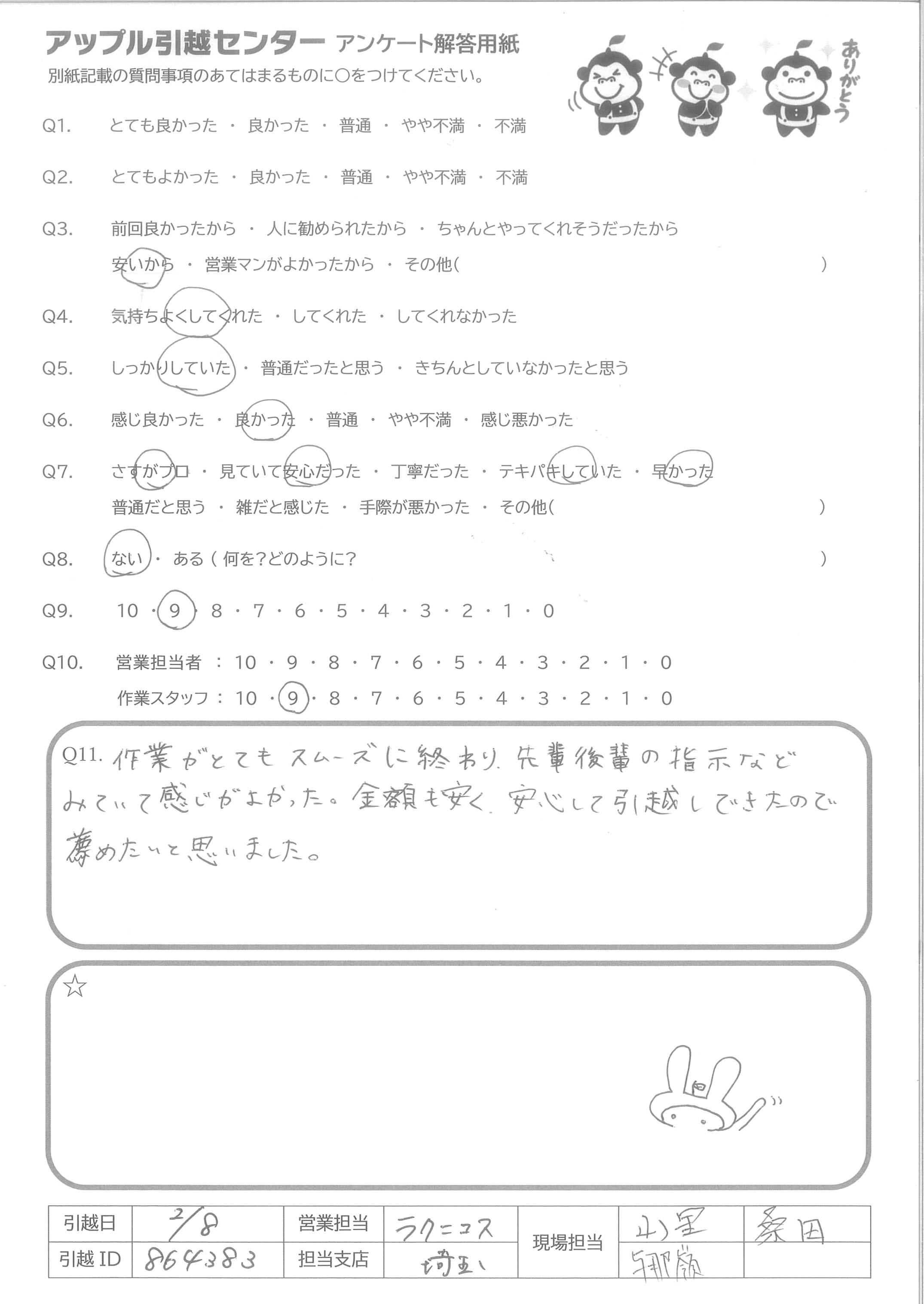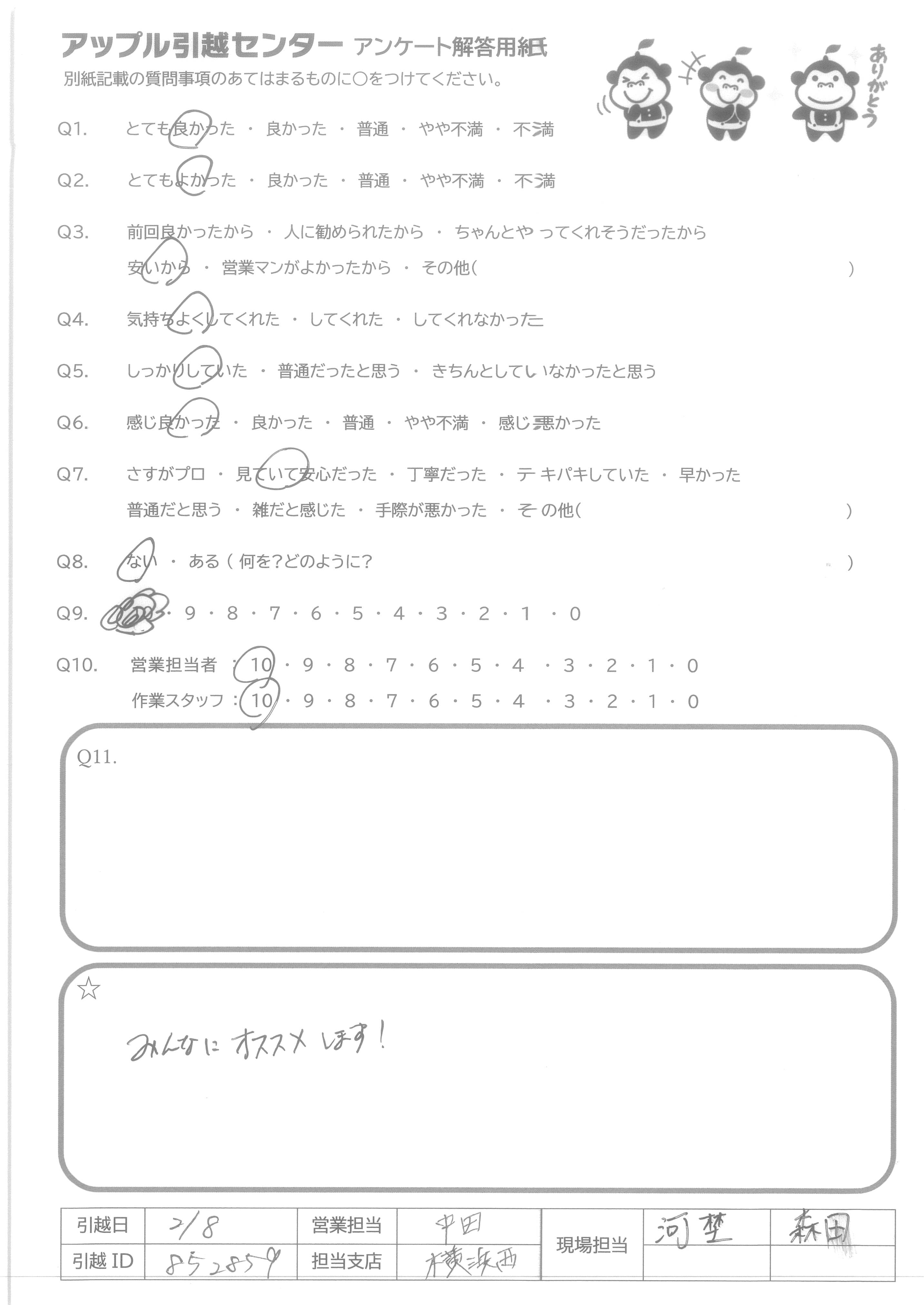 A.作業がとてもスムーズに終わり、先輩後輩の指示などみていて感じがよかった。金額も安く、安心して引越しできたので薦めたいと思いました。