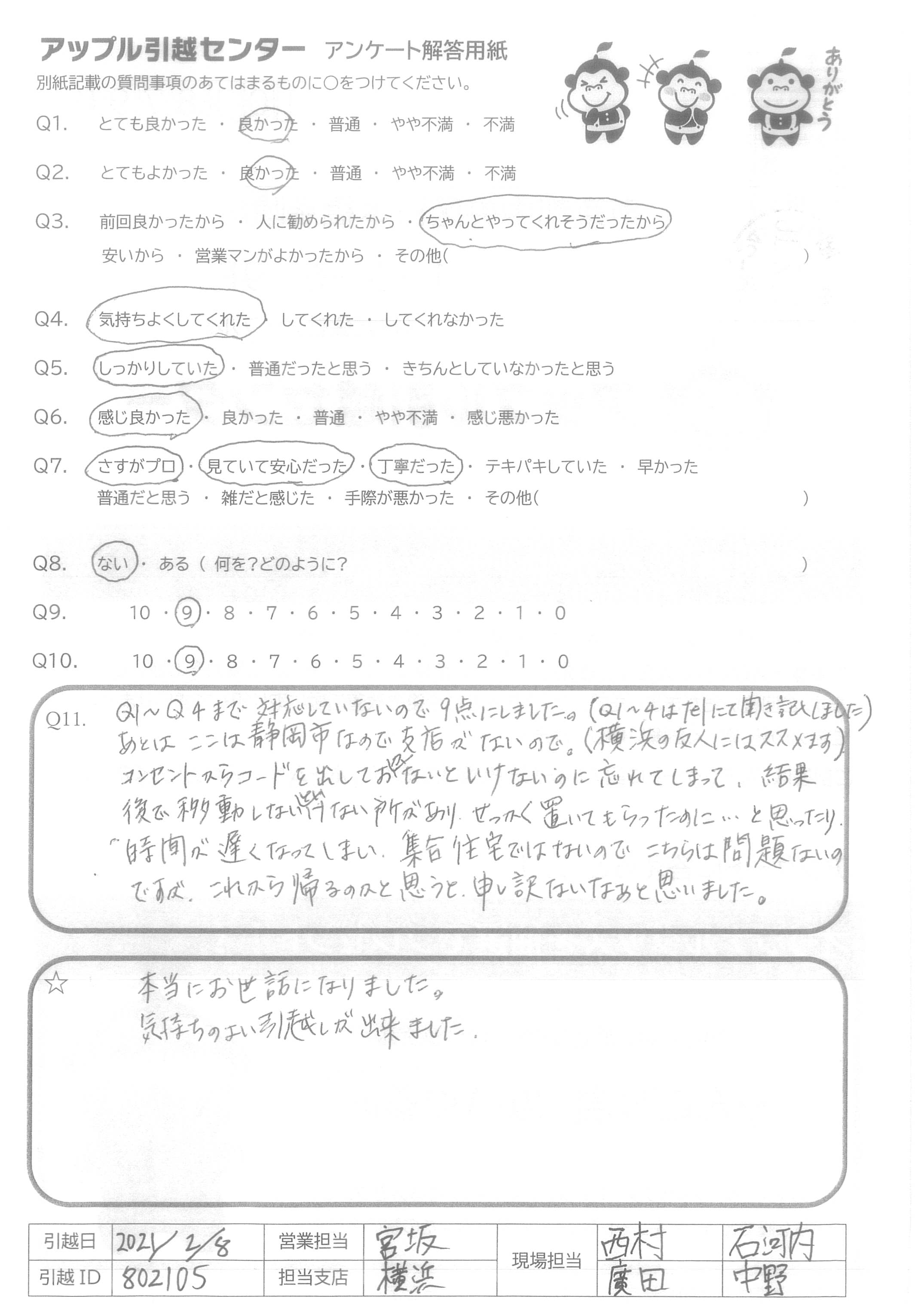 A.Q1~Q4まで対応していないので9点しました。(Q1~4はTelにて聞き記入しました) あとはここは静岡市なので支店がないので。(横浜の友人にはススメます。) コンセントからコードを出しておかないといけないのに忘れてしまって、結果後で移動しないといけない所がありせっかく置いてもらったのに・・・と思ったり「時間が遅くなってしまい、集合住宅ではないのでこちらは問題ないのですが、これから帰るのかと思うと、申し訳ないなあと思いました。