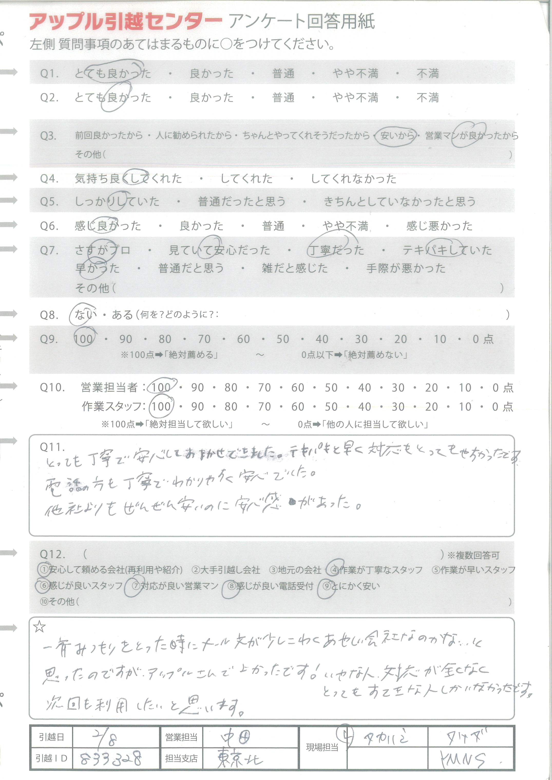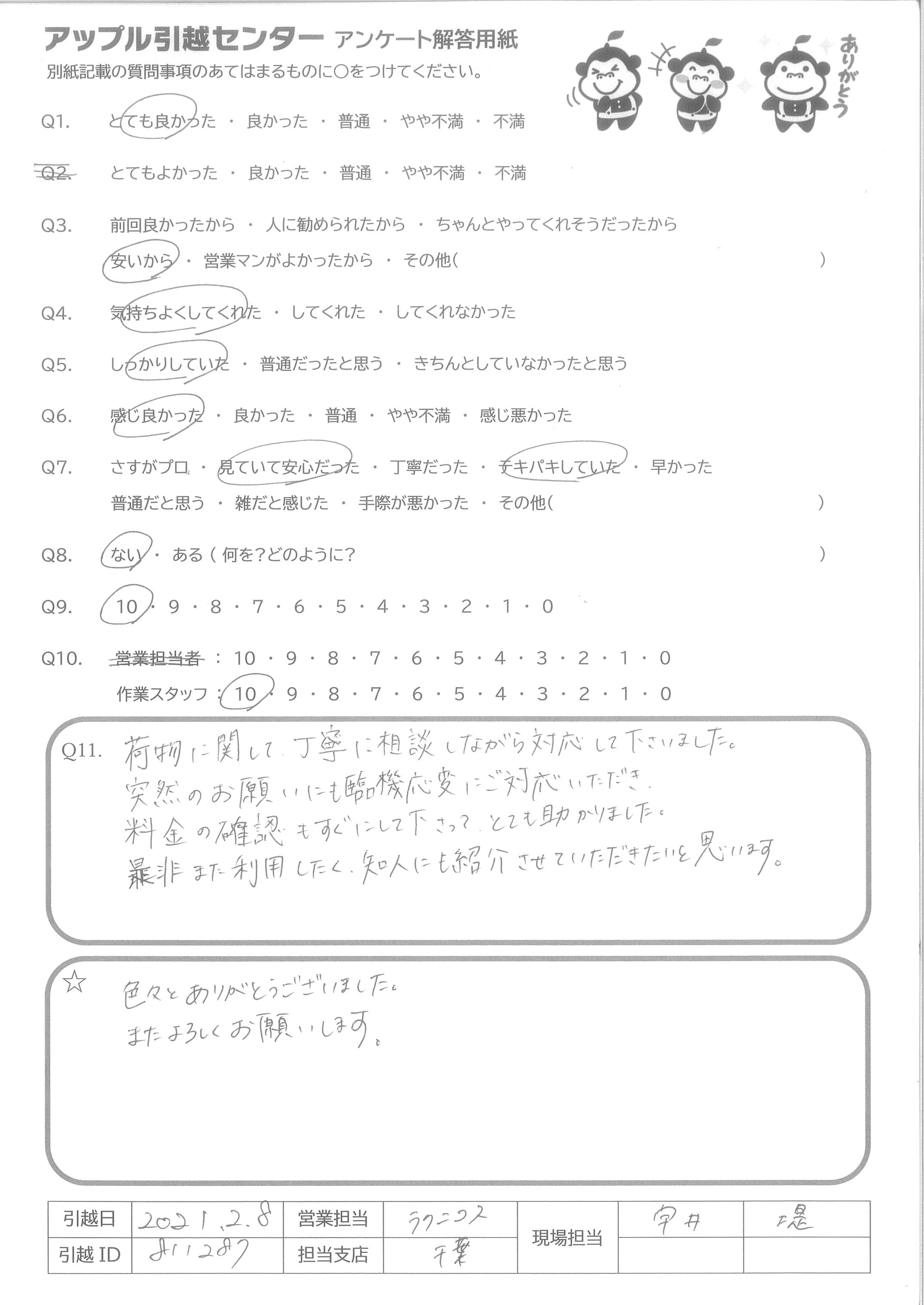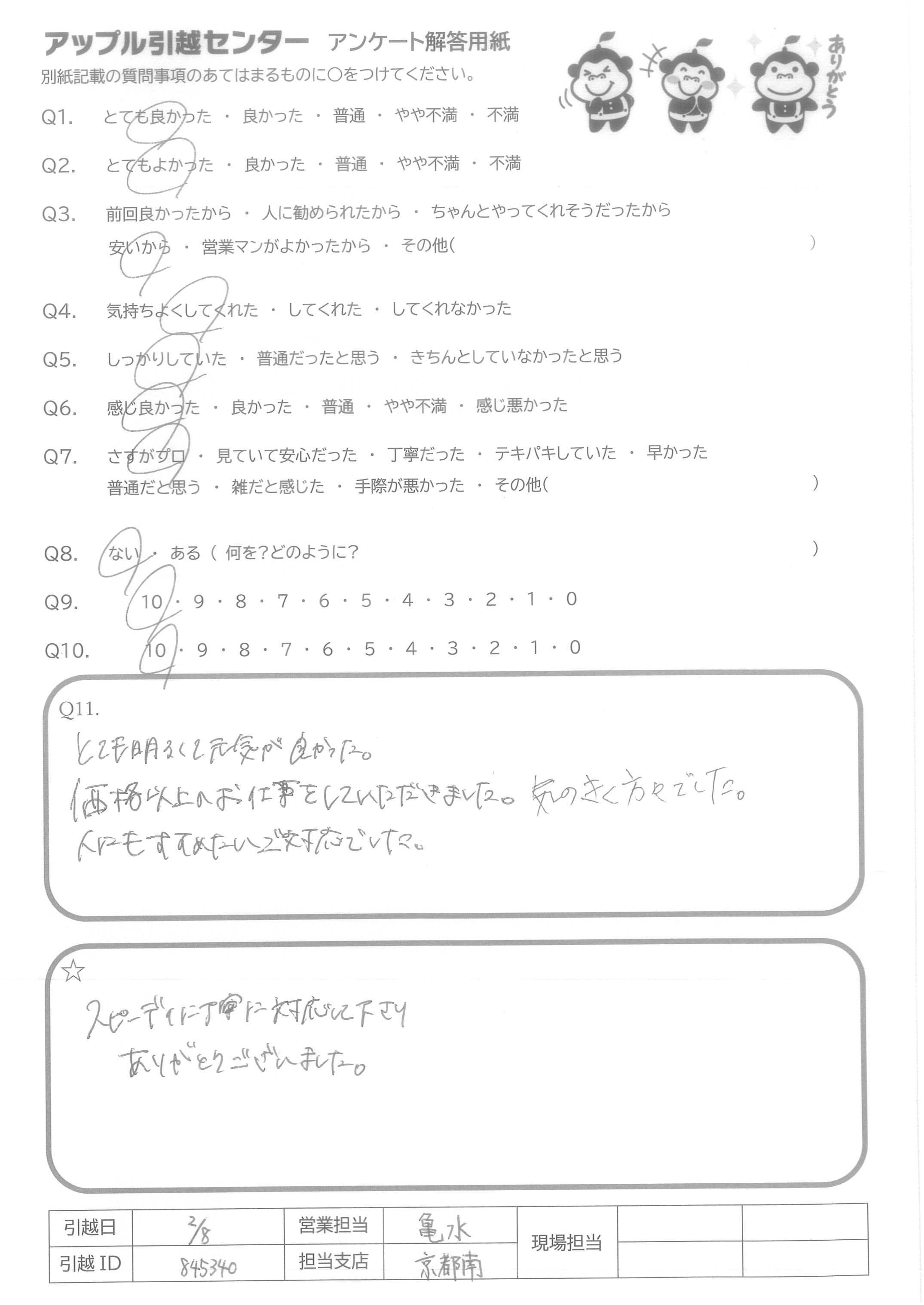 A.一斉みつもりをとった時に、メール文が少しこわくあやしい会社なのかな・・・と思ったのですが、アップルさんでよかったです!いやな人、対応が全くなくとってもすてきな人しかいなかったです。 次回も利用したいと思います。