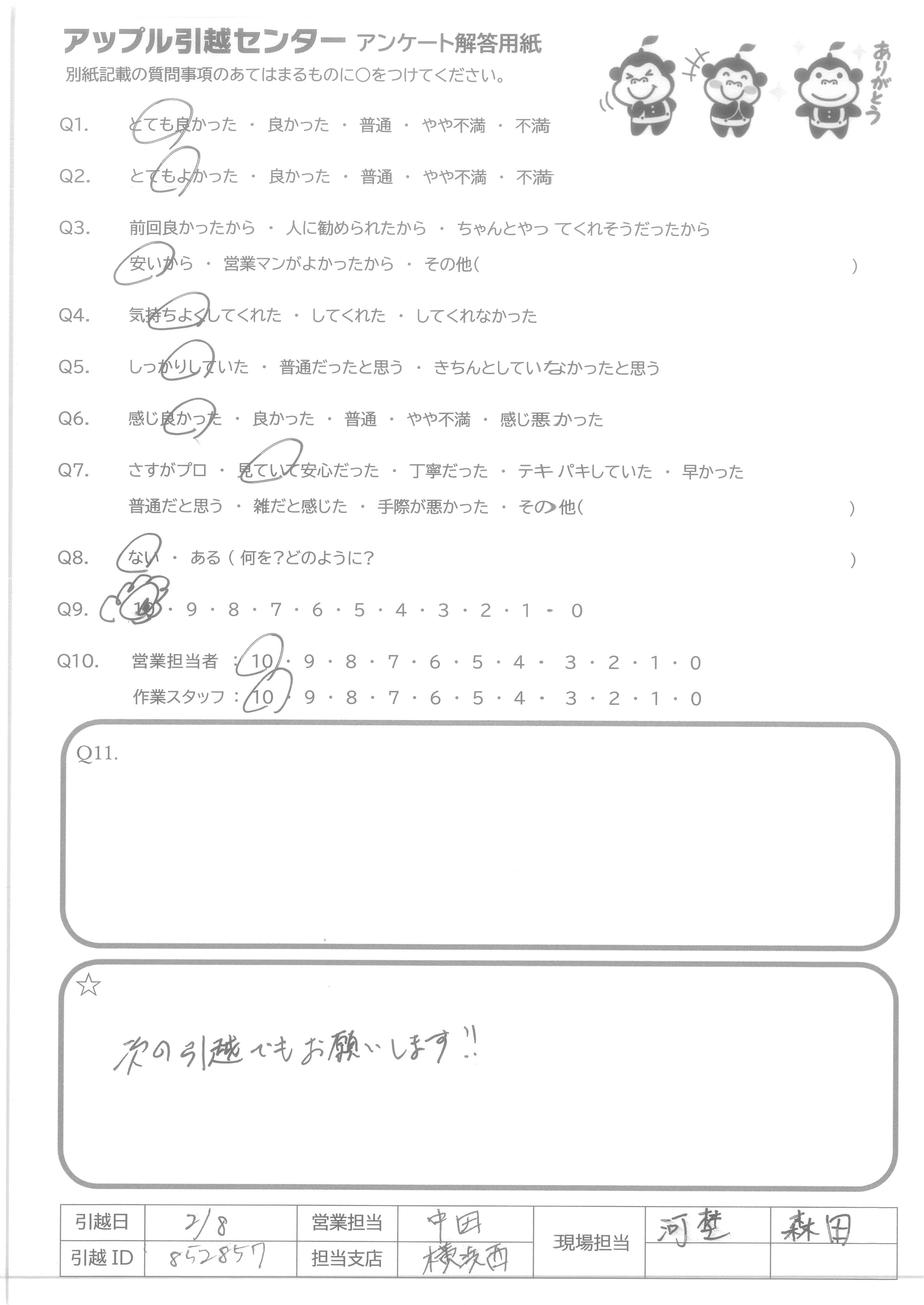 A.担当の方も特に悪い点はなかったし、 なにより長距離もとても安く運んでもらえたので助かりました。 特に好印象という感じもなかったので満点はつけてませんがとても満足しています。