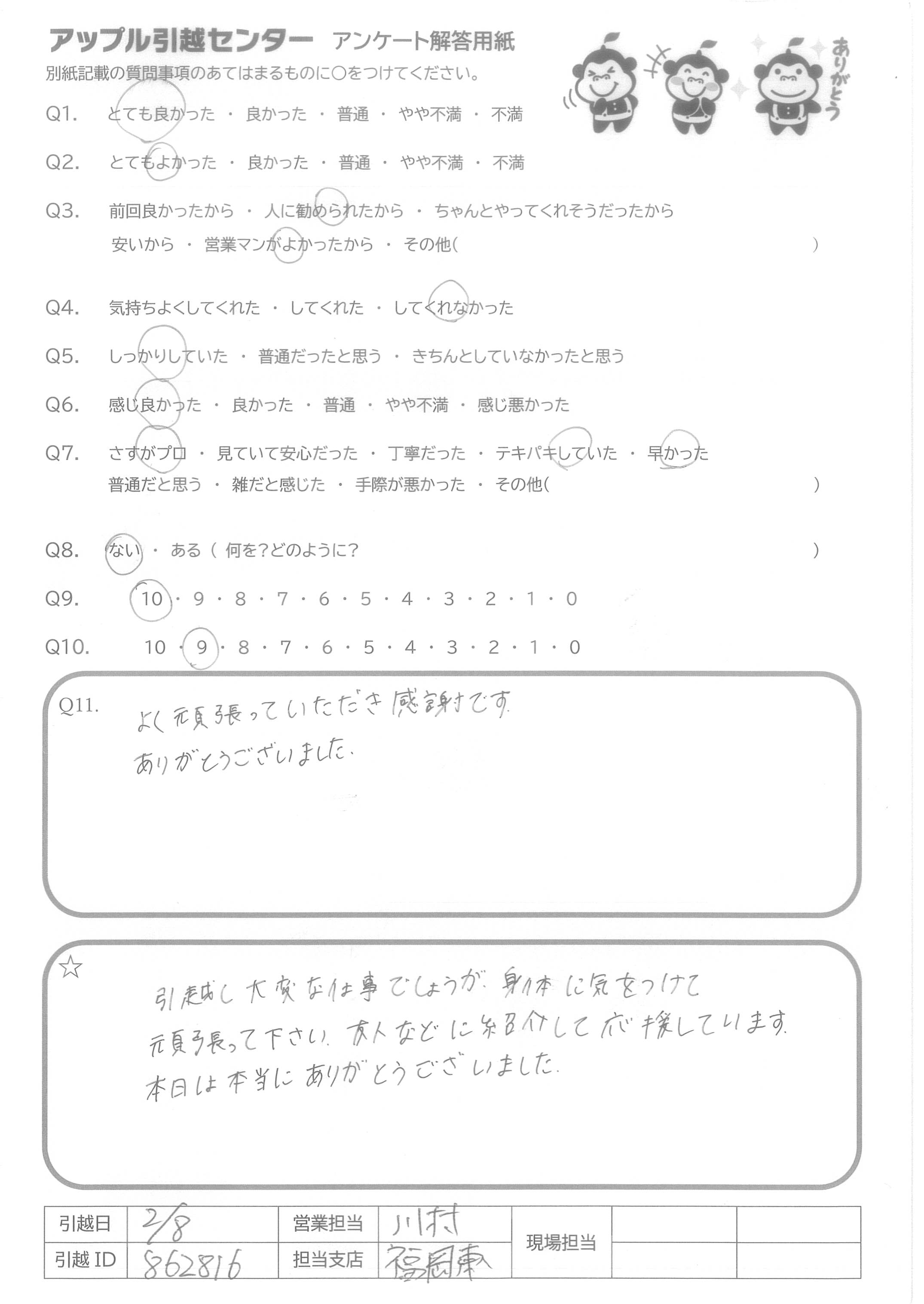 A.引越し大変な仕事でしょうが、身体に気をつけて頑張って下さい。友人などに紹介して応援しています。本日は本当にありがとうございました