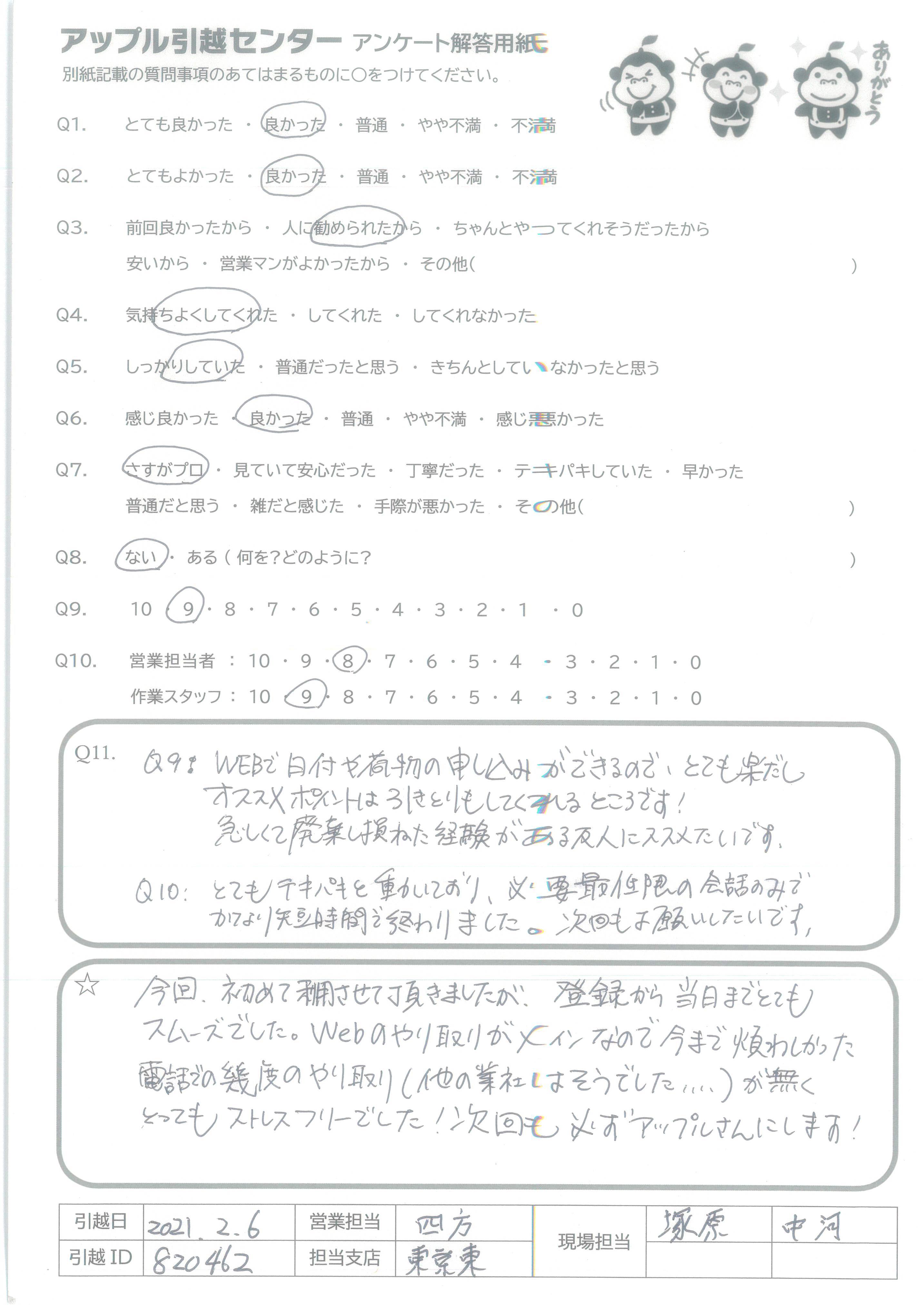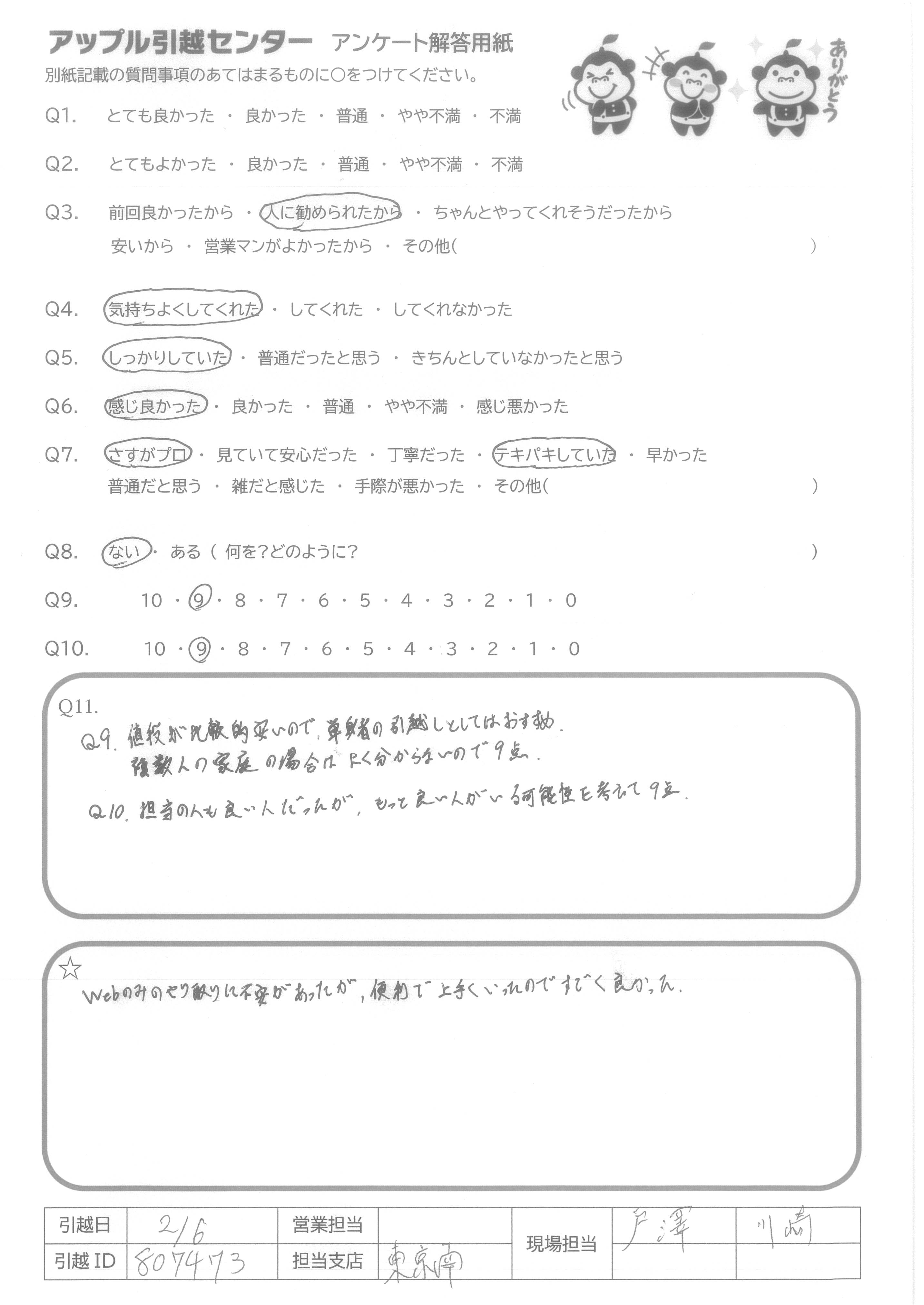 A.Q9,値段が比較的安いので、単身者の引越しとしてはおすすめ。 複数人の家庭の場合はよく分からないので9点。 Q10,担当の人も良い人だったが、もっと良い人がいる可能性を考えて9点