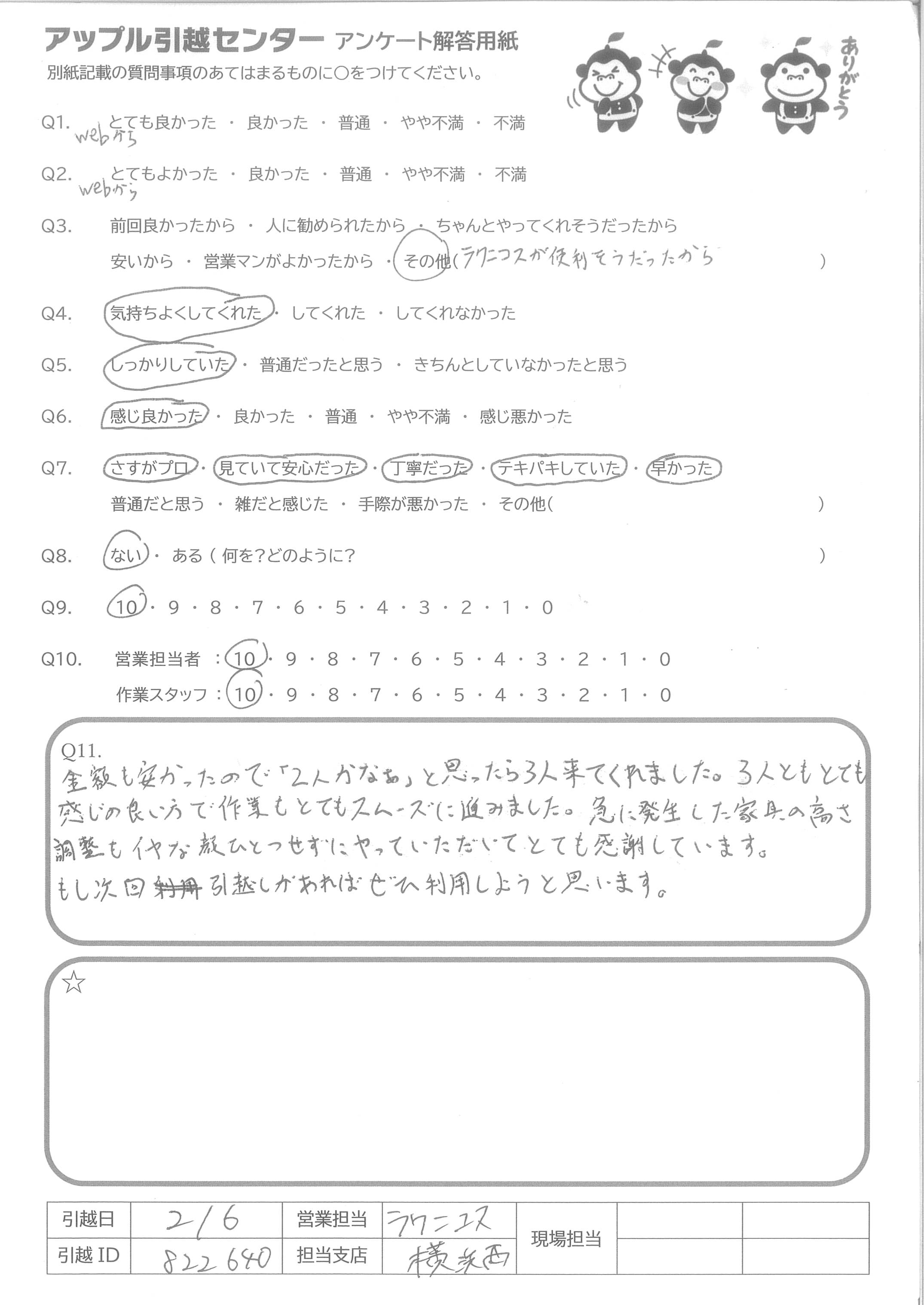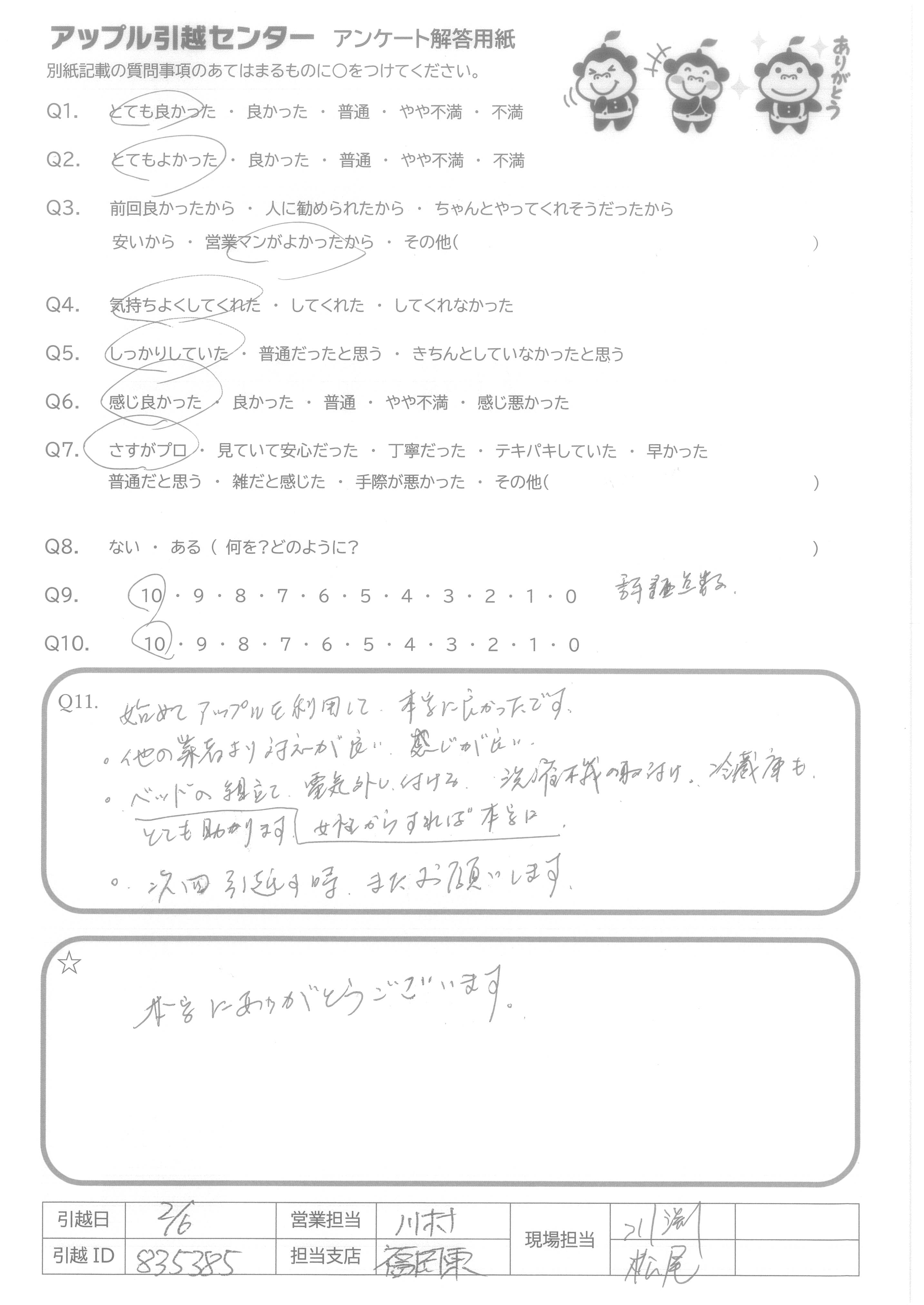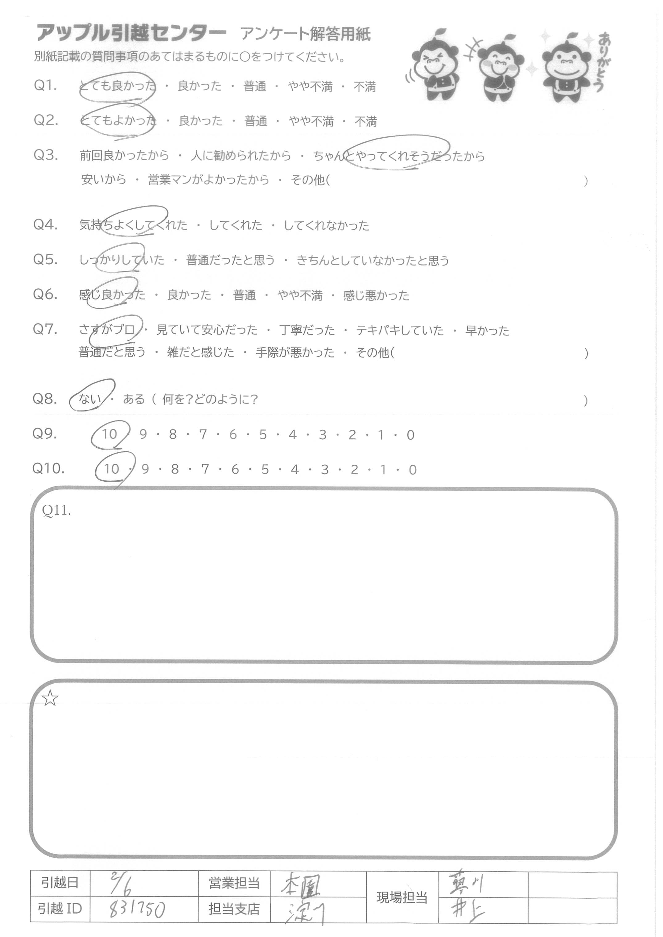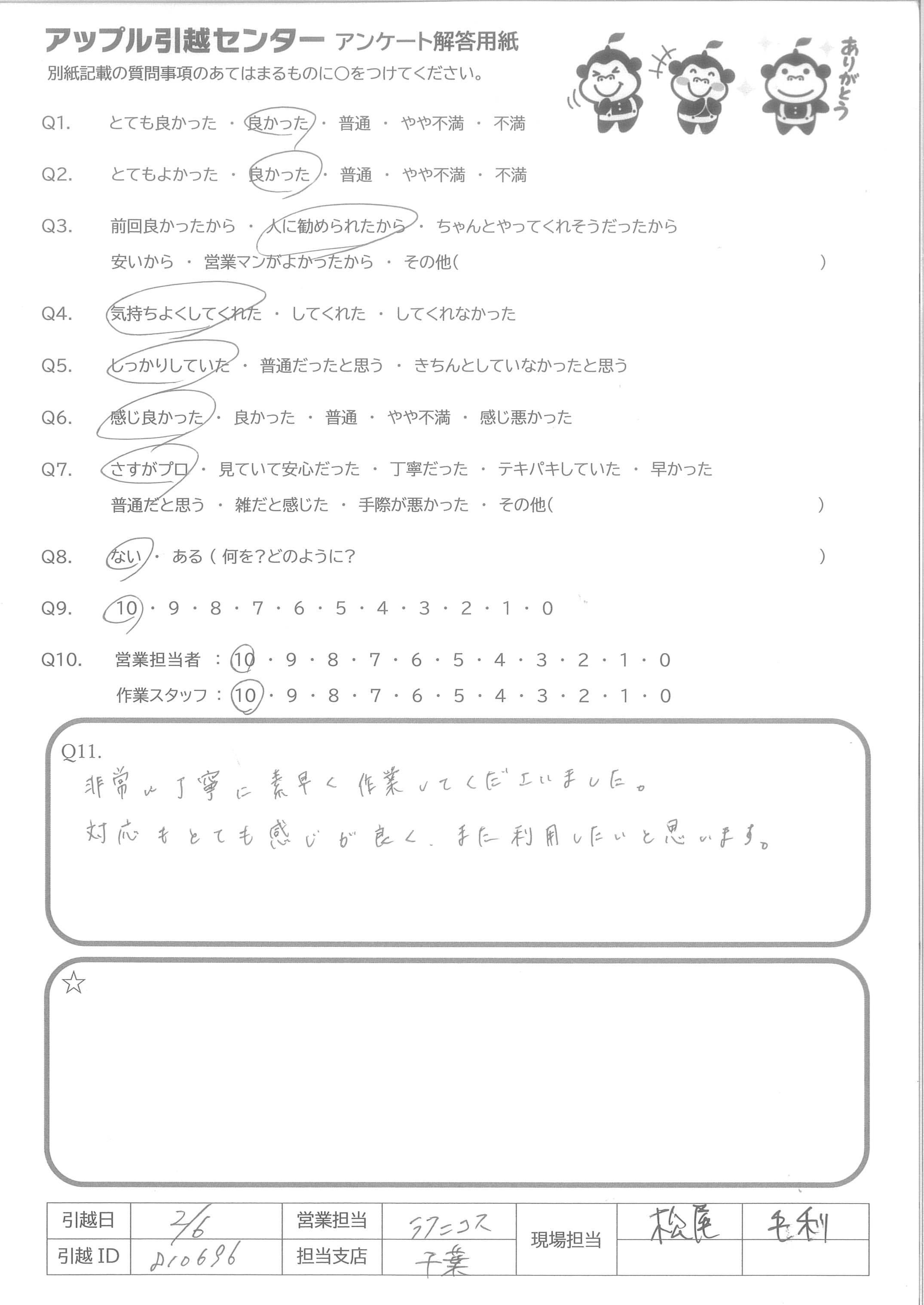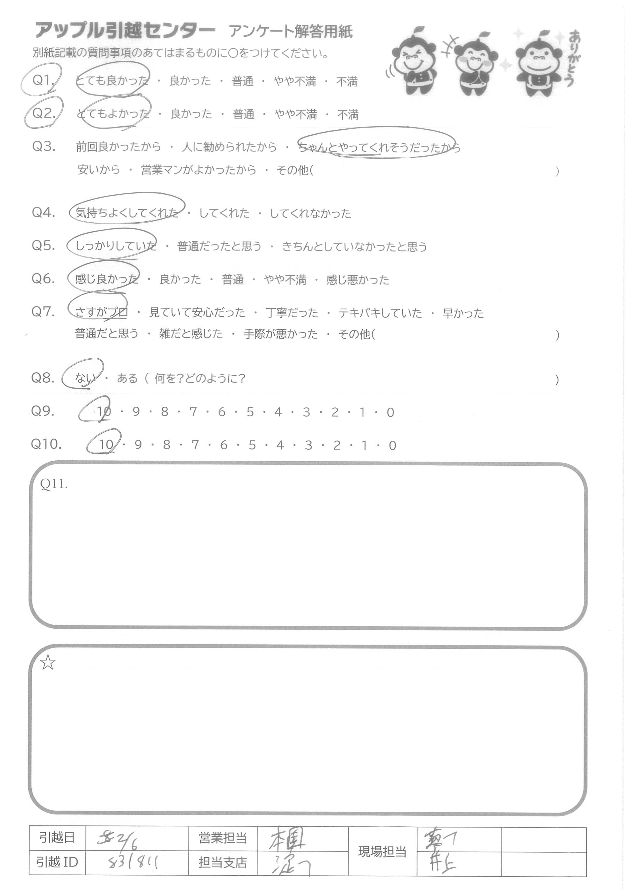 A.非常に満足しています。ご担当いただいた松田様、佐藤様にはチップを渡したいくらい素晴らしい対応をいただきました。また引っ越すことがありましたらぜひ貴社にお願いしたいです。 この度は誠にありがとうございました。