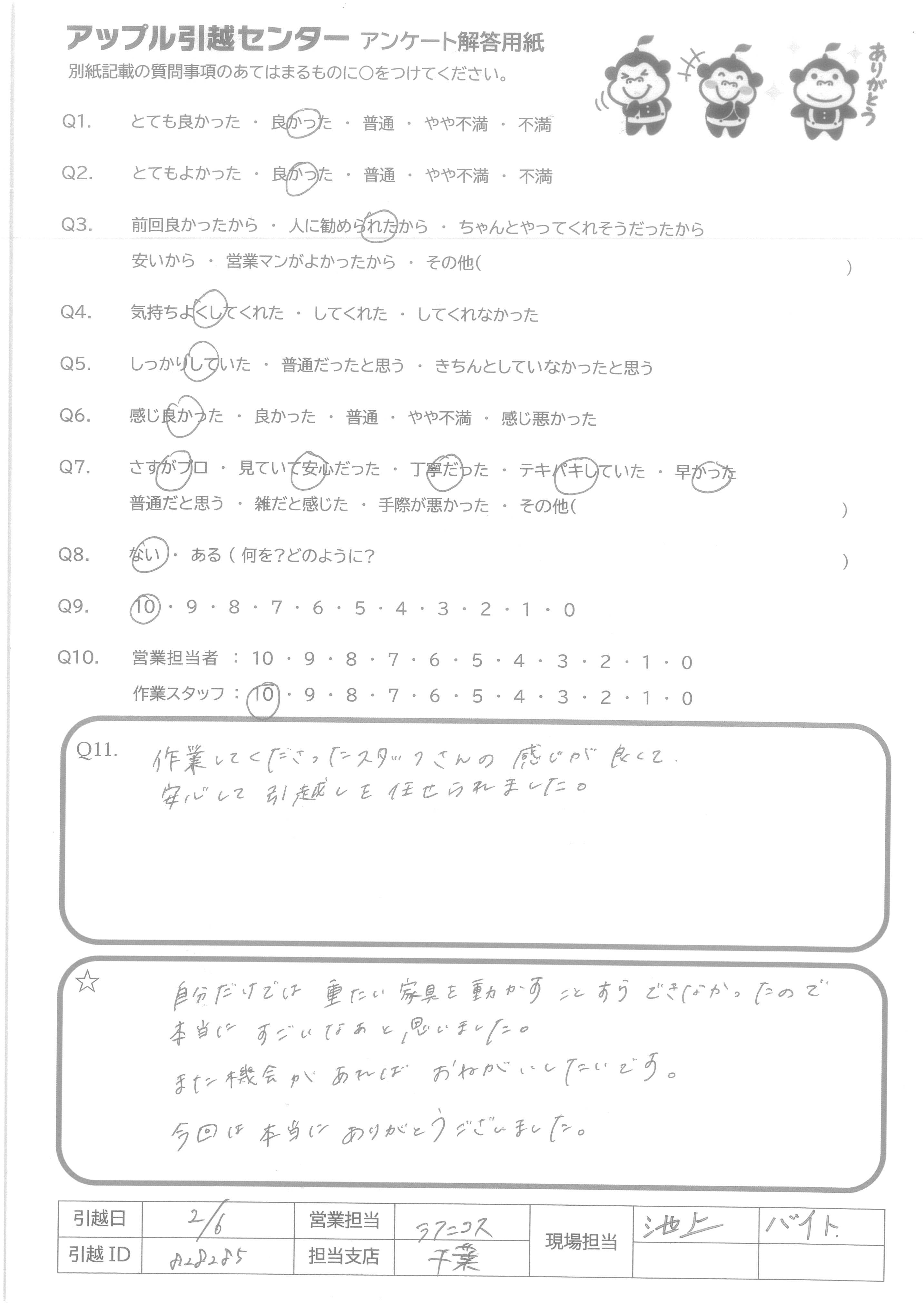 A.作業してくださったスタッフさんの感じが良くて安心して引越しを任せられました。