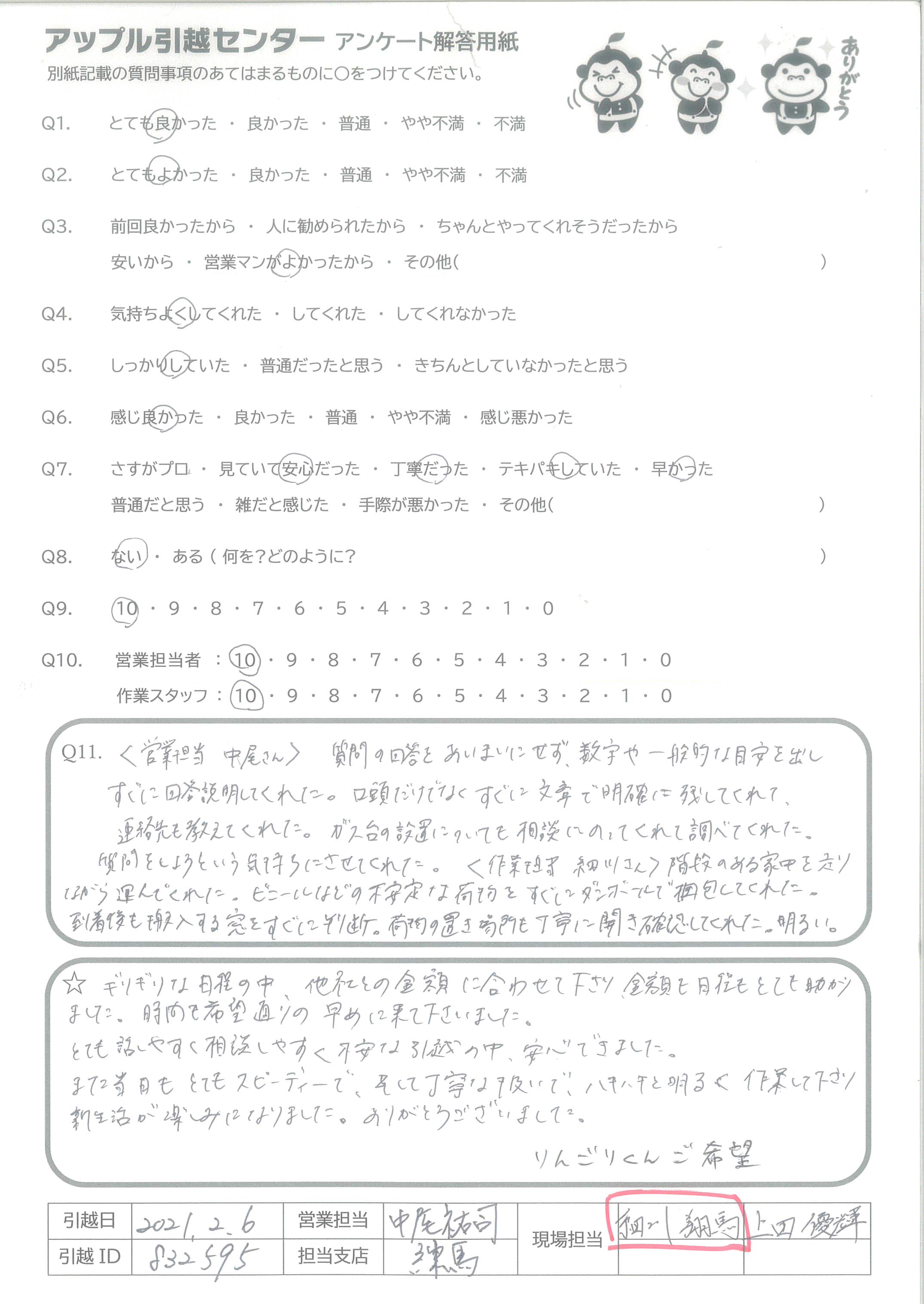 A.<営業担当 中尾さん>質問の回答をあいまいにせず、数字や一般的な目安を出しすぐに回答説明してくれた。口頭だけでなくすぐに文章で明確に残してくれて。連絡先も教えてくれた。ガス台の設置についても相談にのってくれて調べてくれた。質問をしようという気持ちにさせてくれた。<作業担当 細川さん>階段のある家中を走りながら運んでくれた。ビニールなどの不安定な荷物をすぐにダンボールで梱包してくれた。 到着後も搬入する窓をすぐに判断、荷物の置き場所も丁寧に聞き確認してくれた。明るい。