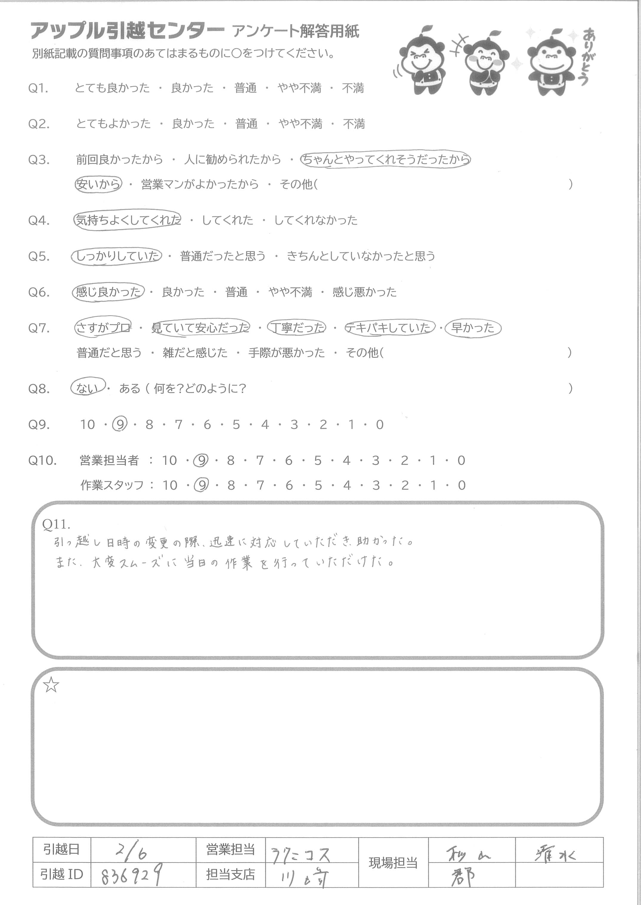 A.引っ越し日時の変更の際、迅速に対応していただき助かった。また、大変スムーズに当日の作業を行っていただけた。