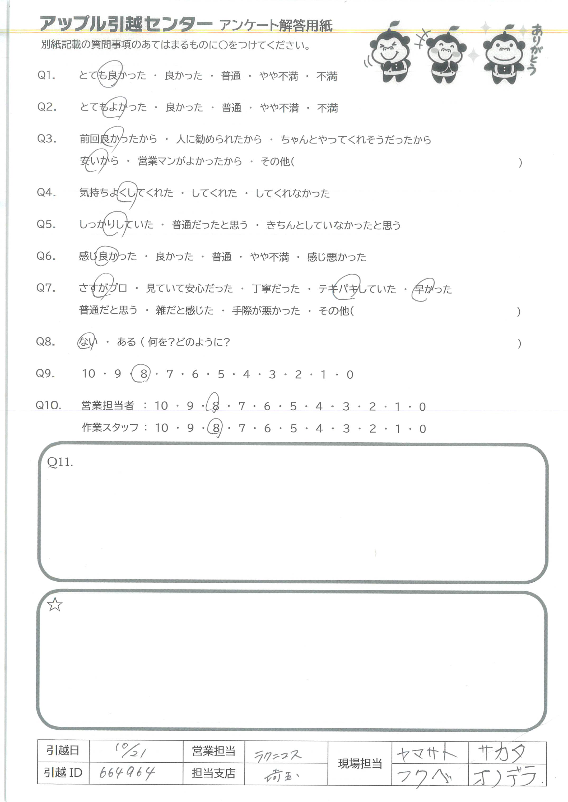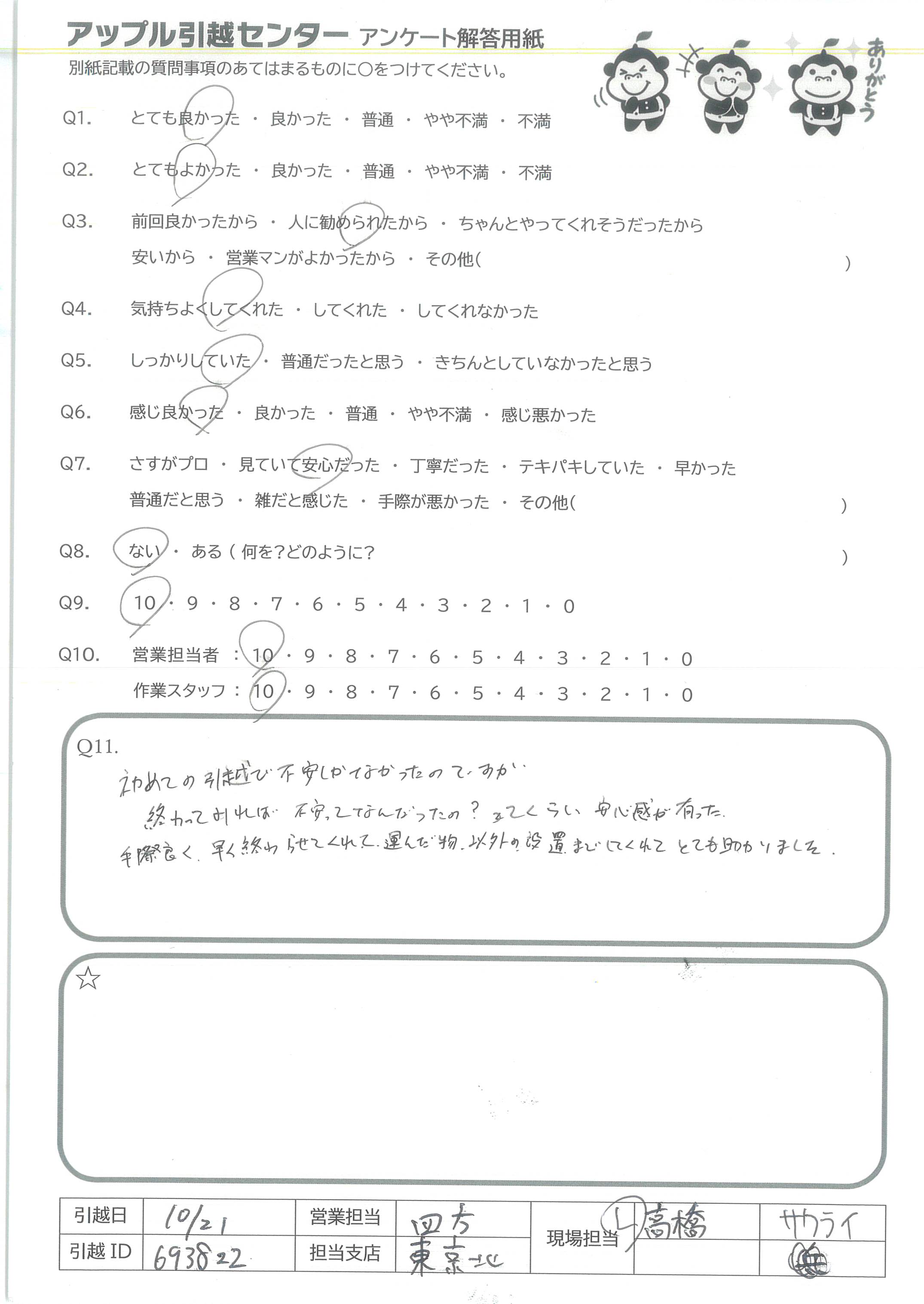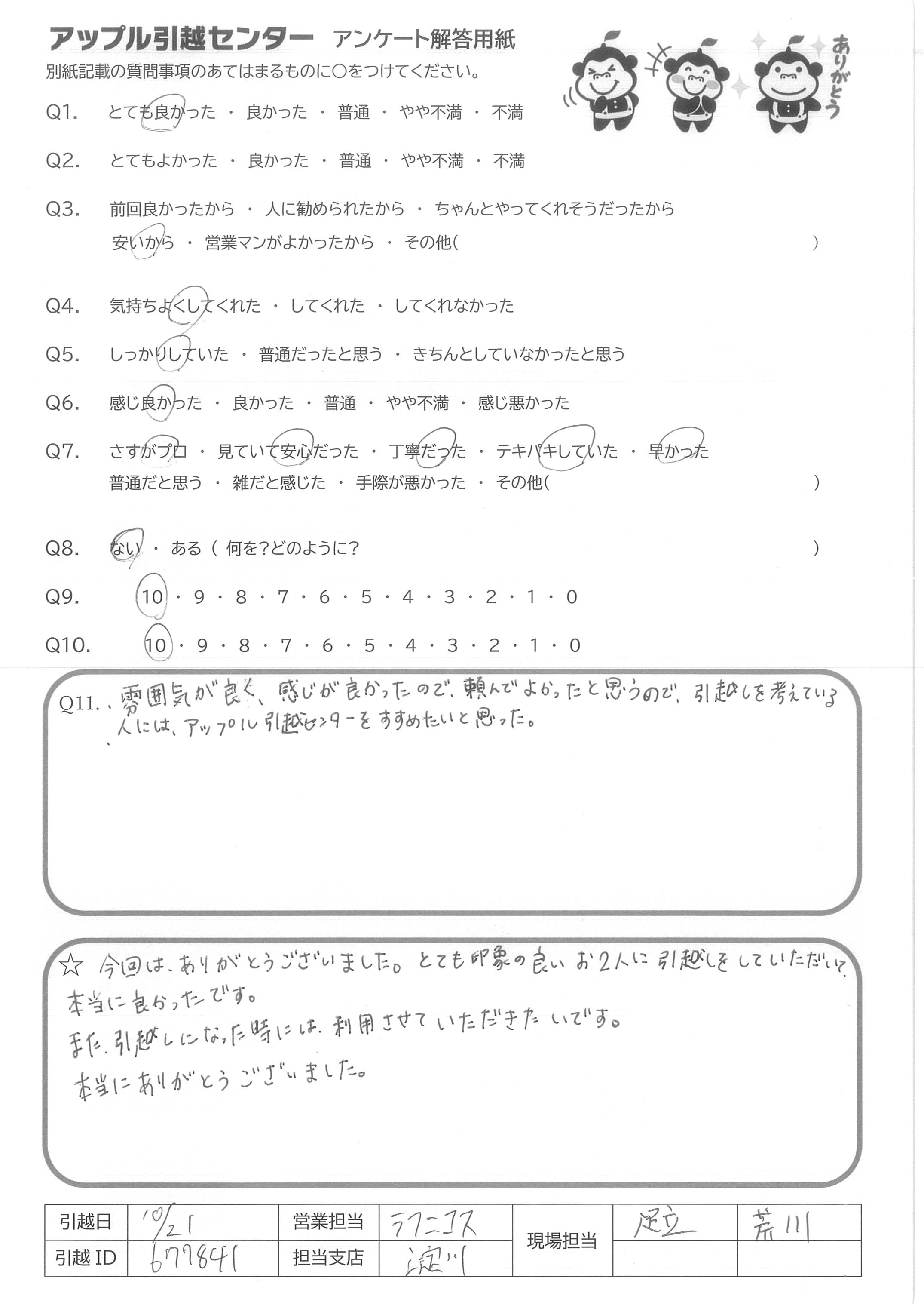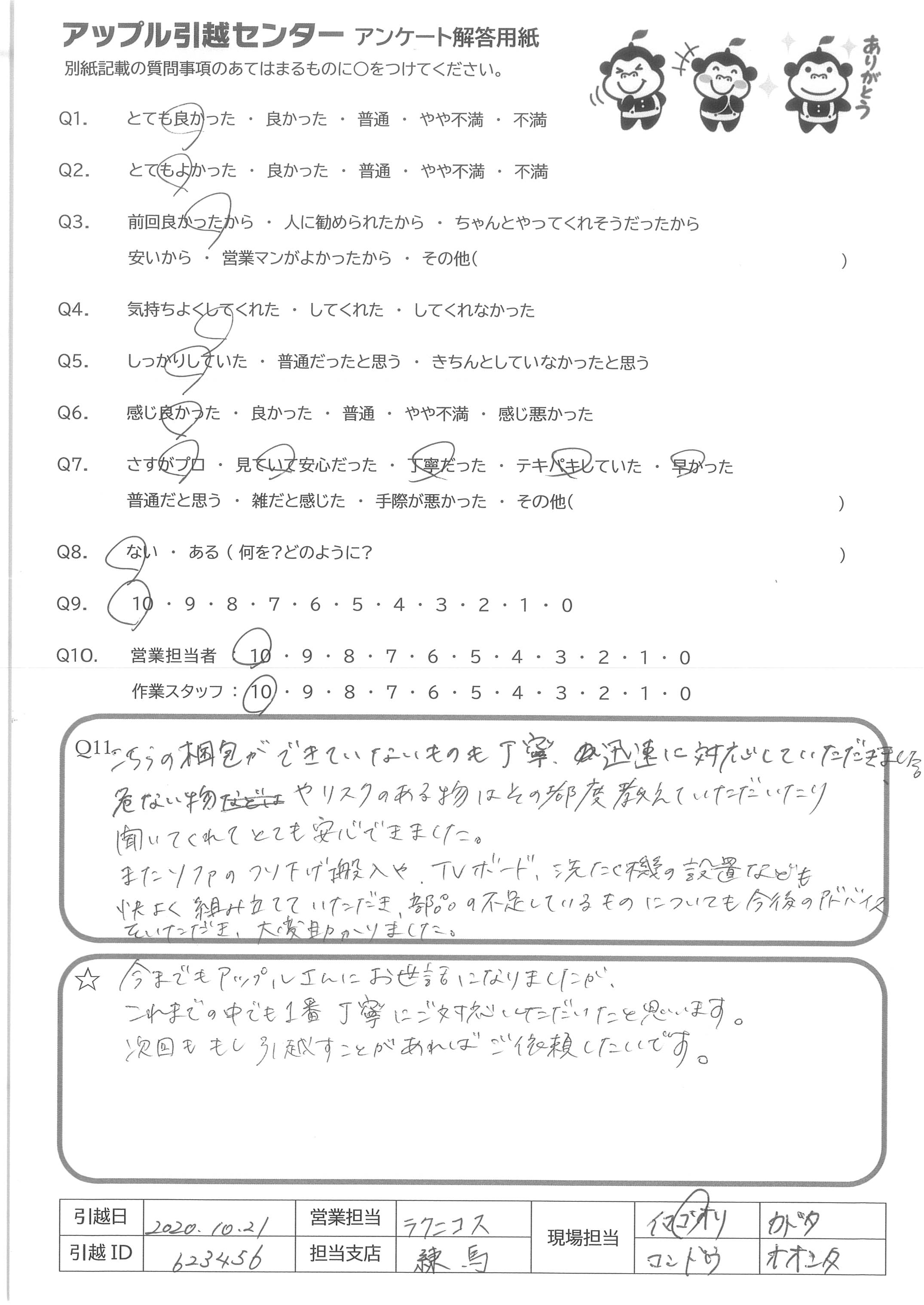 A.今までもアップルさんにお世話になりましたが、これまでの中でも1番丁寧にご対処いただけたと思います。次回ももし引越すことがあればご依頼したいです。