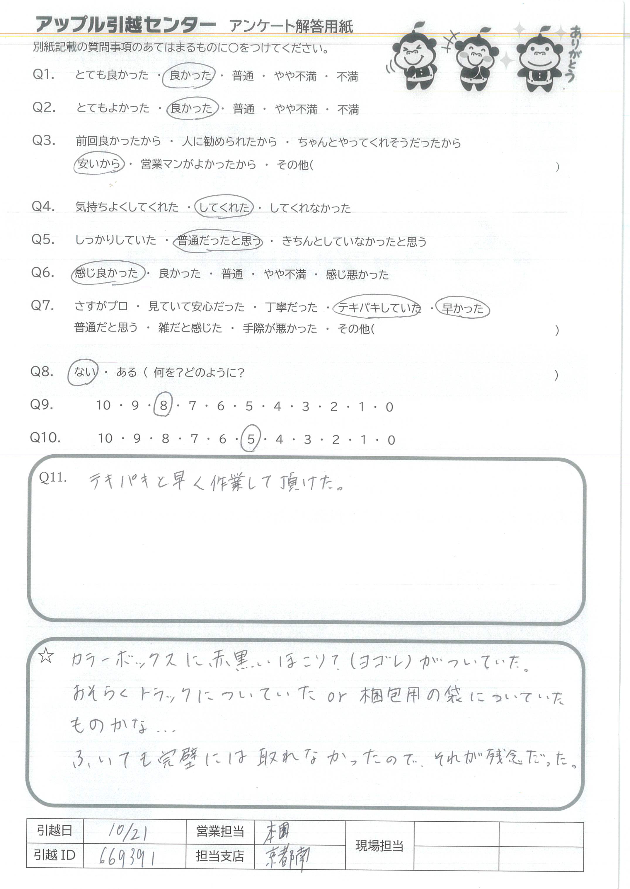 A.非常に手際が良く、スムーズに作業が進んだので、思っていたよりも早く引越が終わりました。 受け答えもハキハキしていて話しやすかったです。