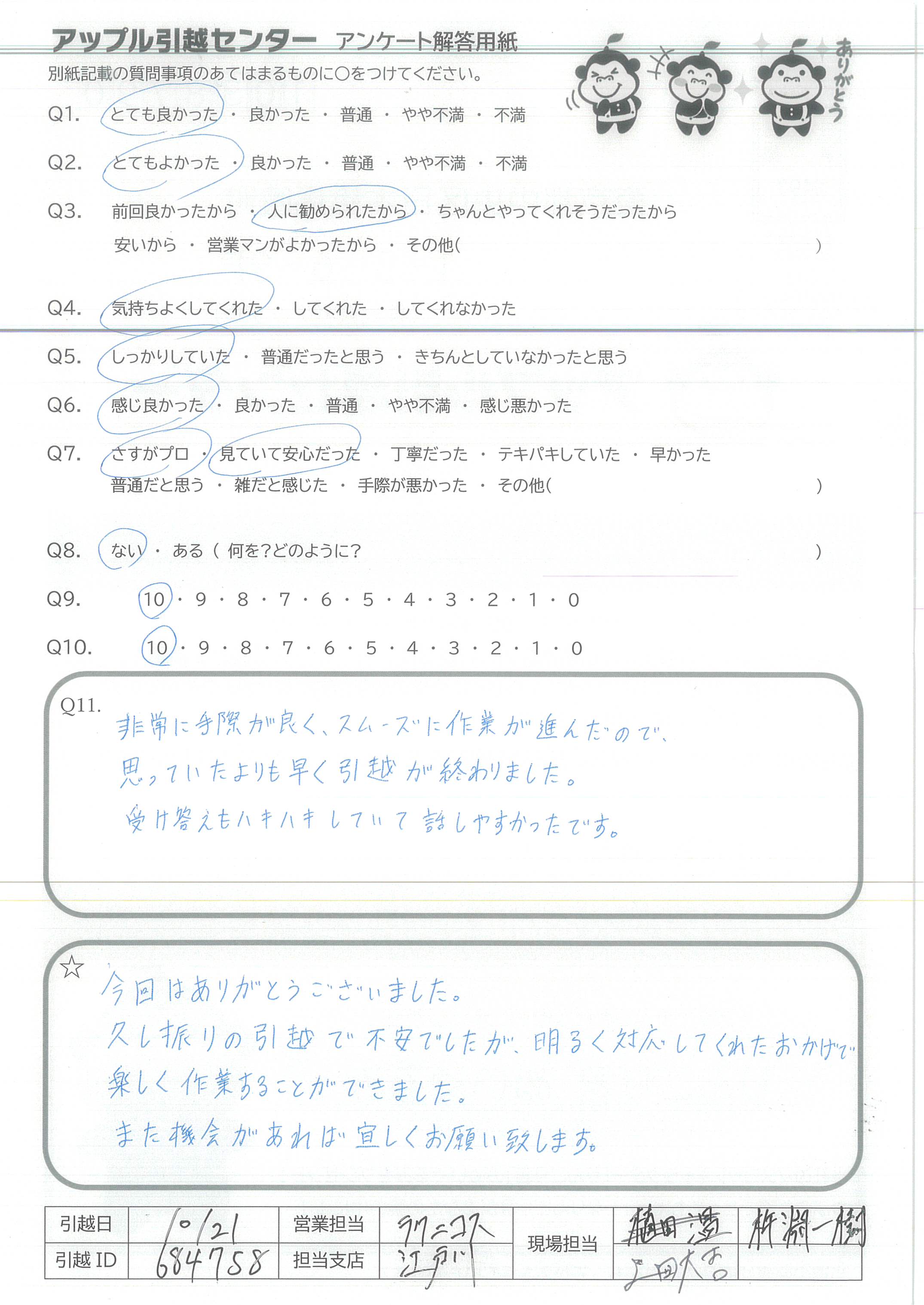 A.今回はありがとうございました。 久し振りに引越で不安でしたが、明るく対応してくれたおかげで楽しく作業することができました。 また機会があれば宜しくお願い致します。