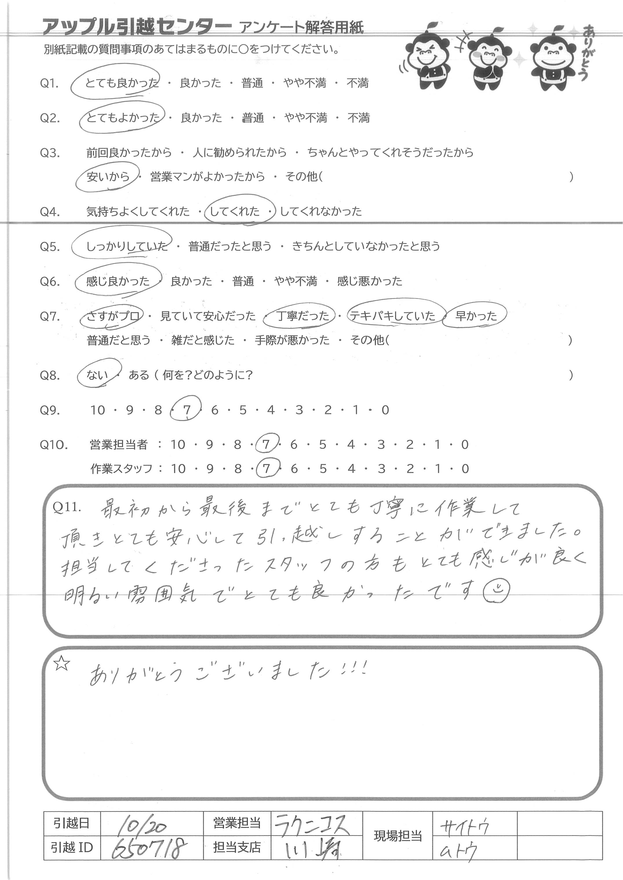 A.引越し準備からメールでいろいろな情報をもらえて、準備しやすかったです。 当日もすごくスムーズで丁寧な対応で、アップル引越センターにしてよかったなと思ったため。