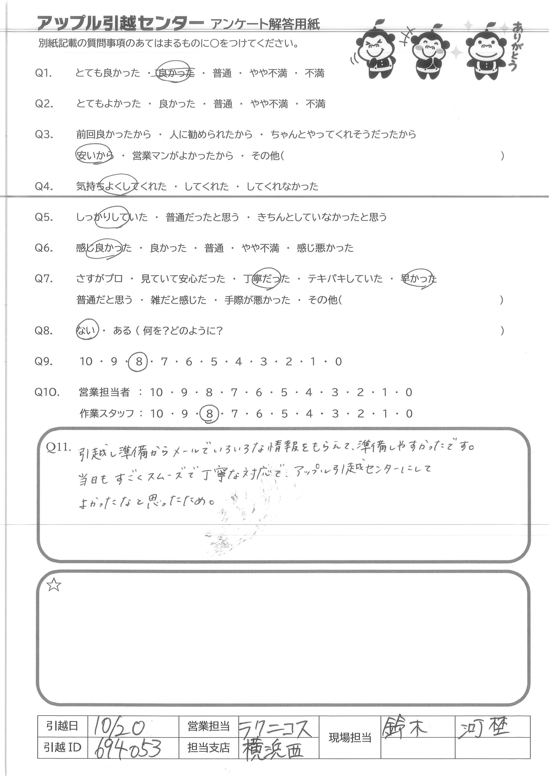 引越し日:2020年10月20日 エリア:神奈川県横浜市港北区