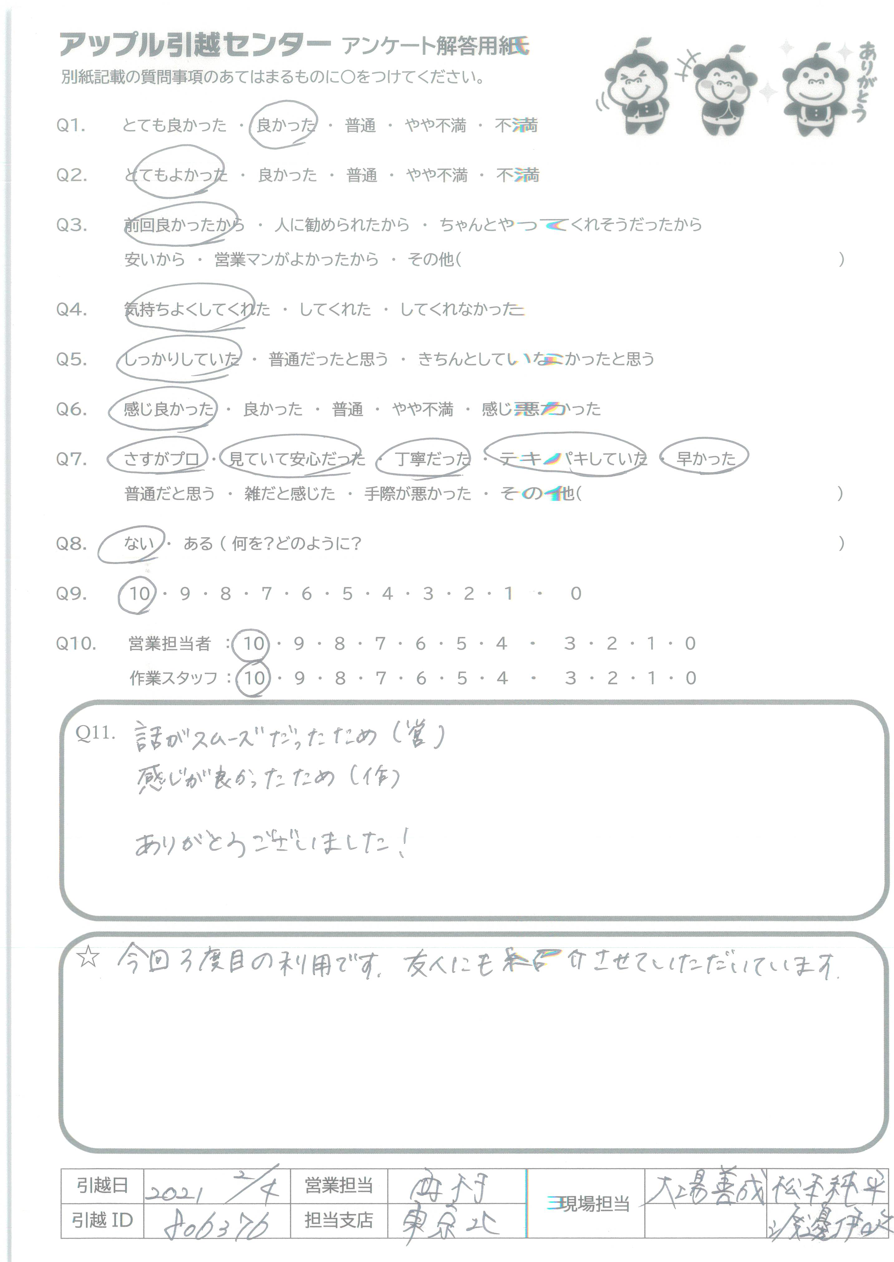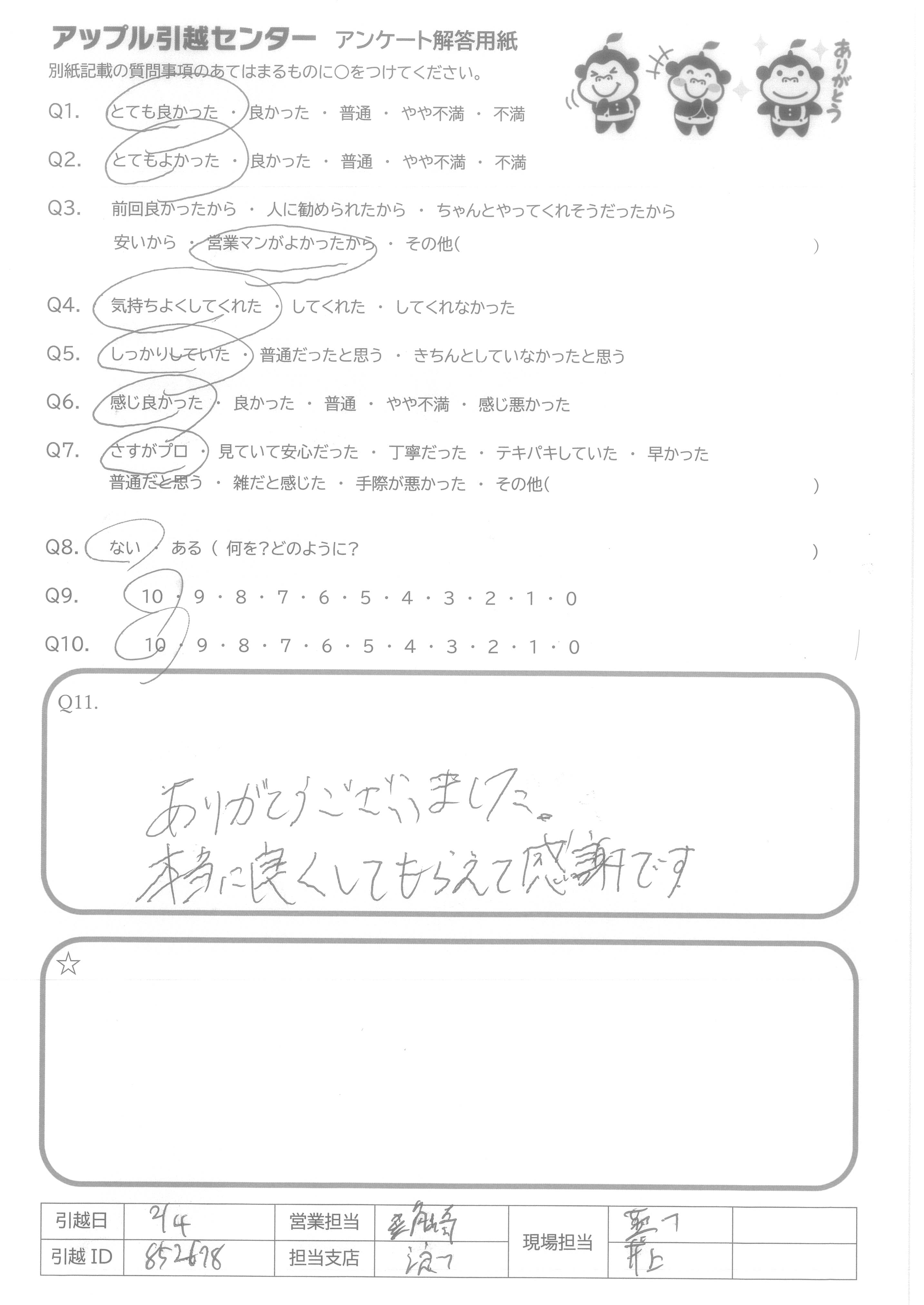 A.・エクセレント!! ・手際がとてもよかった!(作業の人たち)営業の方も感じがよかった ・みんなとても親切にできもちよく作業してくれた。 ・チームワークがとても良いと感じた ・お世話になりました!!ありがとう!