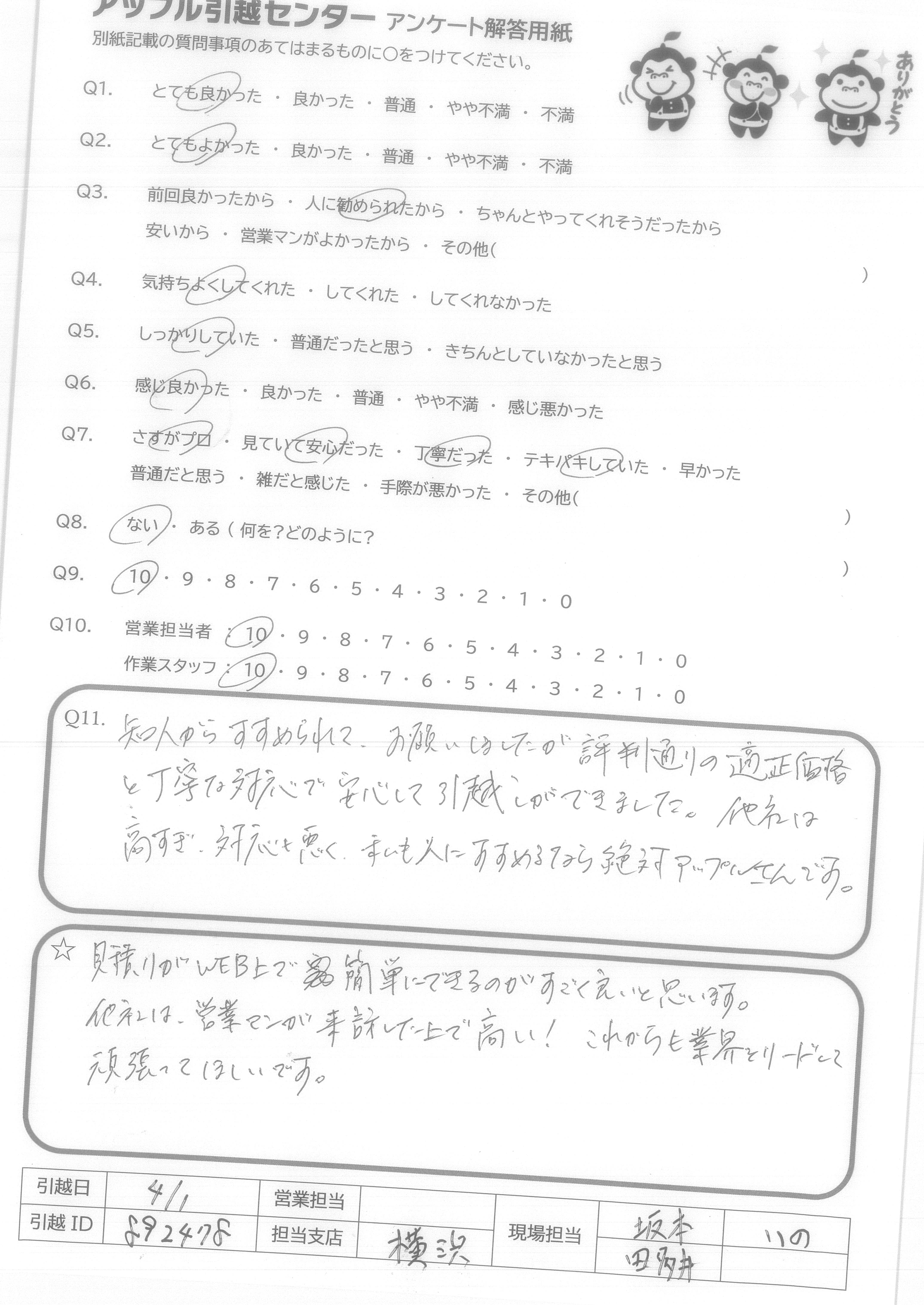 A.インターネットだけで見積もりができるのは、とても便利です。営業マンの方も、親身になって、こちらの状況を聞いてくださいました。荷物の増加などの理由で、度々電話しましたが、すぐに電話はつながり、こちらの不安や要望に、素早くかつ適切に対応してくださいました。作業スタッフの応対も丁寧で、申し分ありません。