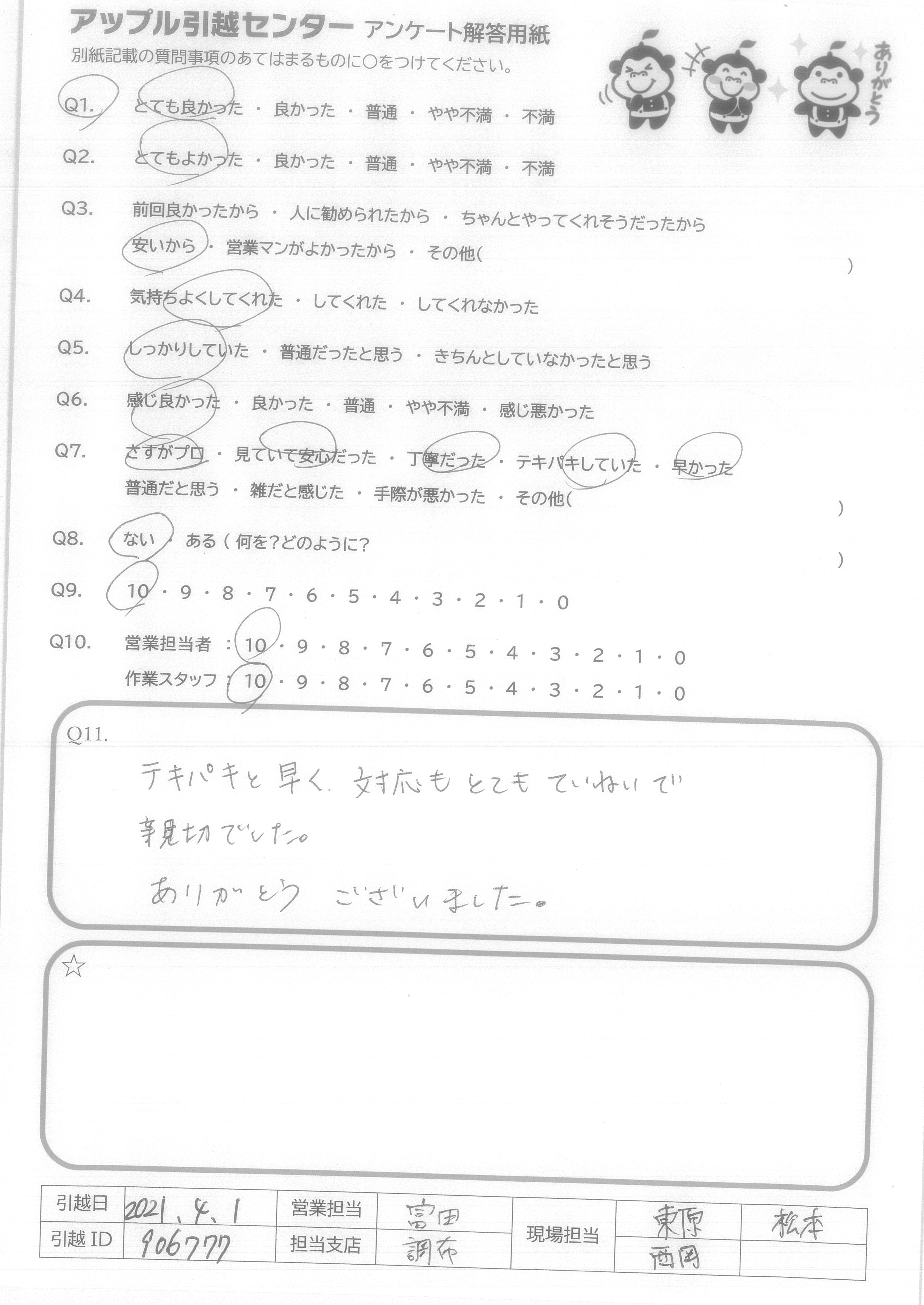 A.テキパキと早く、対応もとてもていねいで親切でした。 ありがとうございました。