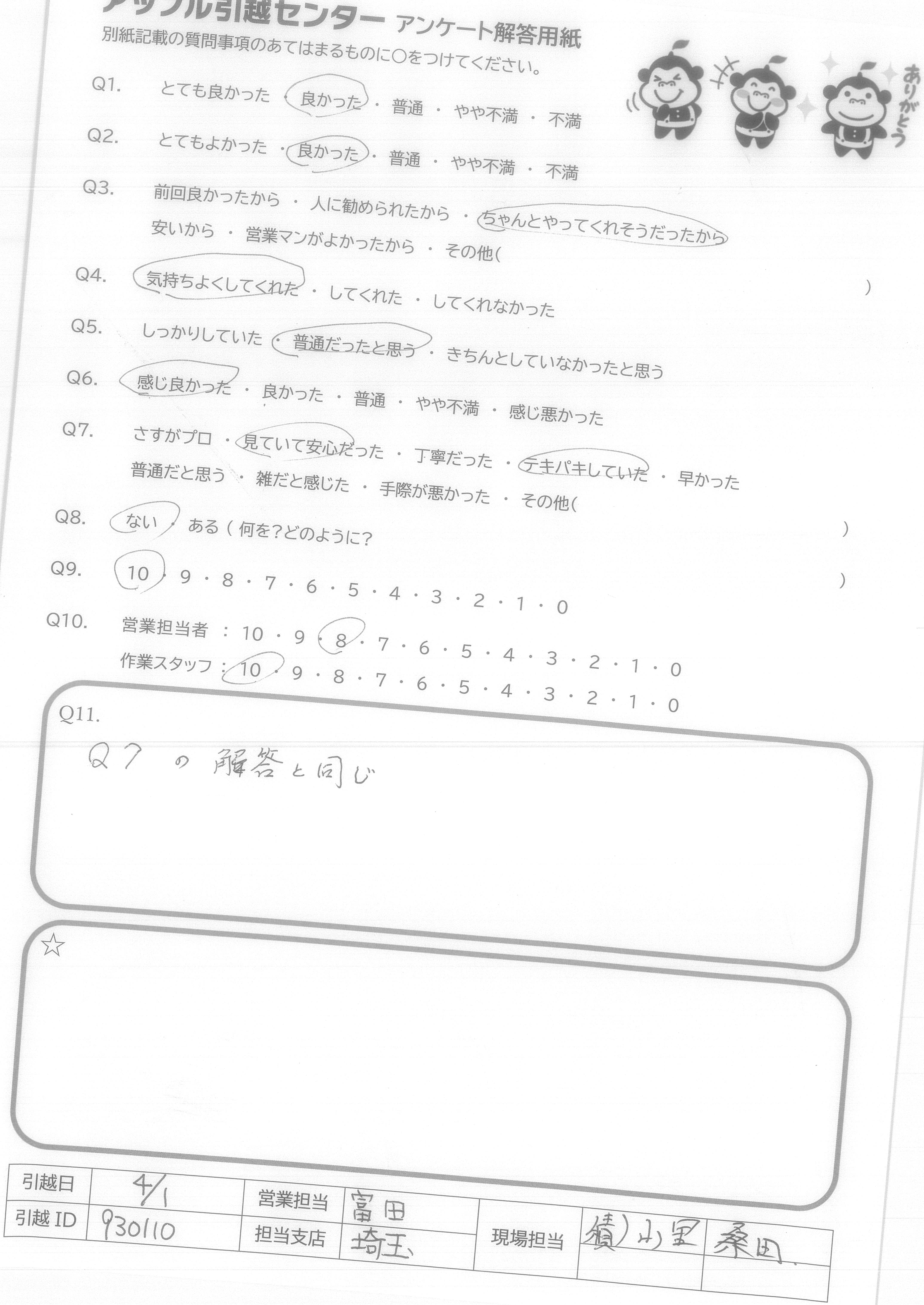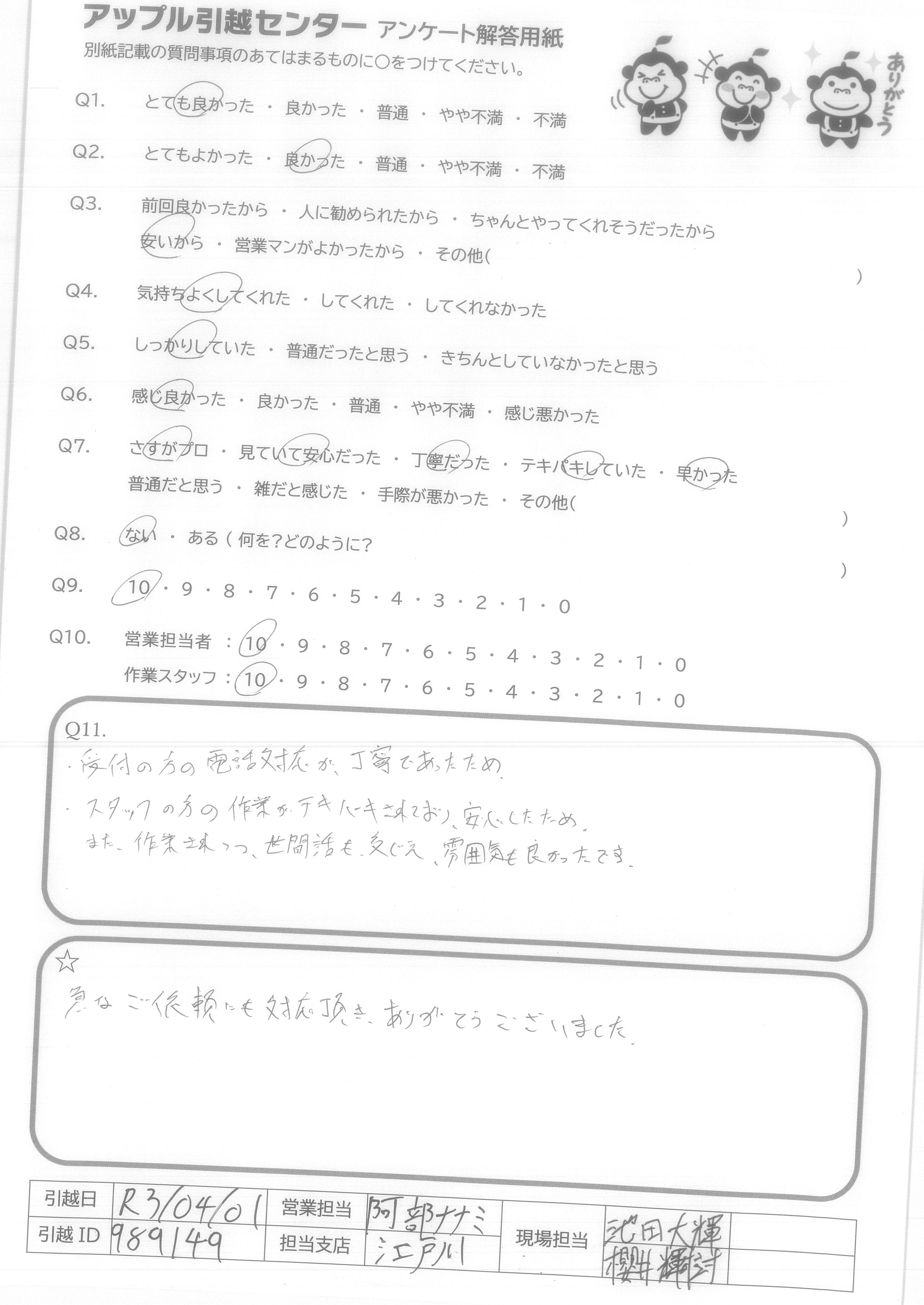 A.9:日程の調整がしやすく、電話対応してくれた方も作業スタッフの方も丁寧に対応してくれたからです。 10:営 少し話がかみ合わなかったと感じたため、(対応はとても丁寧でした) 作 お2人とも丁寧に作業していたため。