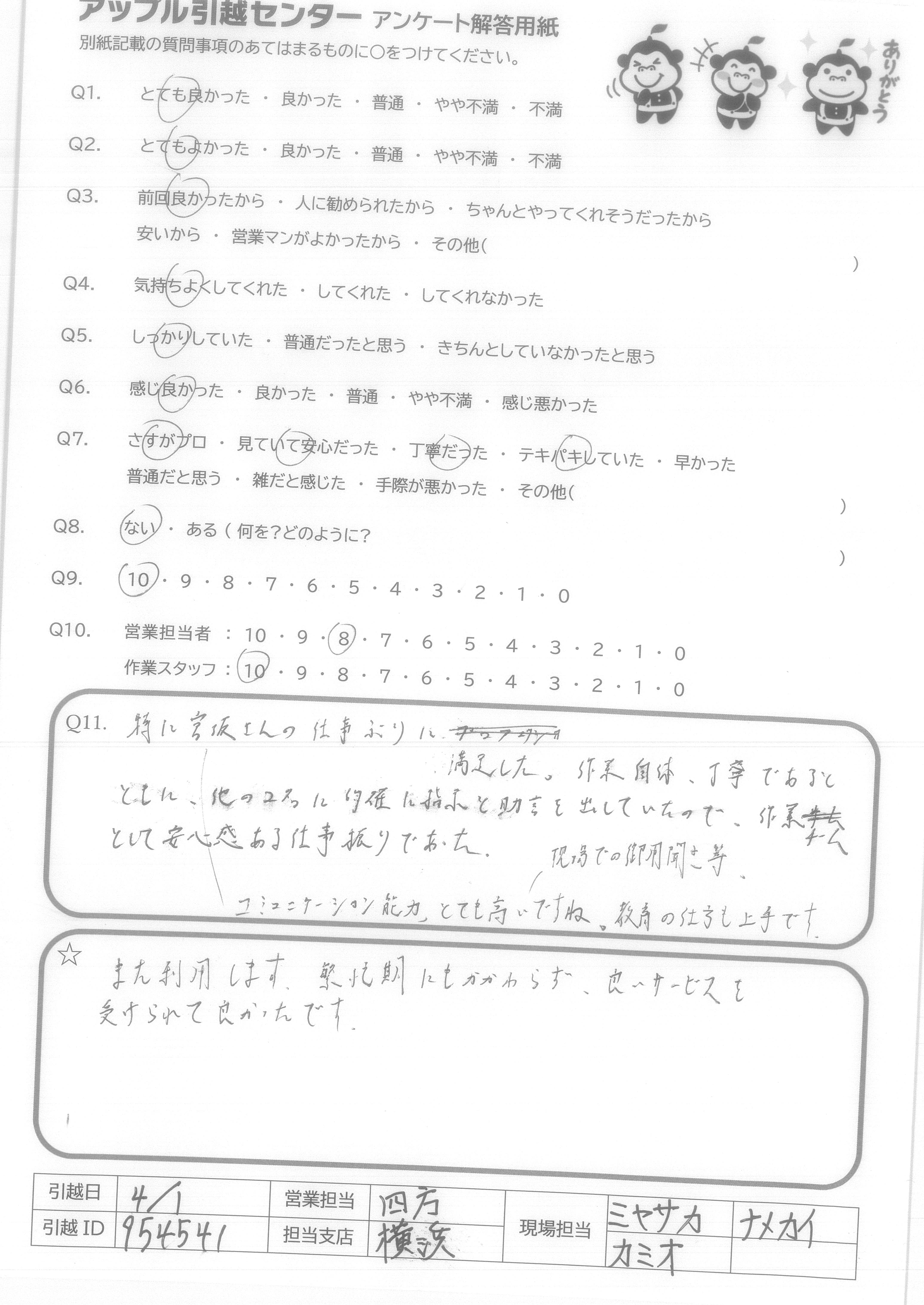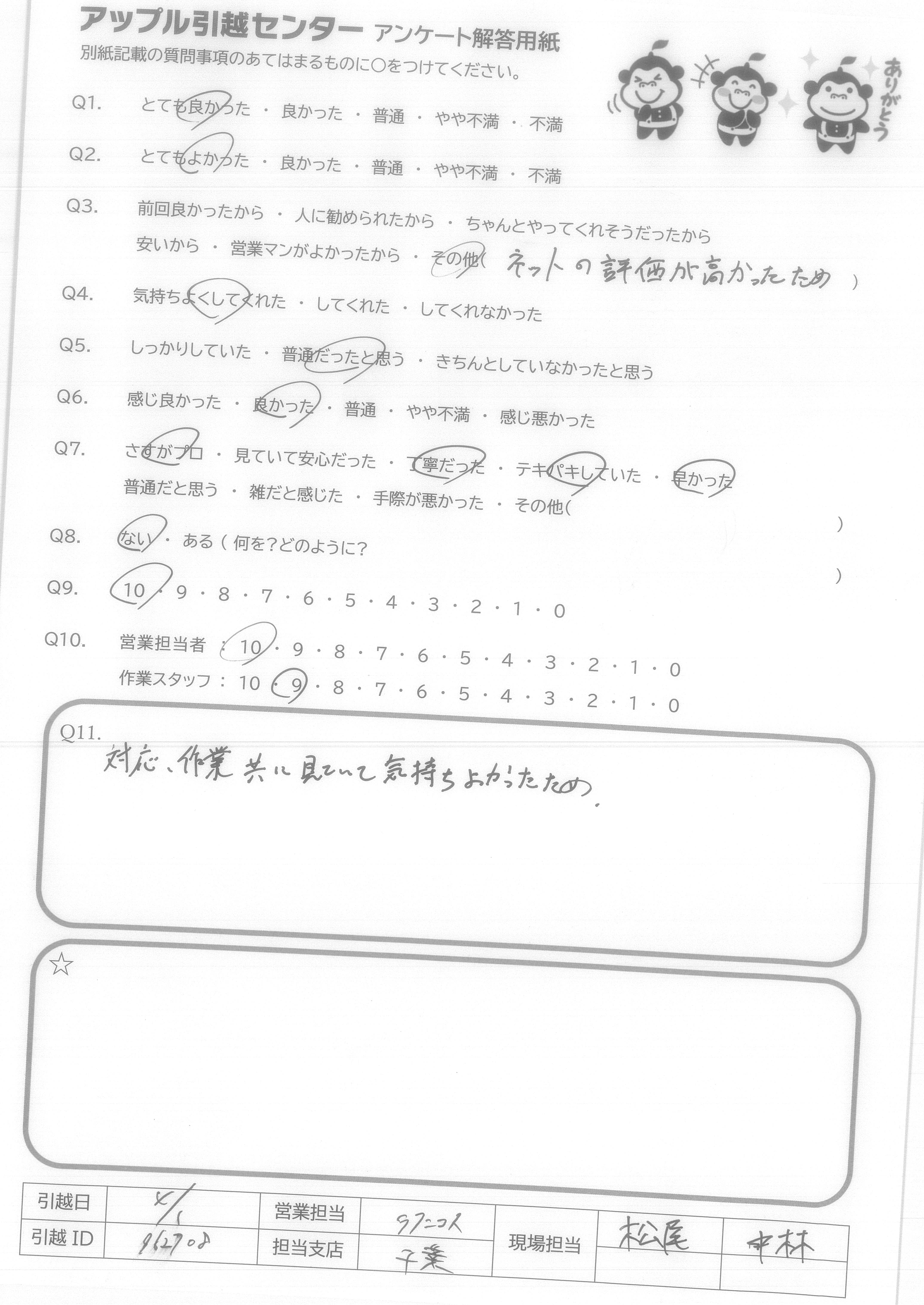 A.知人からすすめられて、お願いしましたが、評判通りの適正価格と丁寧な対応で安心して引越しができました。他社は高すぎ、対応も悪く、私も人にすすめるなら絶対アップルさんです。