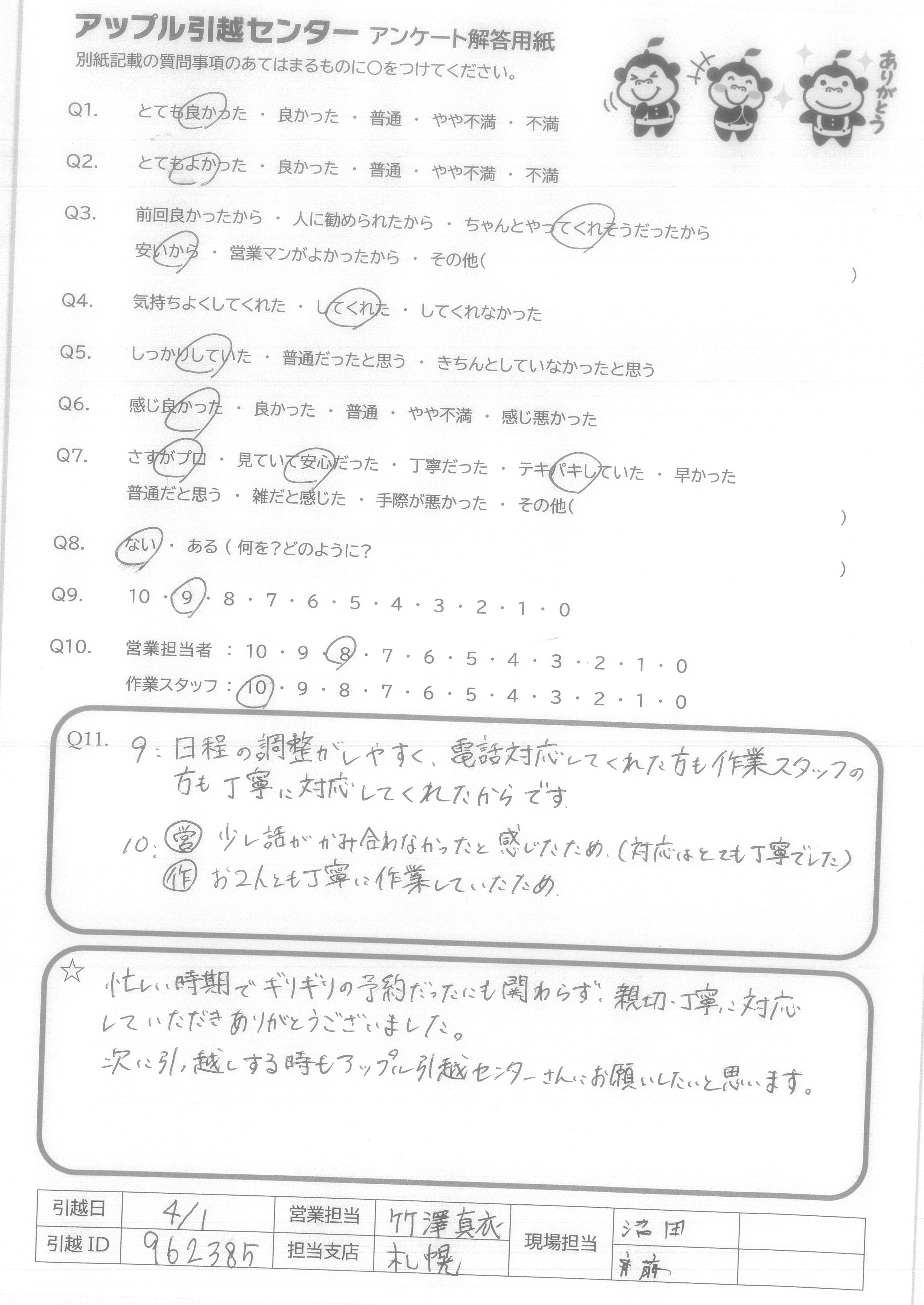 A.忙しい時期でギリギリの予約だったにも関わらず、親切・丁寧に対応していただきありがとうございました。 次に引っ越しする時もアップル引越センターさんにお願いしたいと思います。