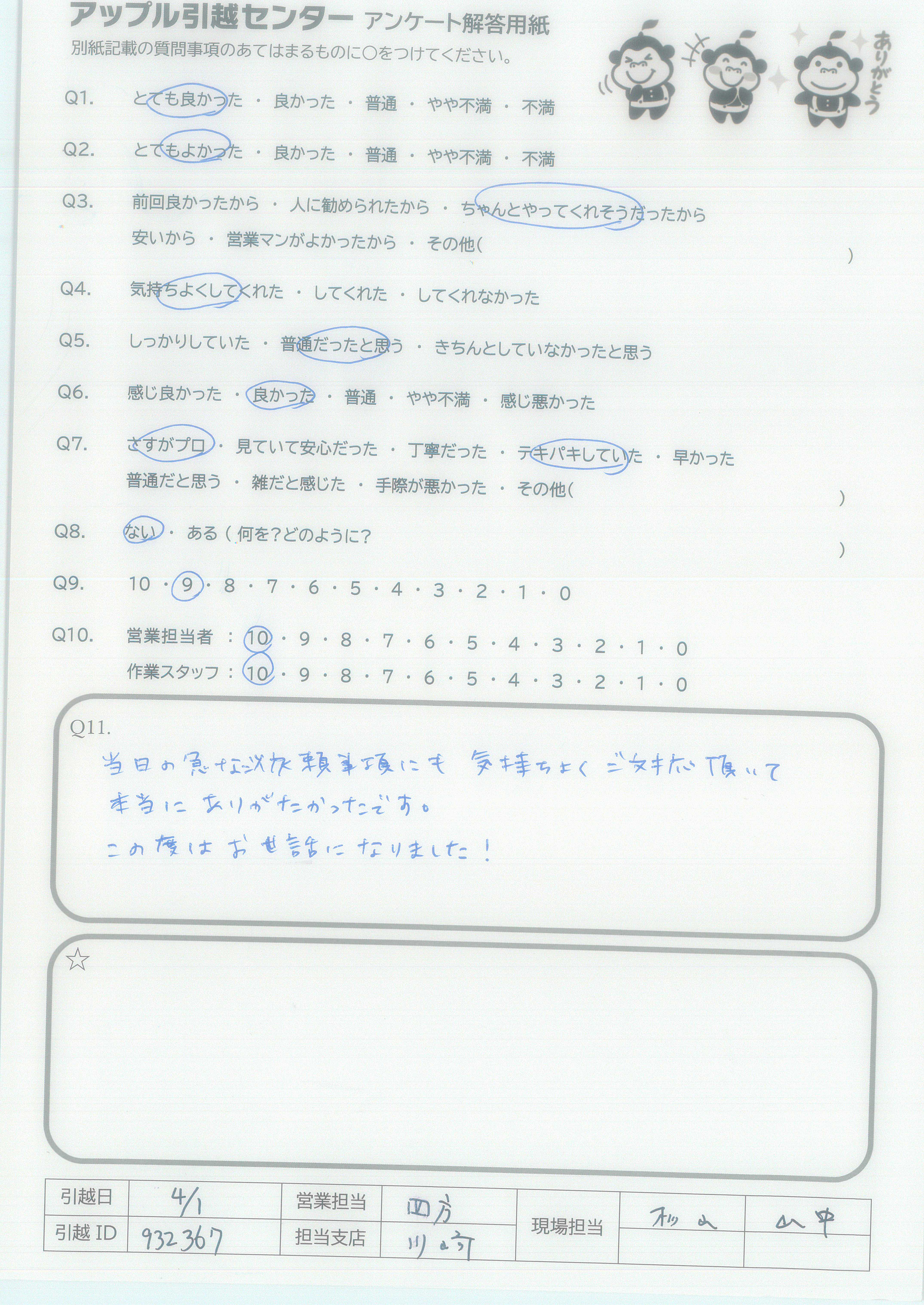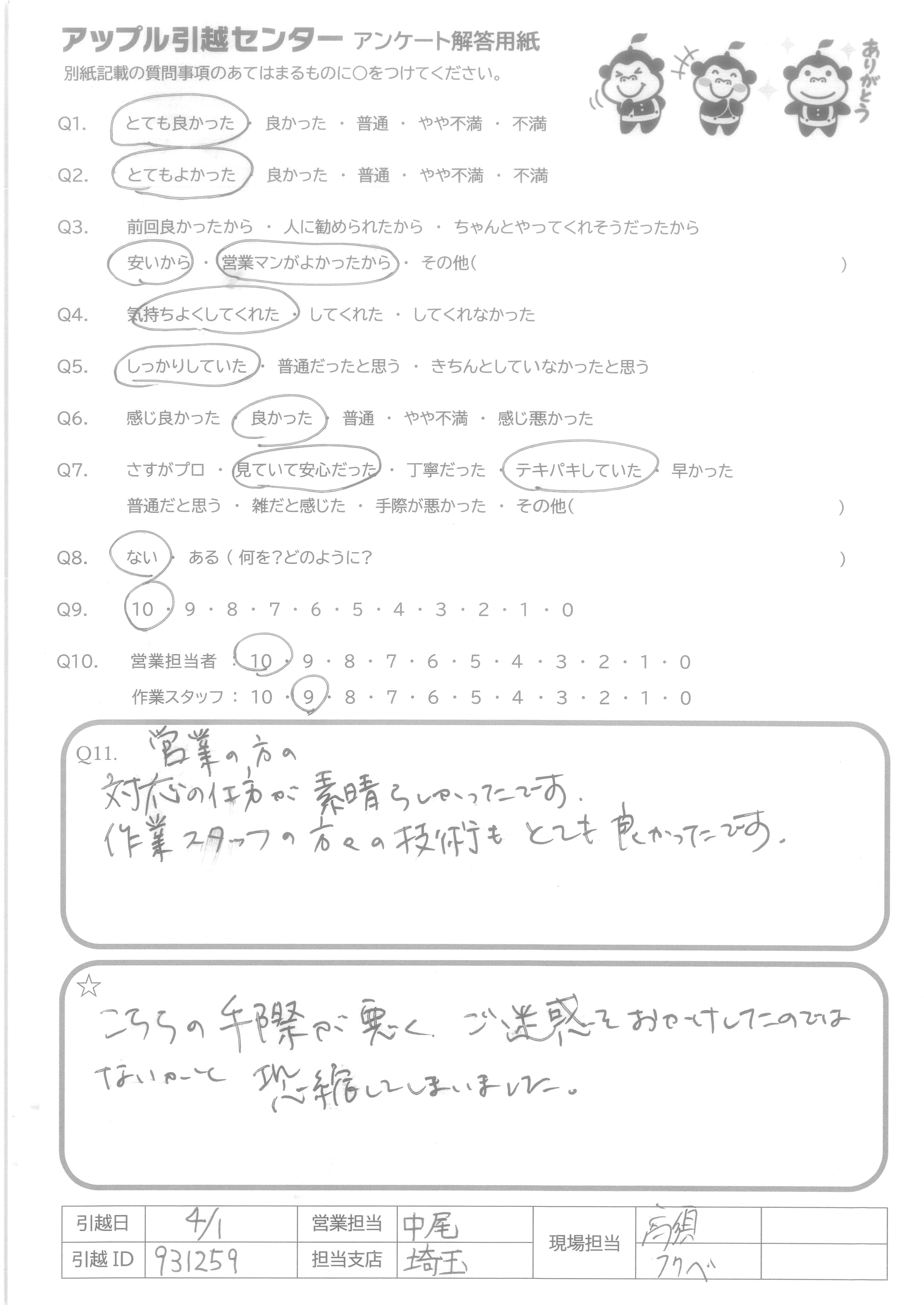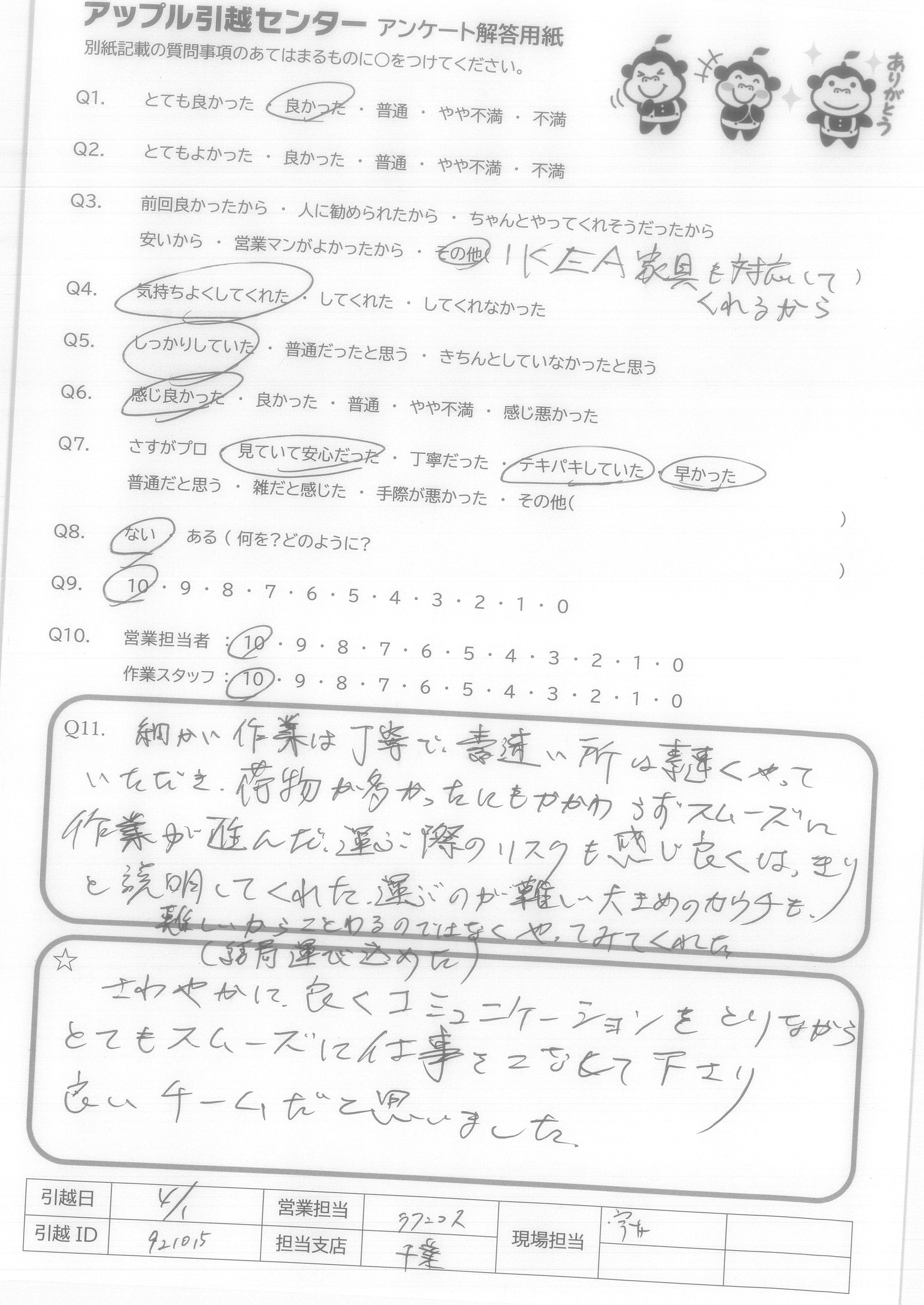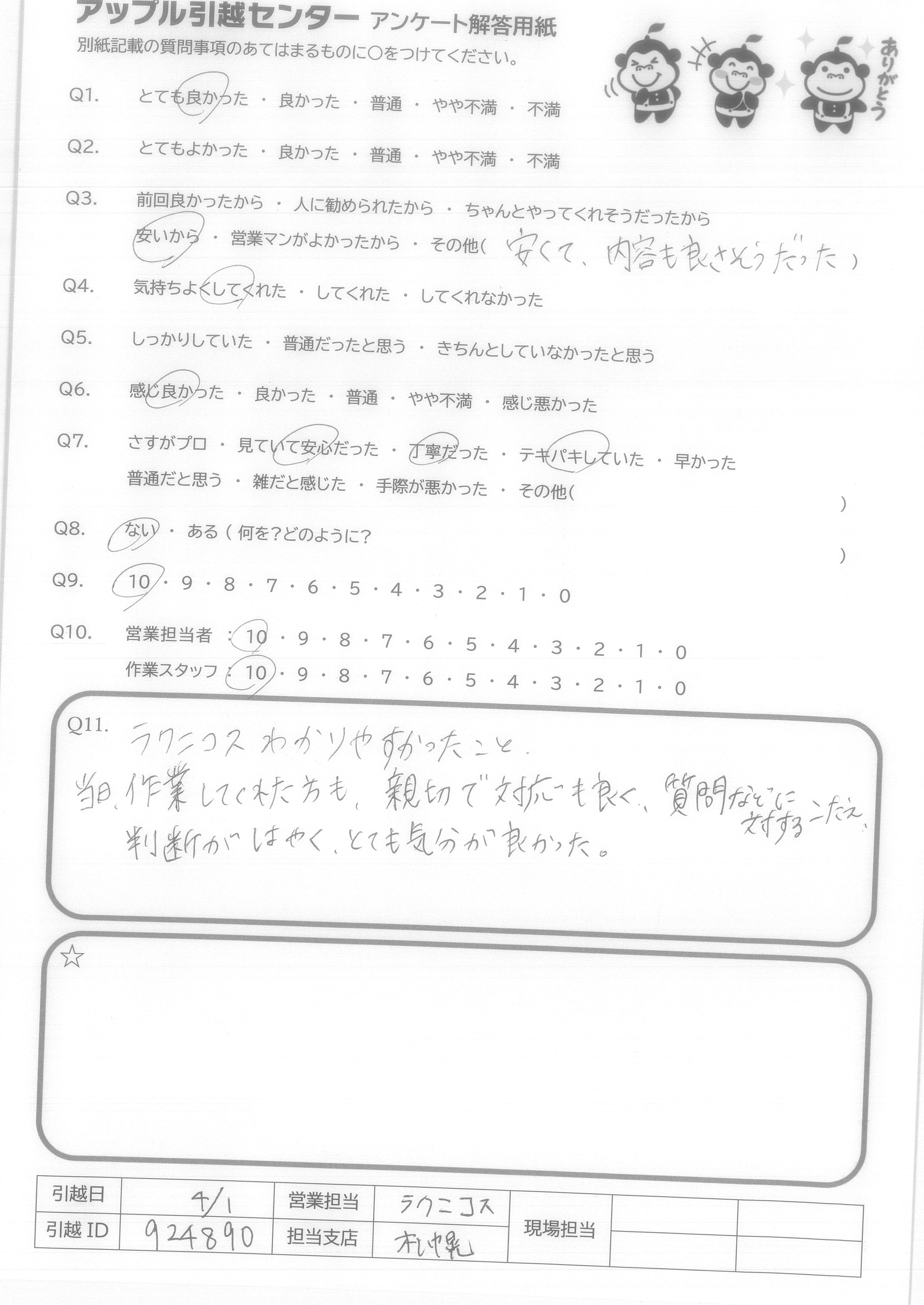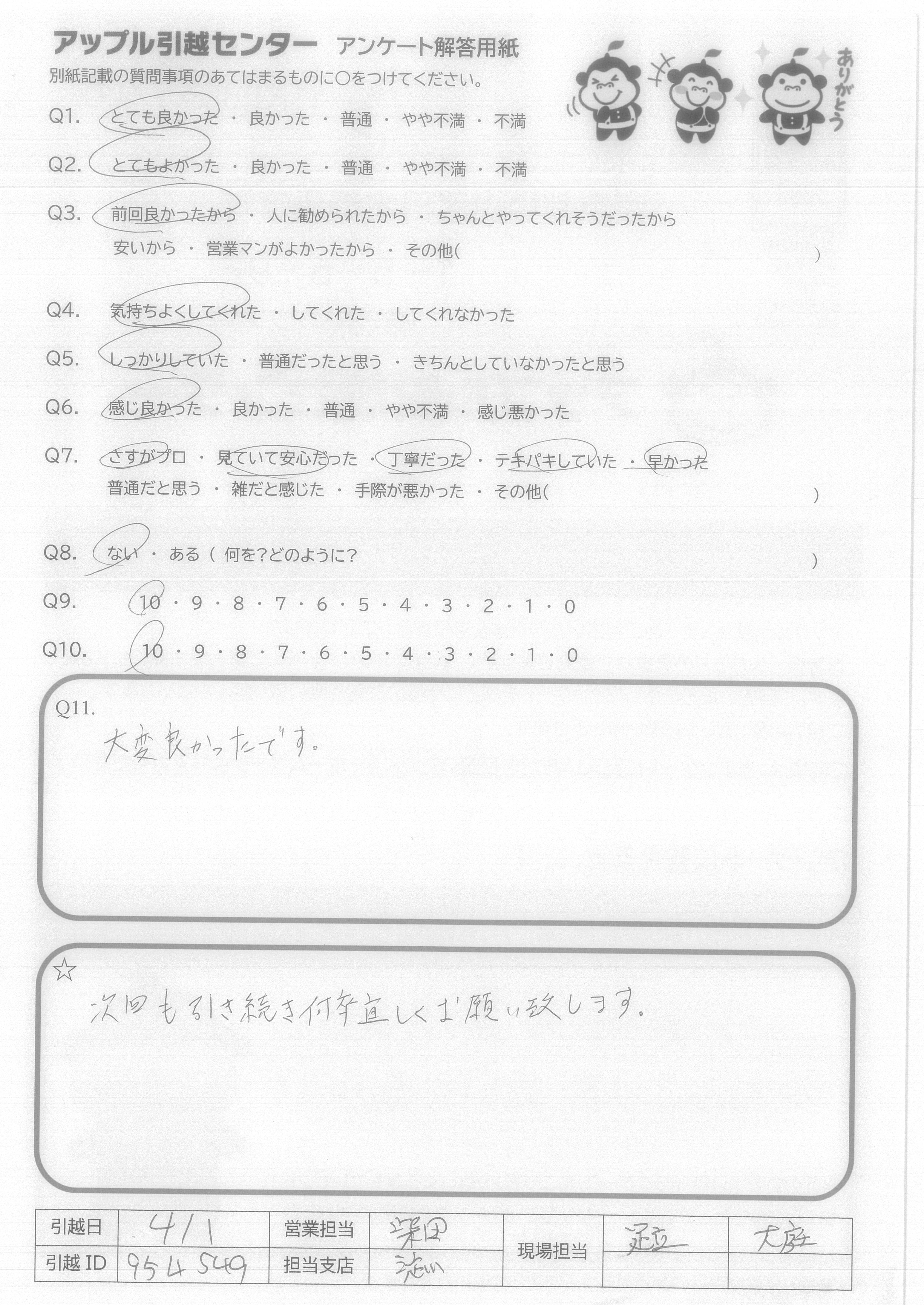A.電話受付の亀水さん 対応の迅速さと真心感じる頼りになる確実な返答は安心感100点でした 段ボール引き取りの手配などアフターケアもお世話になり ありがとうございました。 現場のスタッフさん 三人共に元気でニコやかテキパキと運んで下さり人生の新しい出発の引越しには有難い方々でした 大久保さんの作業の指示もテキパキ! 大久保さんと山田さんが斉藤さんに優しく指導されていて斉藤さんもしっかり聞いてらして見ていて好感が待てました 御社の良い雰囲気が伝わって来ました 段ボールを引き取りに来てくださった方々も本当に感じの良い方々でした ありがとうございました
