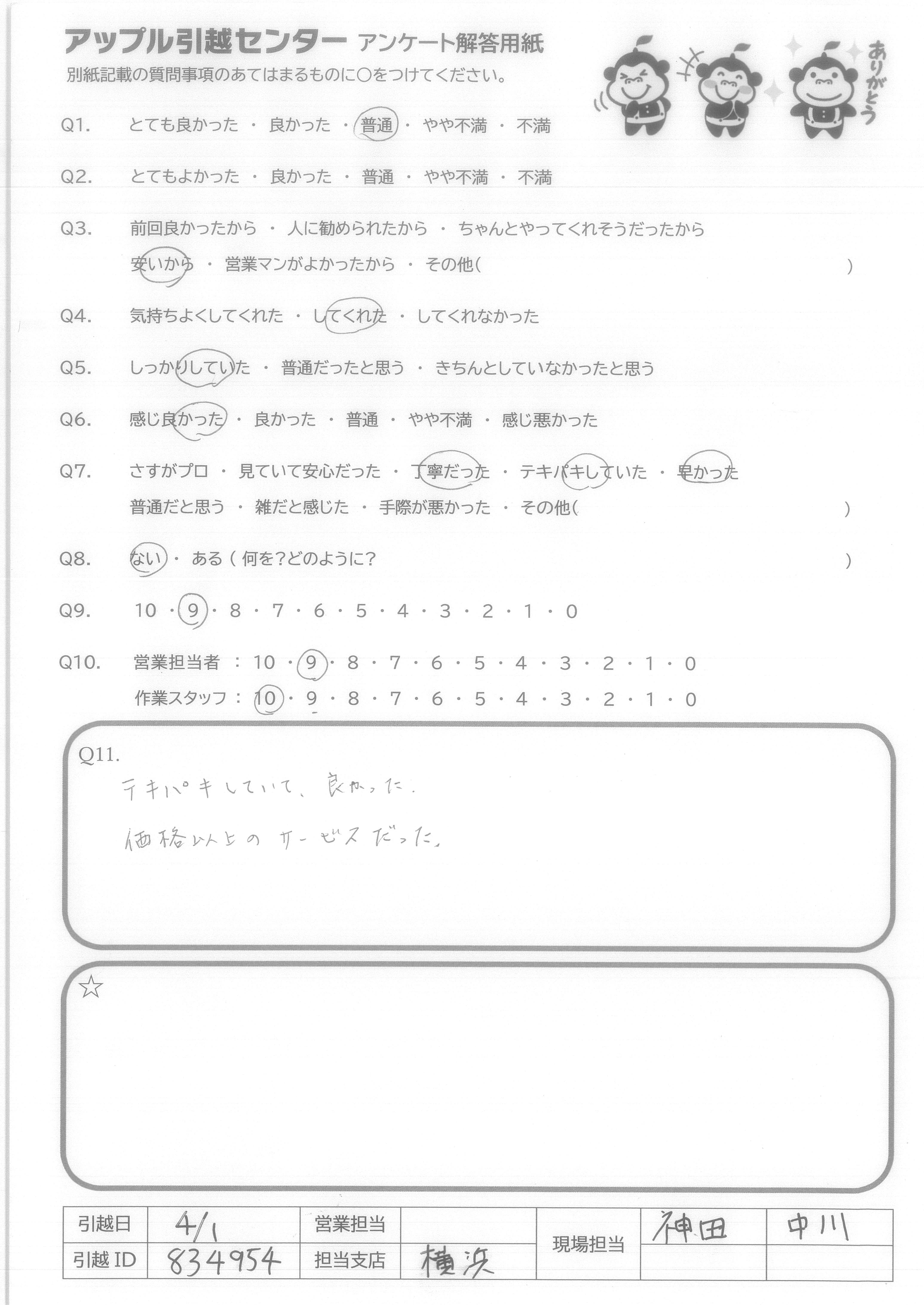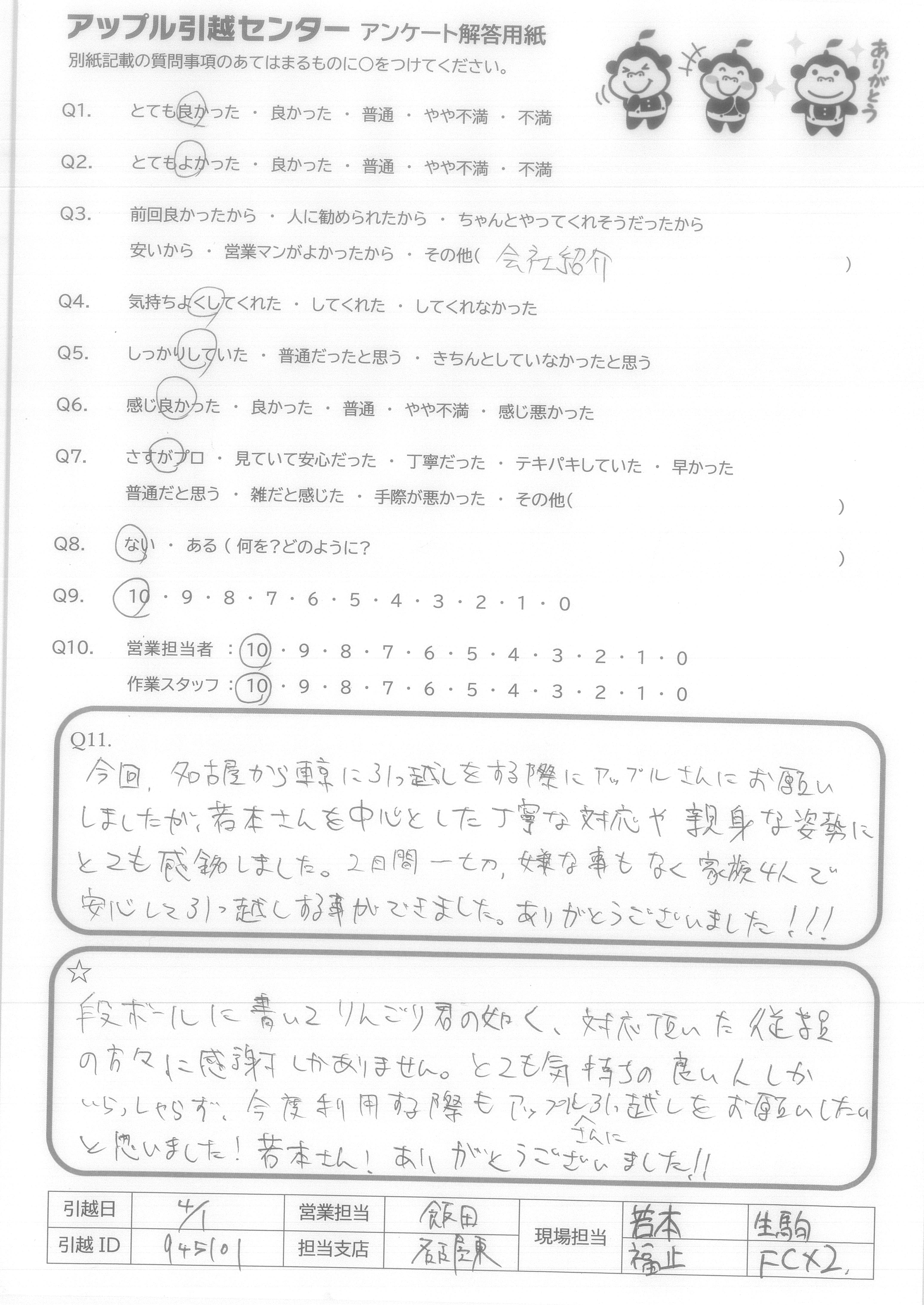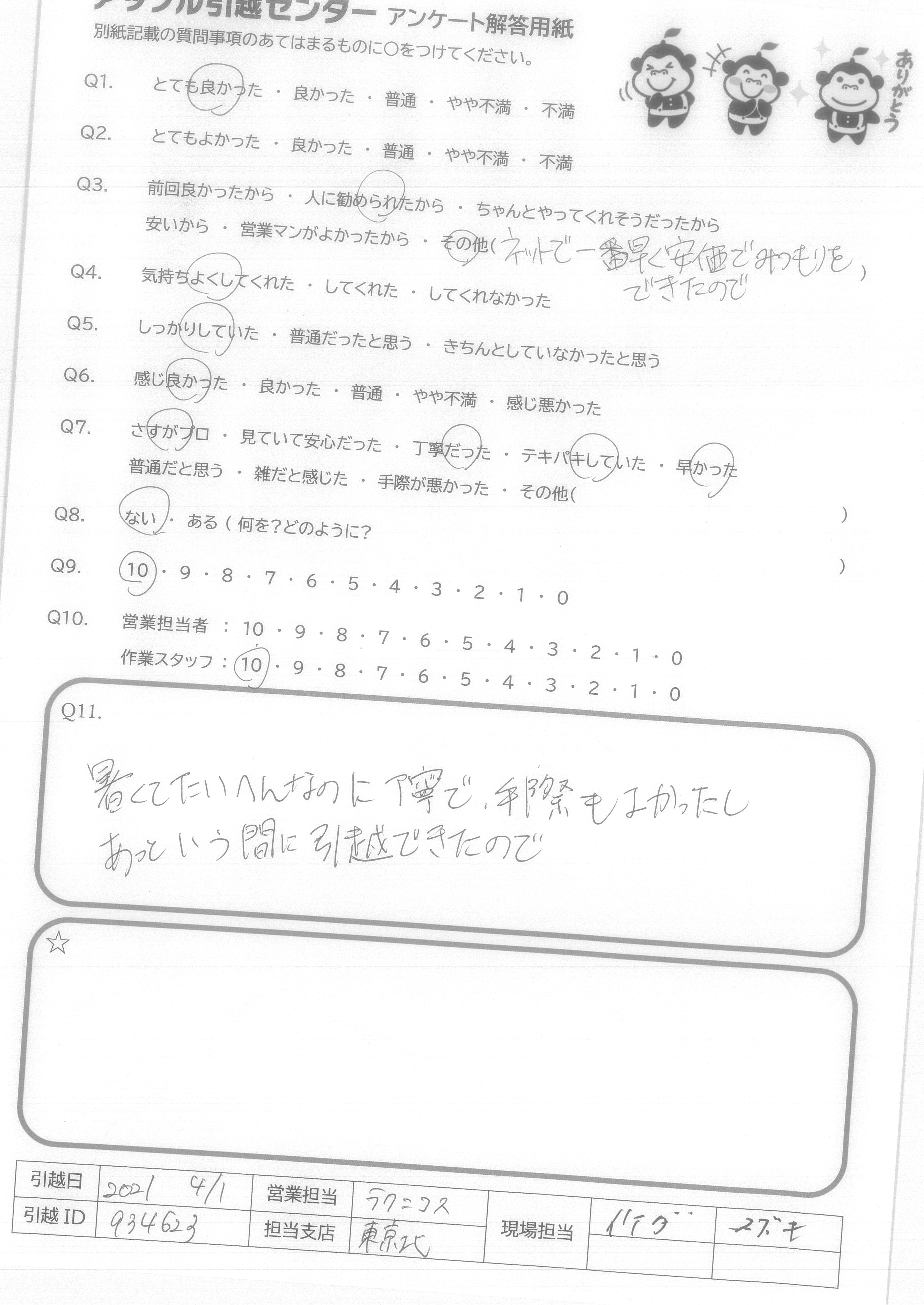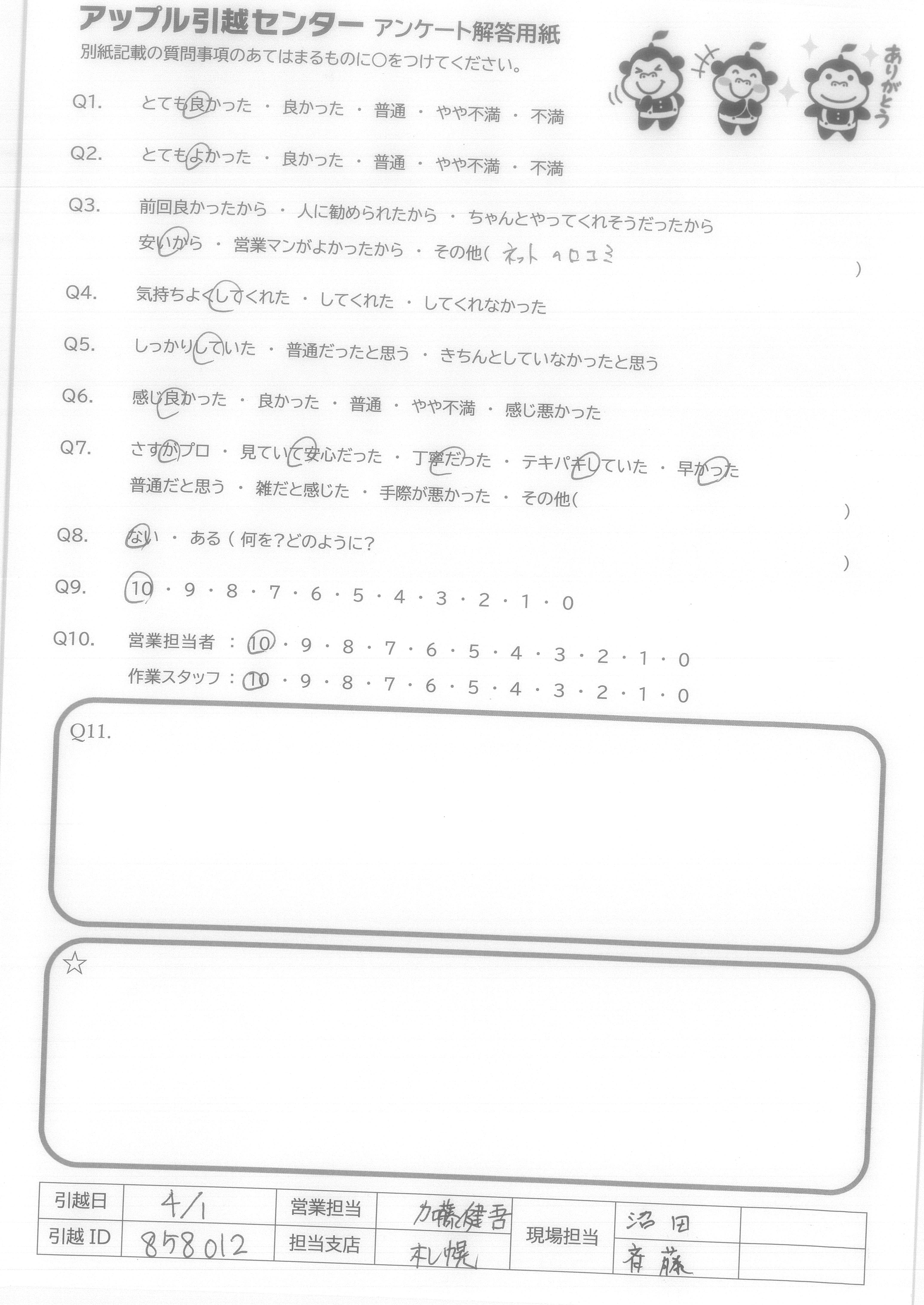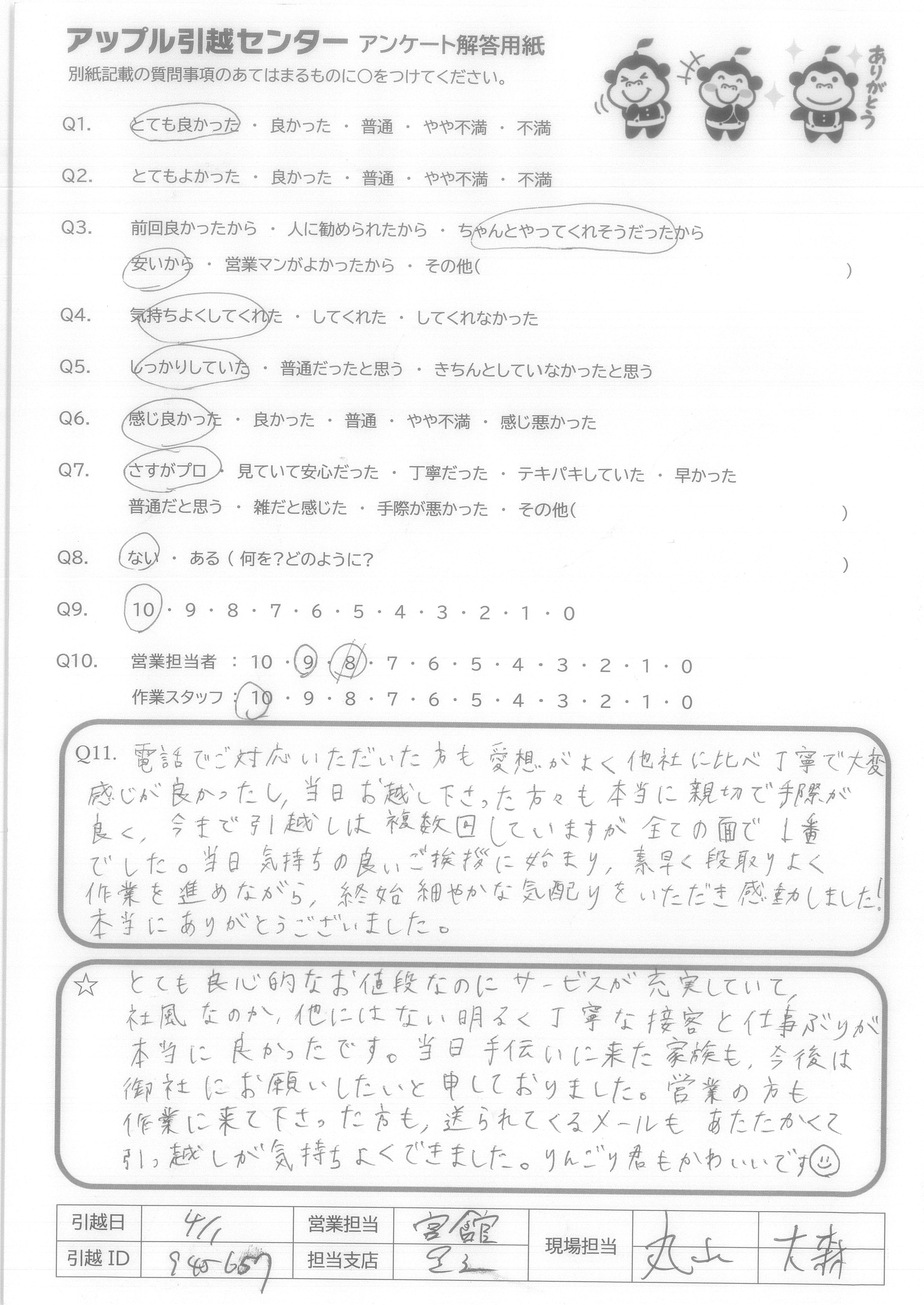 A.電話受付の亀水さん 対応の迅速さと真心感じる頼りになる確実な返答は安心感100点でした 段ボール引き取りの手配などアフターケアもお世話になり ありがとうございました。 現場のスタッフさん 三人共に元気でニコやかテキパキと運んで下さり人生の新しい出発の引越しには有難い方々でした 大久保さんの作業の指示もテキパキ! 大久保さんと山田さんが斉藤さんに優しく指導されていて斉藤さんもしっかり聞いてらして見ていて好感が待てました 御社の良い雰囲気が伝わって来ました 段ボールを引き取りに来てくださった方々も本当に感じの良い方々でした ありがとうございました